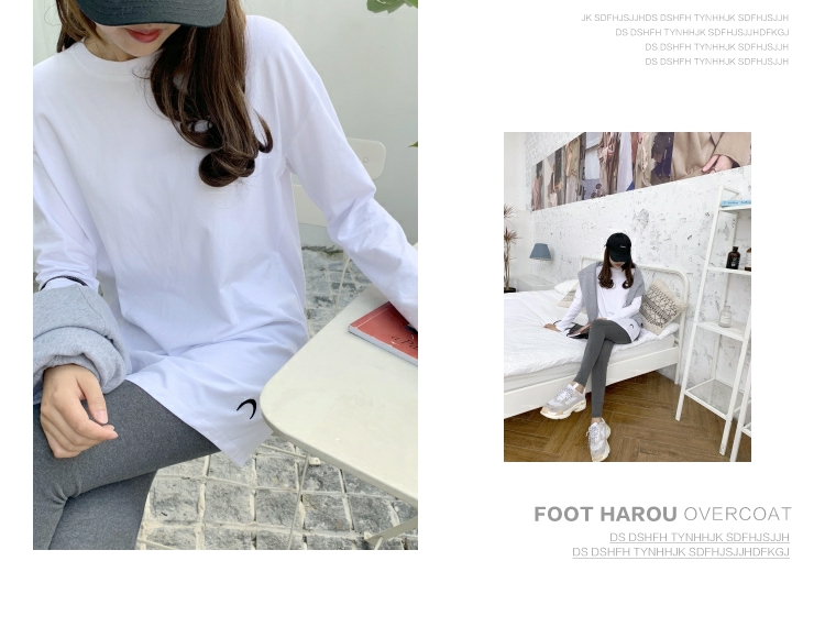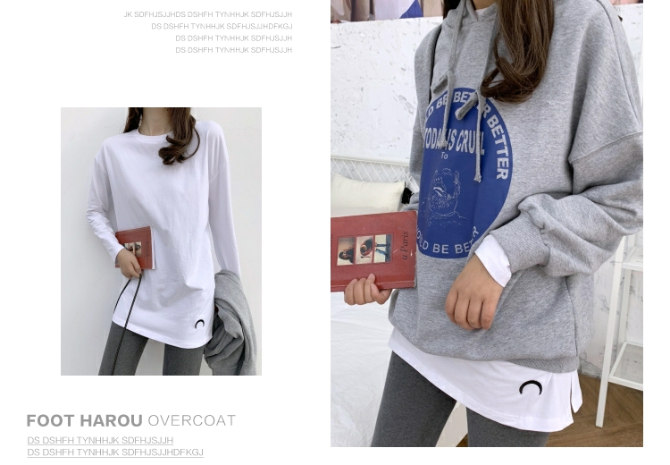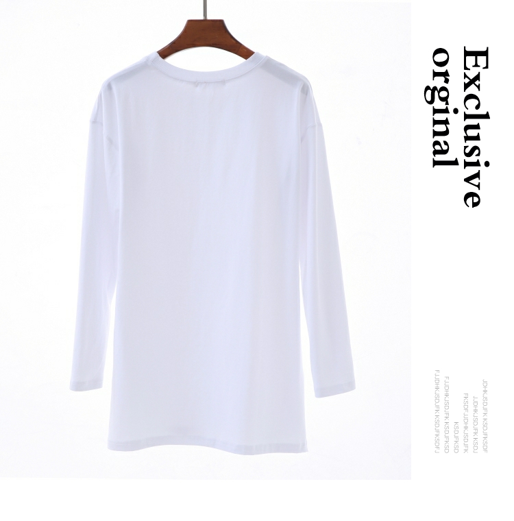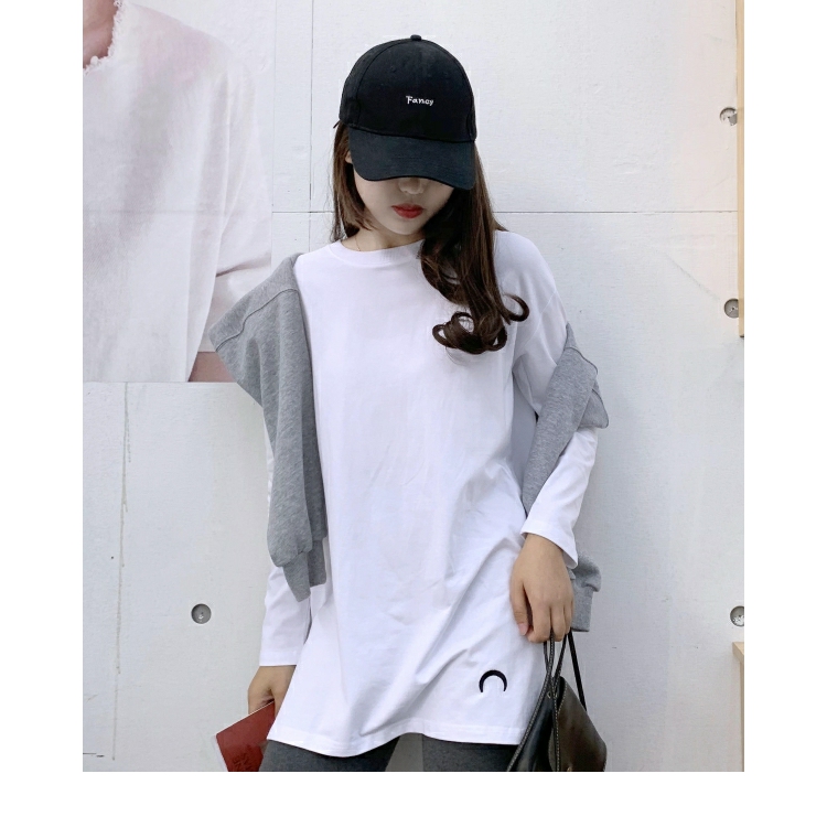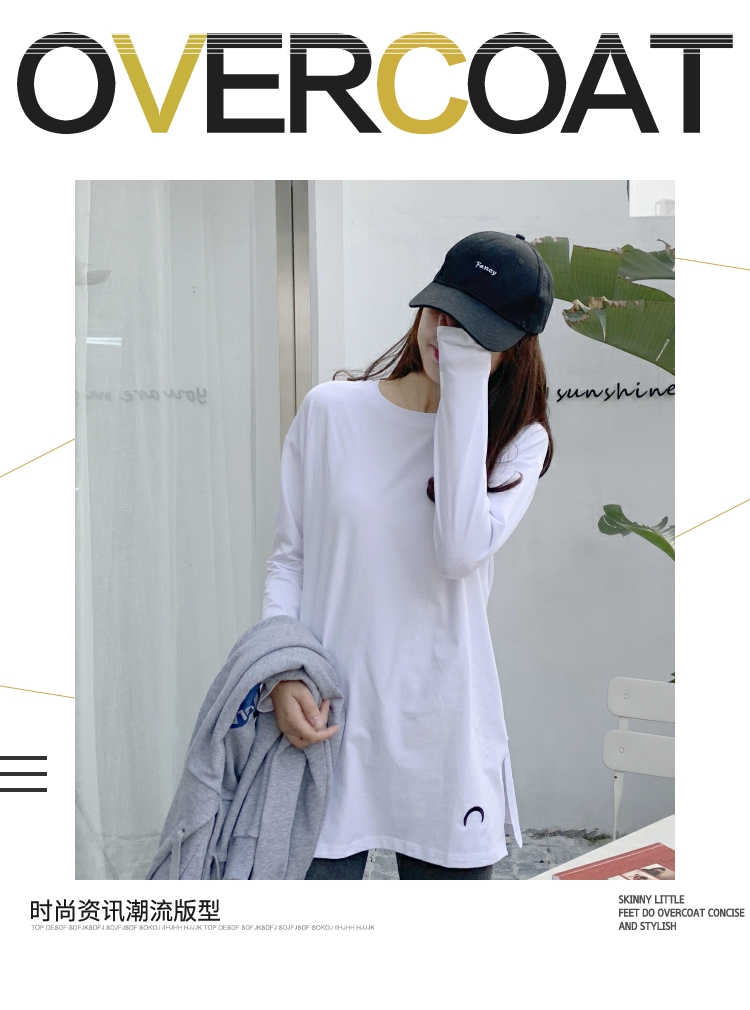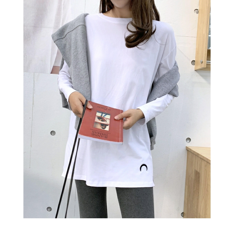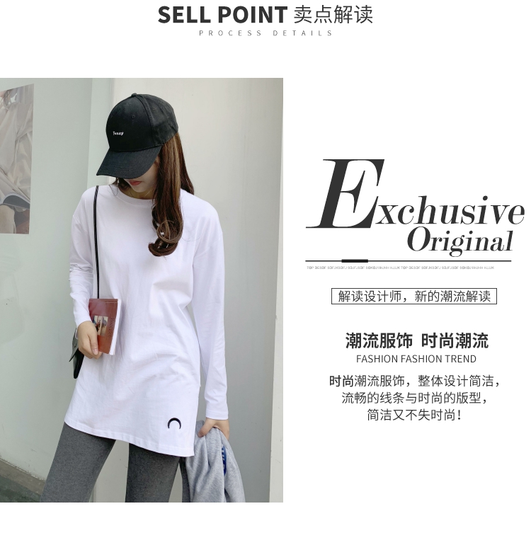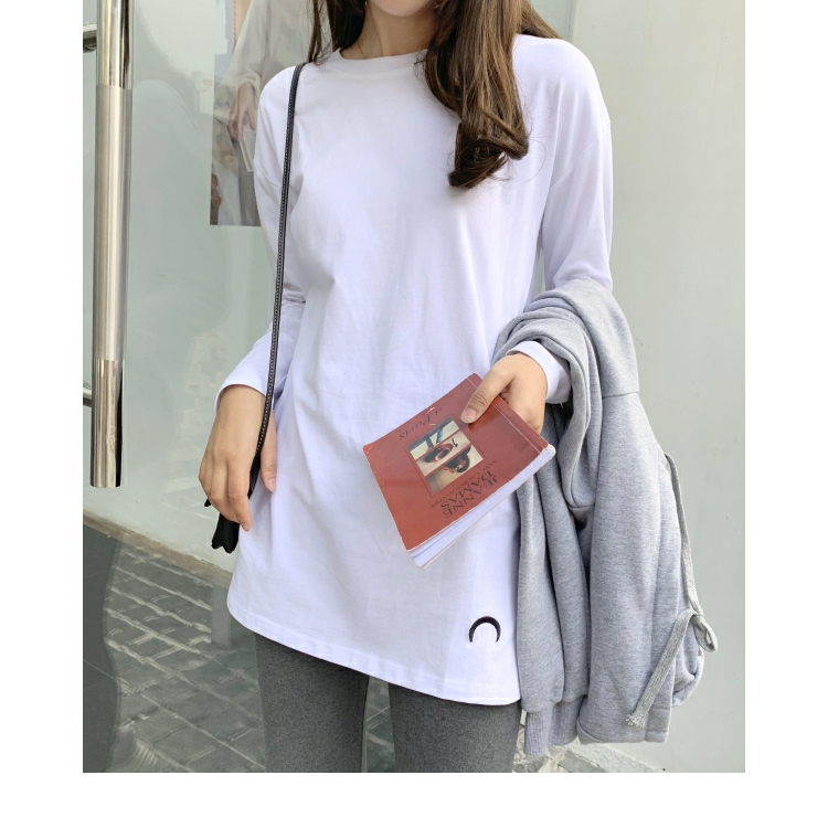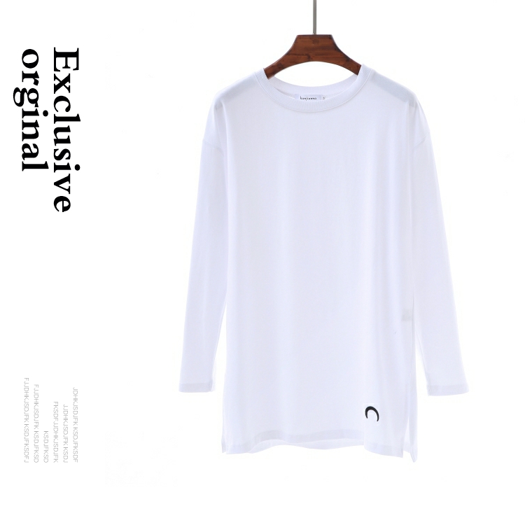 2019春秋裝新款月亮刺繡中長款T恤女長袖大碼寬松內搭打底衫純棉
