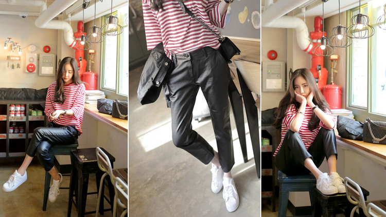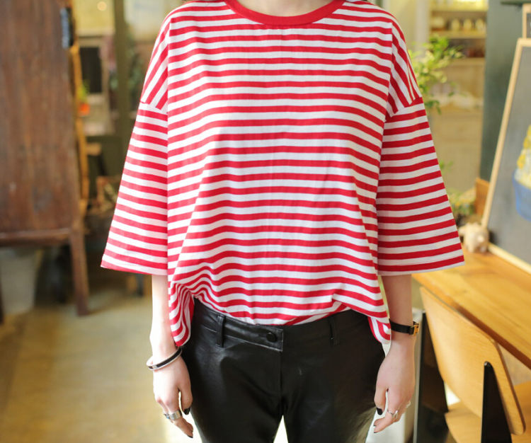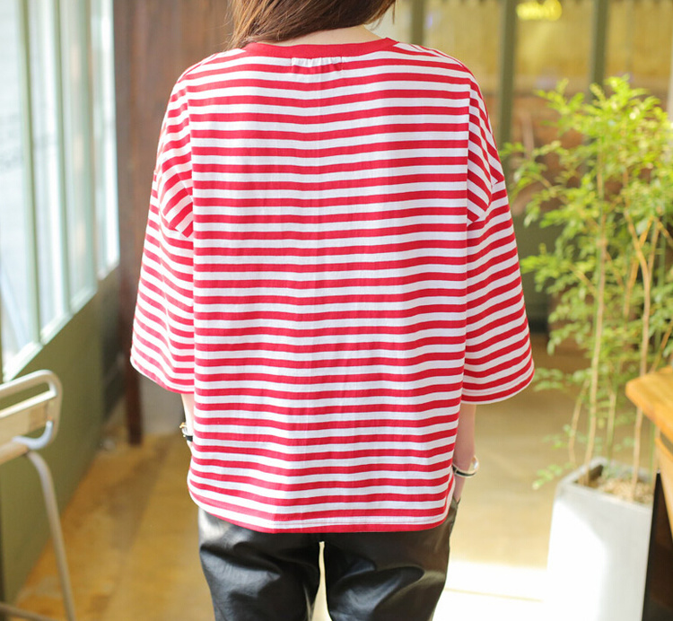 2019春裝半袖新款韓國夏裝圓領七分袖紅白條紋寬松大碼短袖T恤女