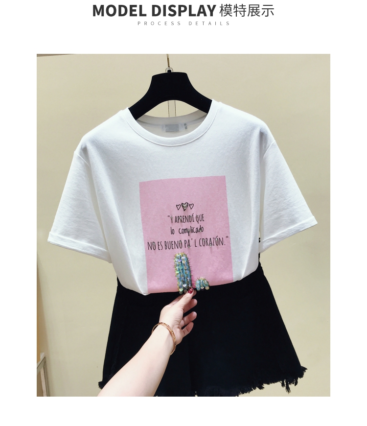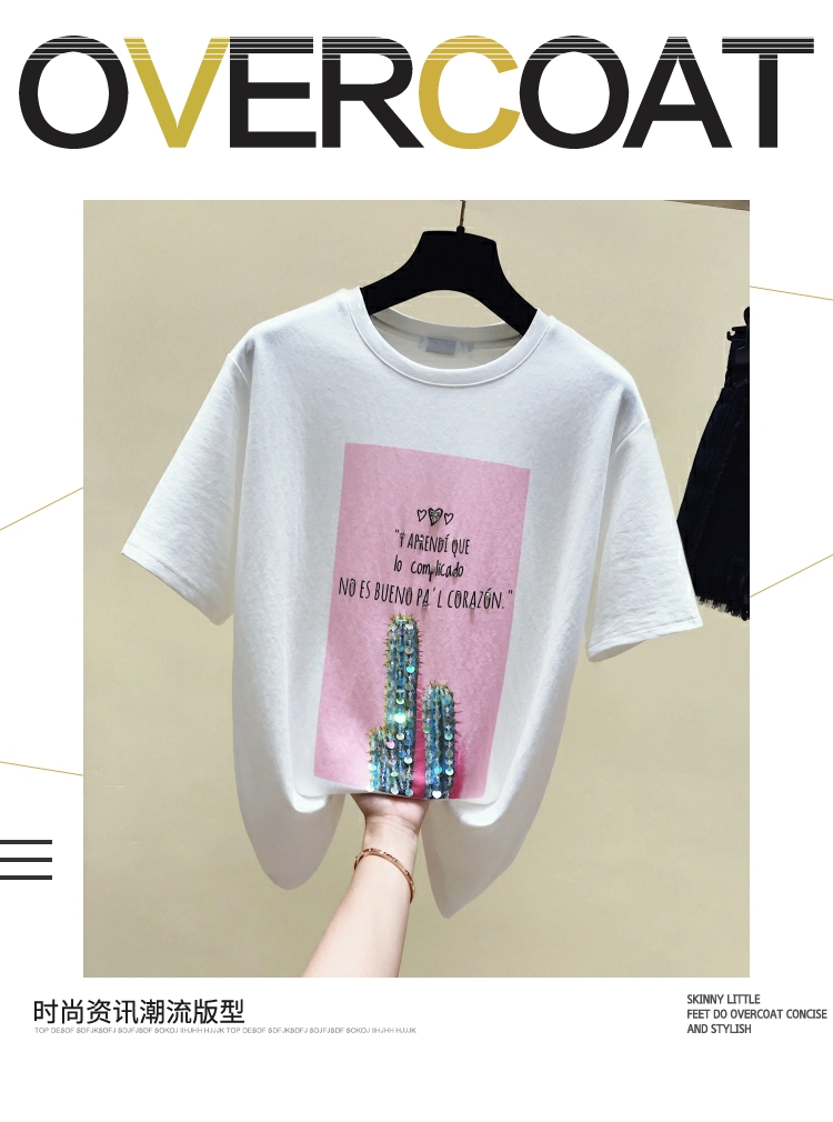 2019夏裝新款仙人掌字母印花棉T恤女韓版ins短袖釘珠亮片打底上衣