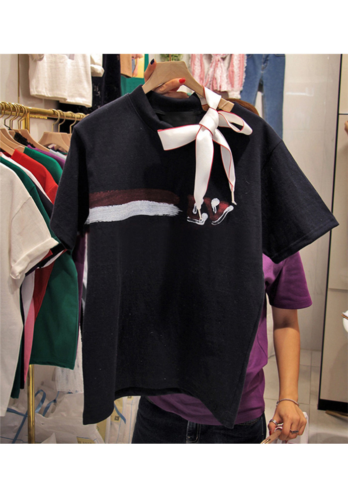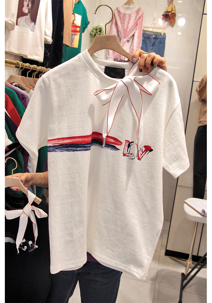 蝴蝶結上衣短袖T恤女2019夏季新款休閑百搭半袖純棉圓領打底衫潮