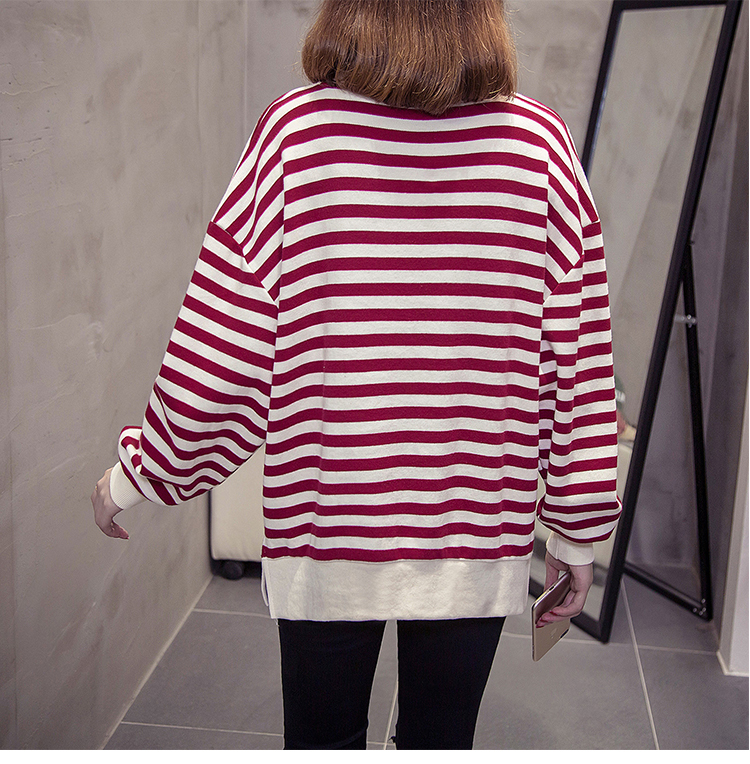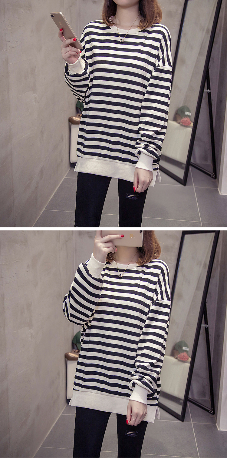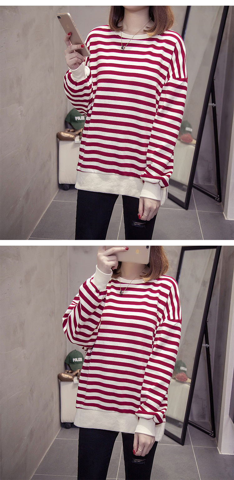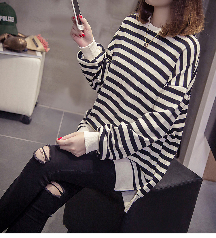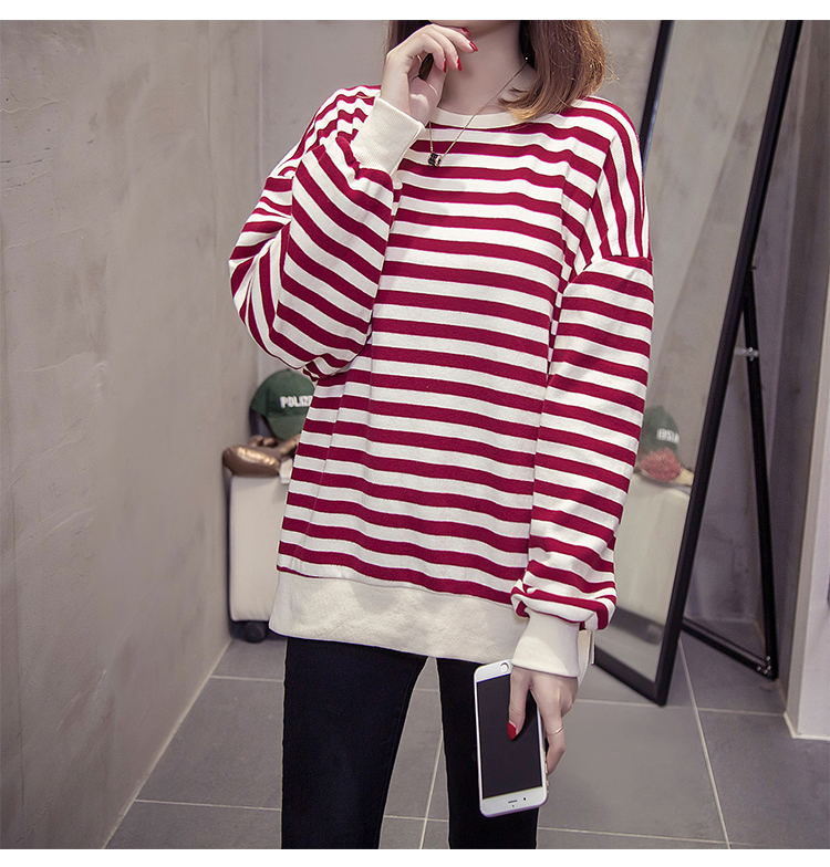 2019早春新款韓版寬松大碼條紋衛衣百搭純棉長袖針織T恤女加厚