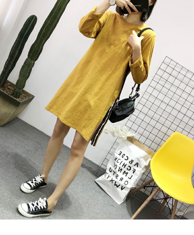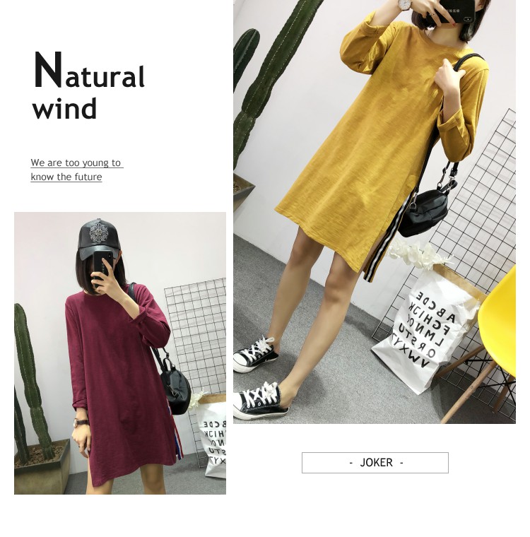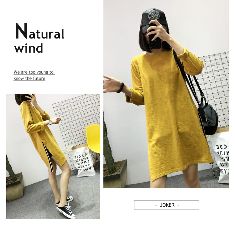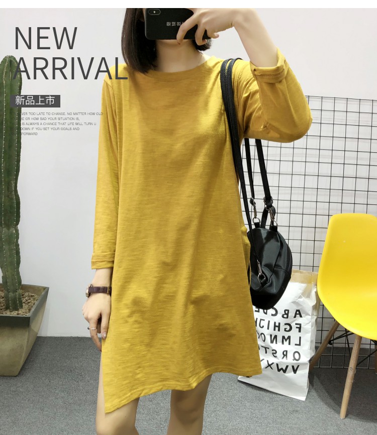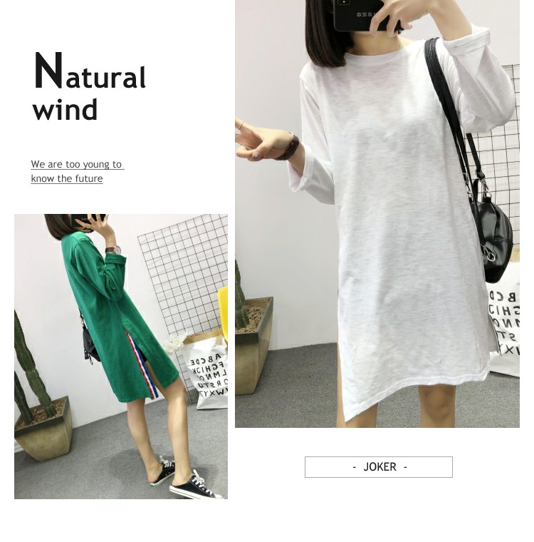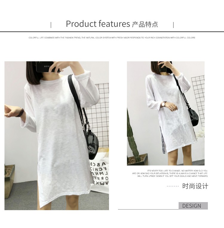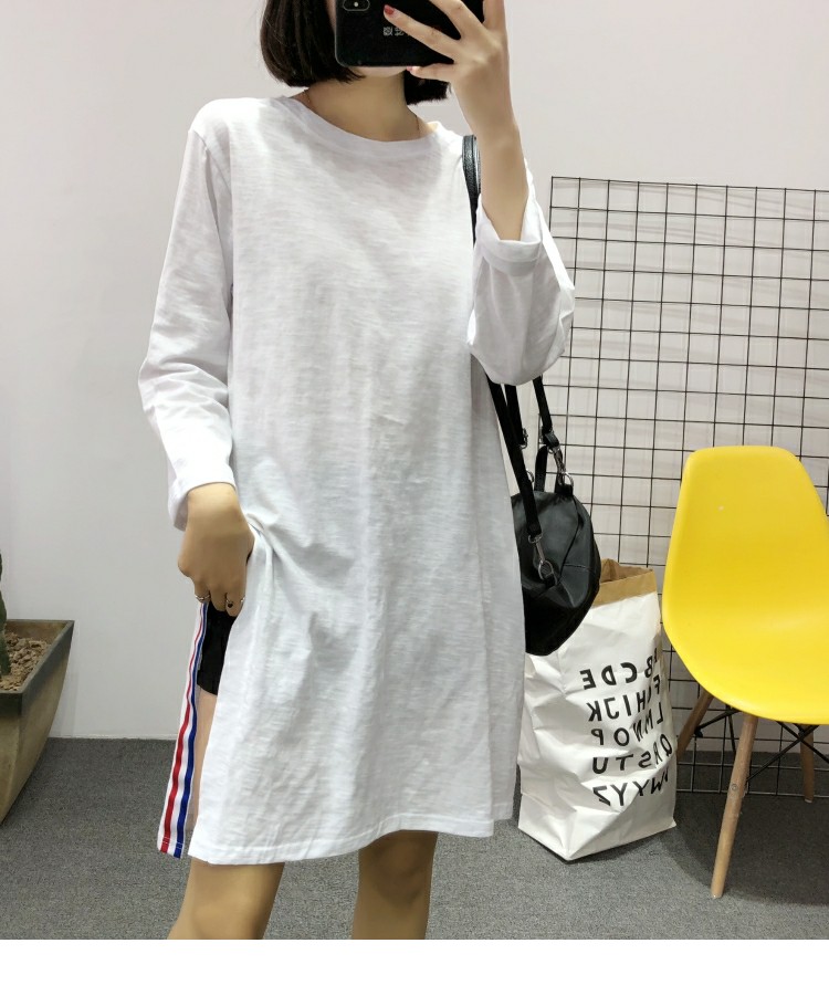 2019春秋裝新款竹節棉長袖T恤女中長款韓版寬松白色上衣開叉韓國