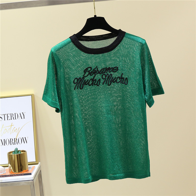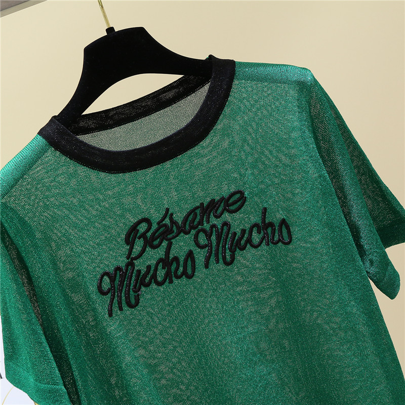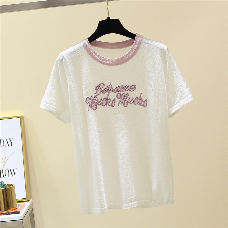 2019夏裝新款韓版亮絲針織衫字母刺繡T恤女紫色短袖薄款冰絲上衣