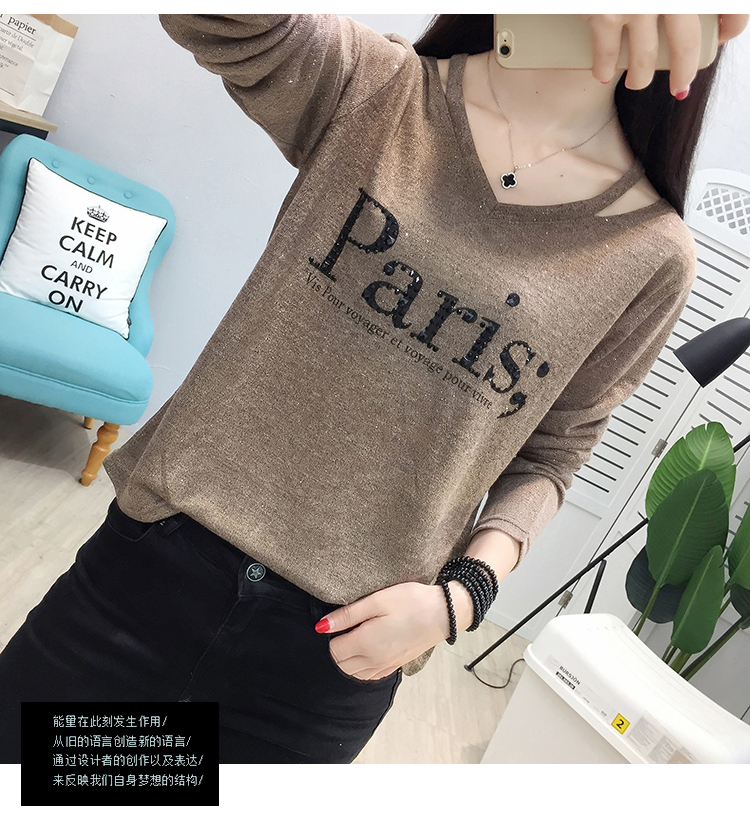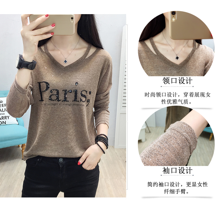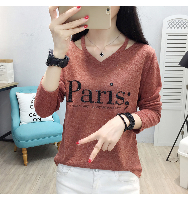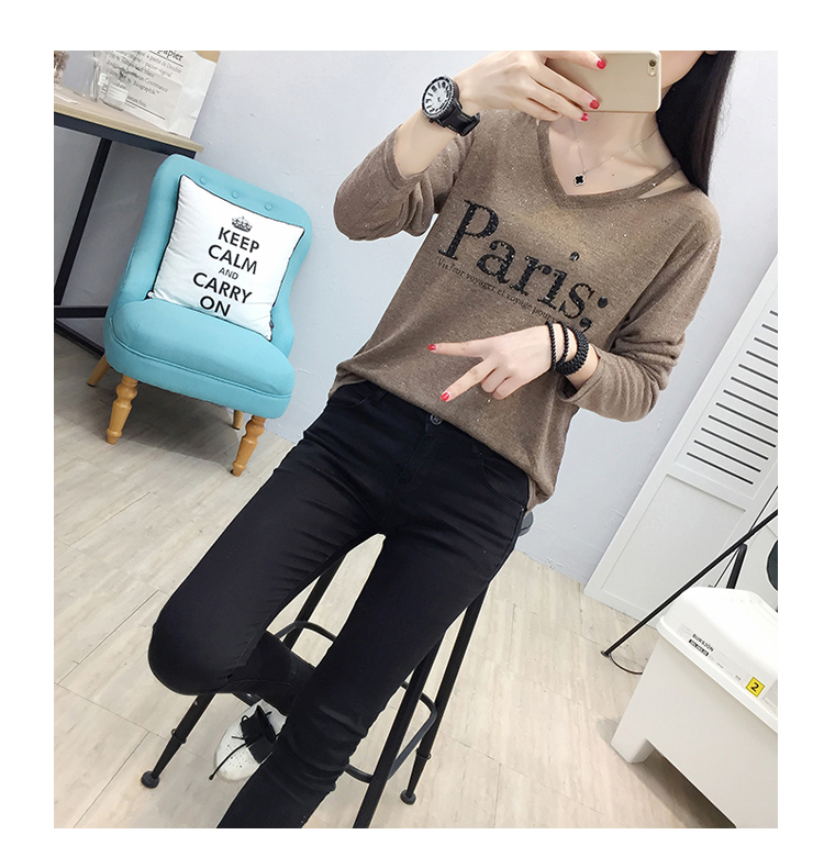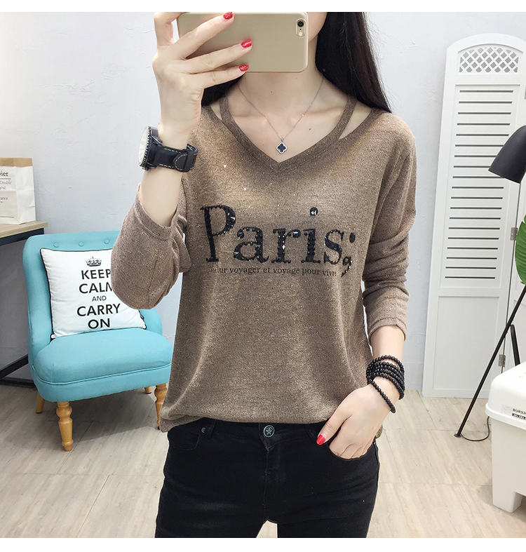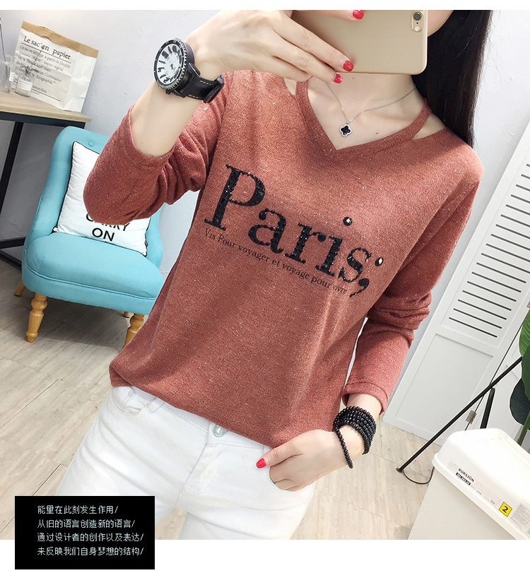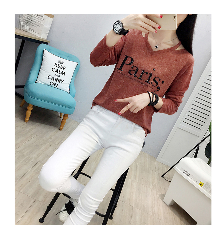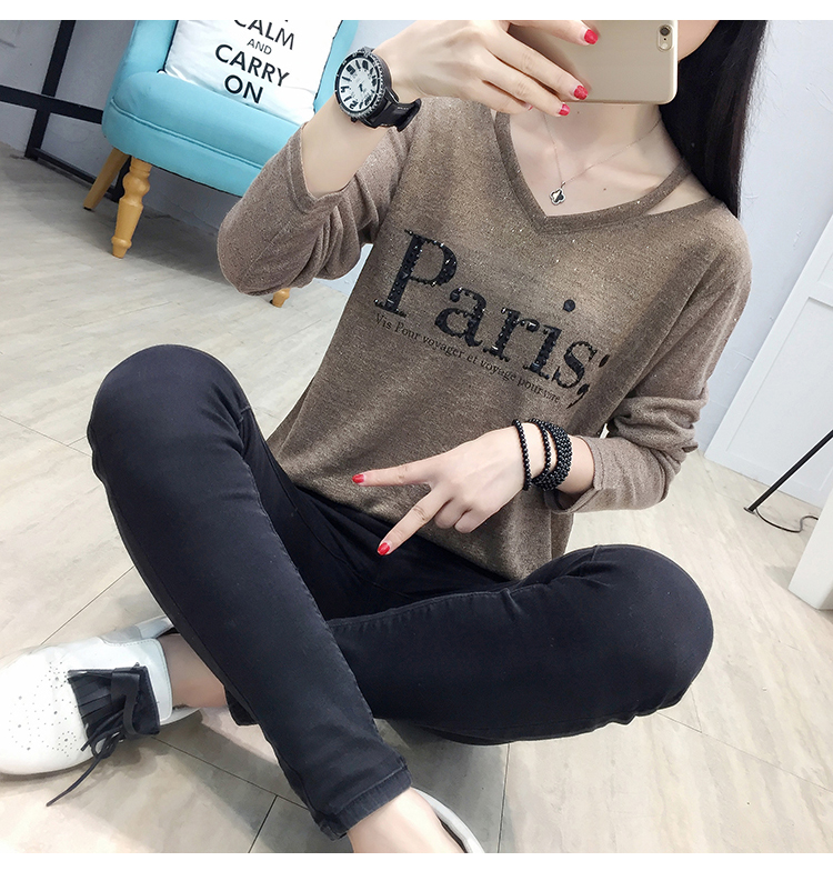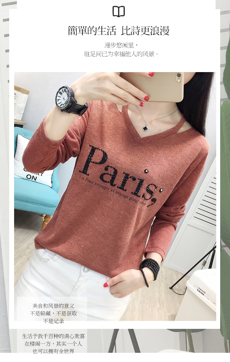 韓版冰絲長袖t恤女春秋新款寬松v領字母印花上衣百搭顯瘦打底衫潮