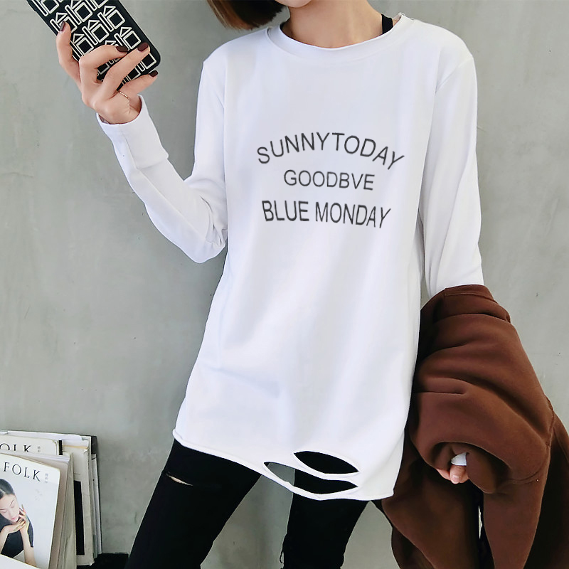 2019春秋裝新款下擺破洞春季T恤女寬松中長款衣服打底衫長袖上衣