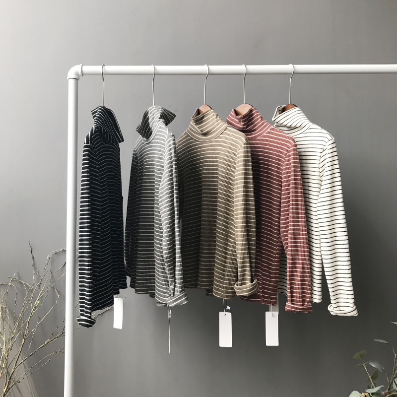 2018秋冬新款韓版條紋學生百搭長袖T恤女寬松高領針織打底衫上衣