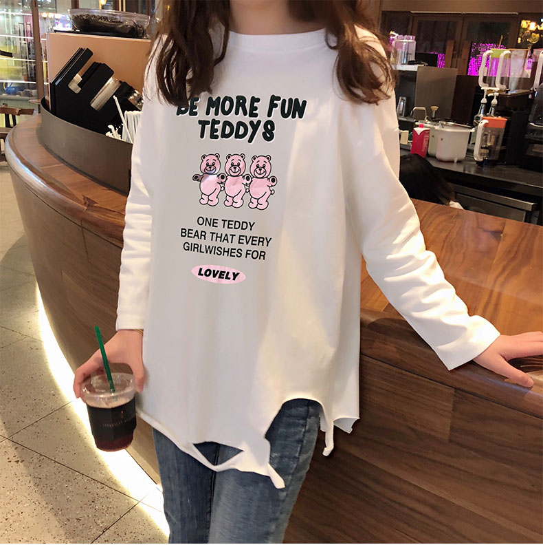 中長款白色T恤女2019春裝新款寬松小豬印花下擺破洞長袖體恤上衣