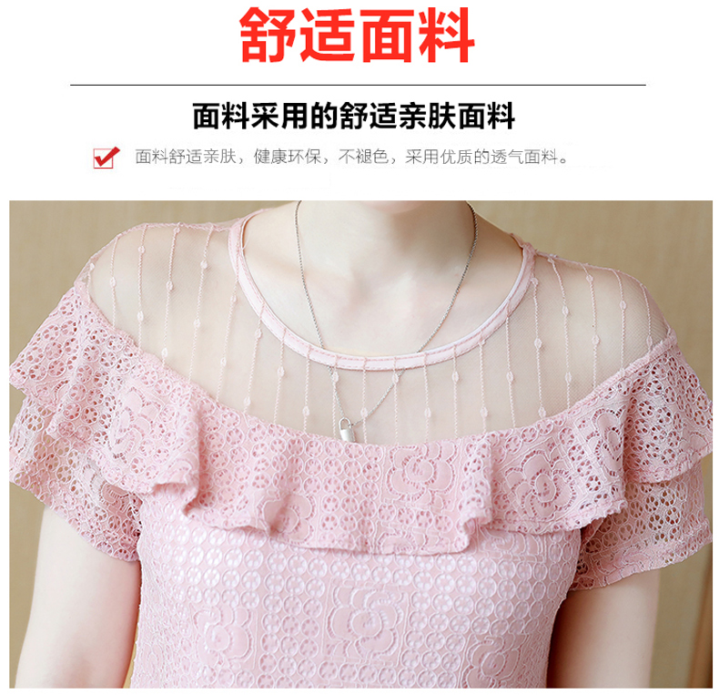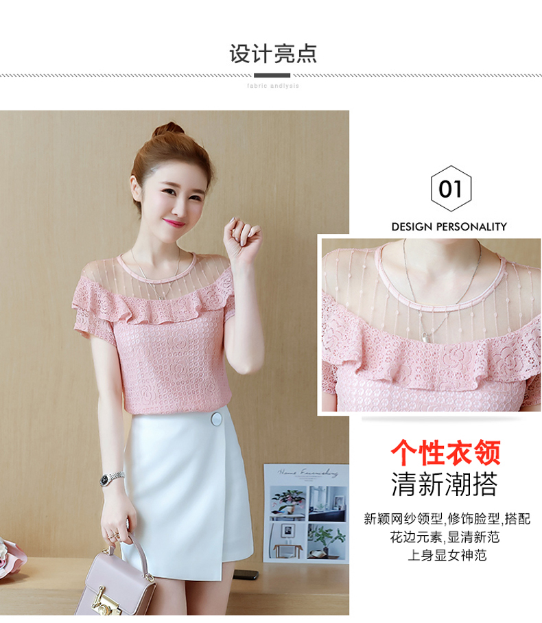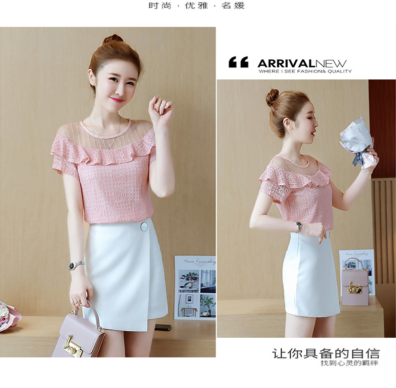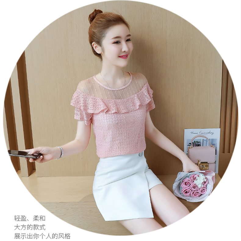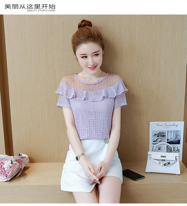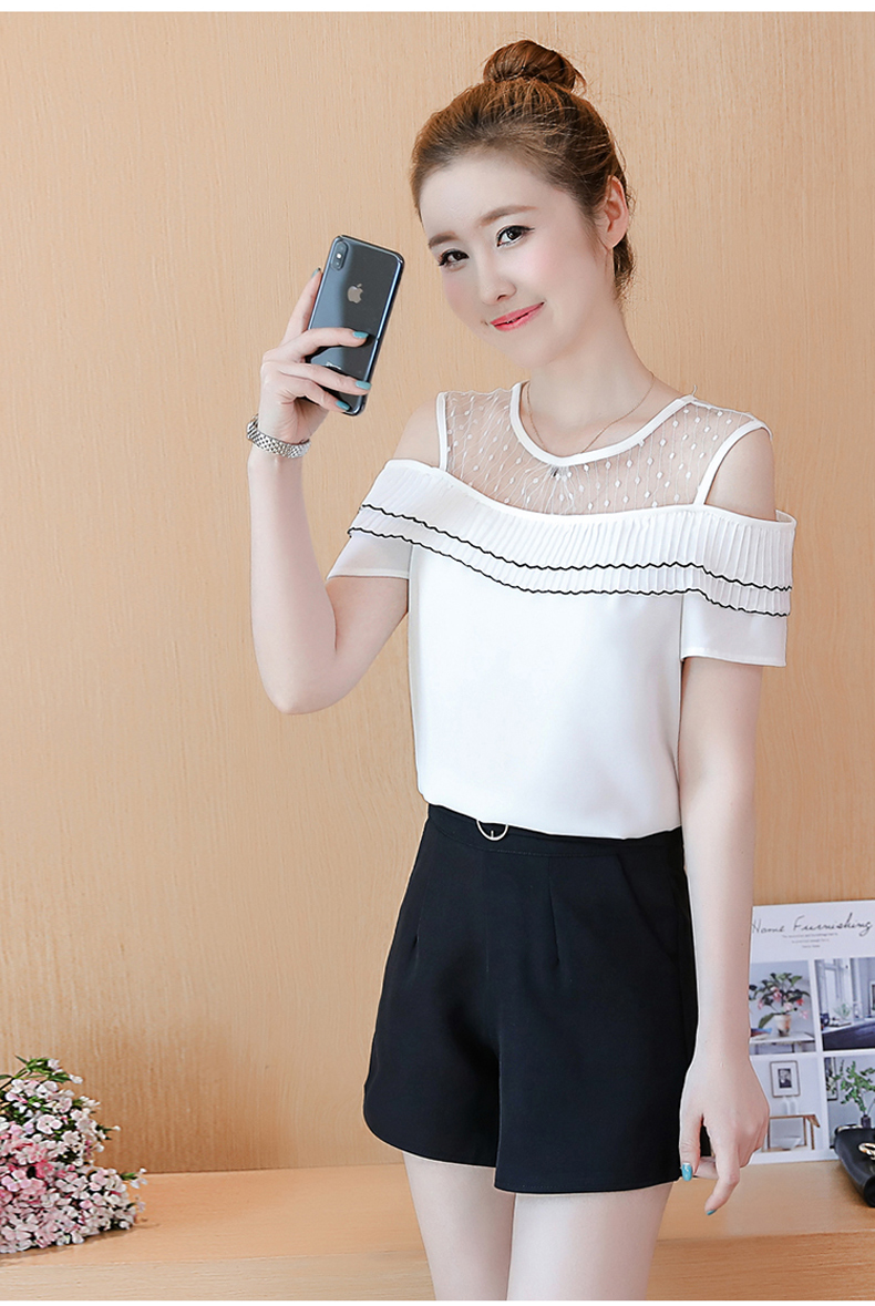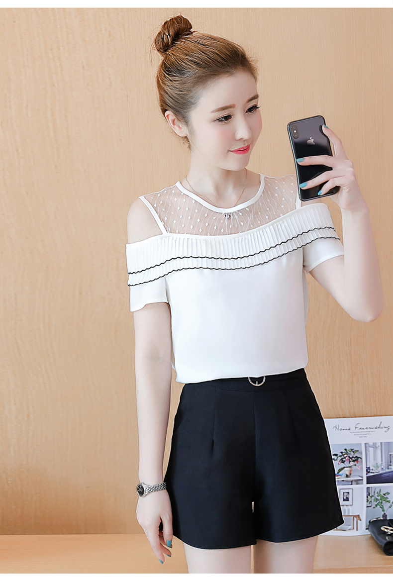 雪紡衫女短袖2019新款夏裝飄逸上衣超仙甜美洋氣露肩網紗上衣蕾絲