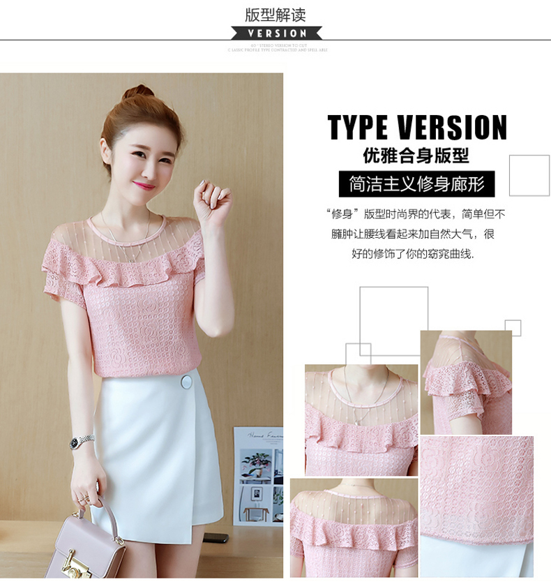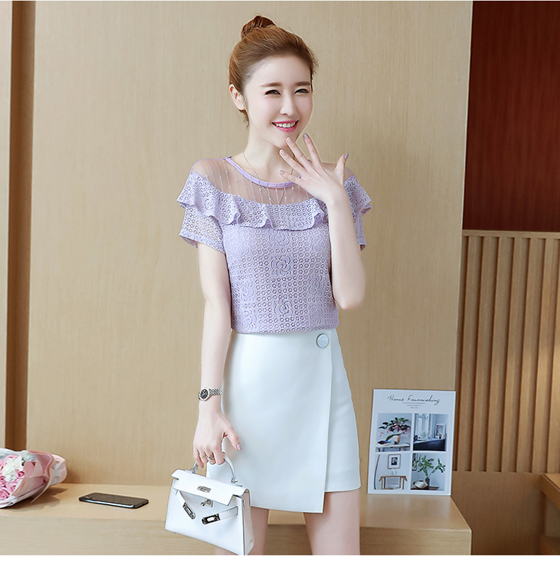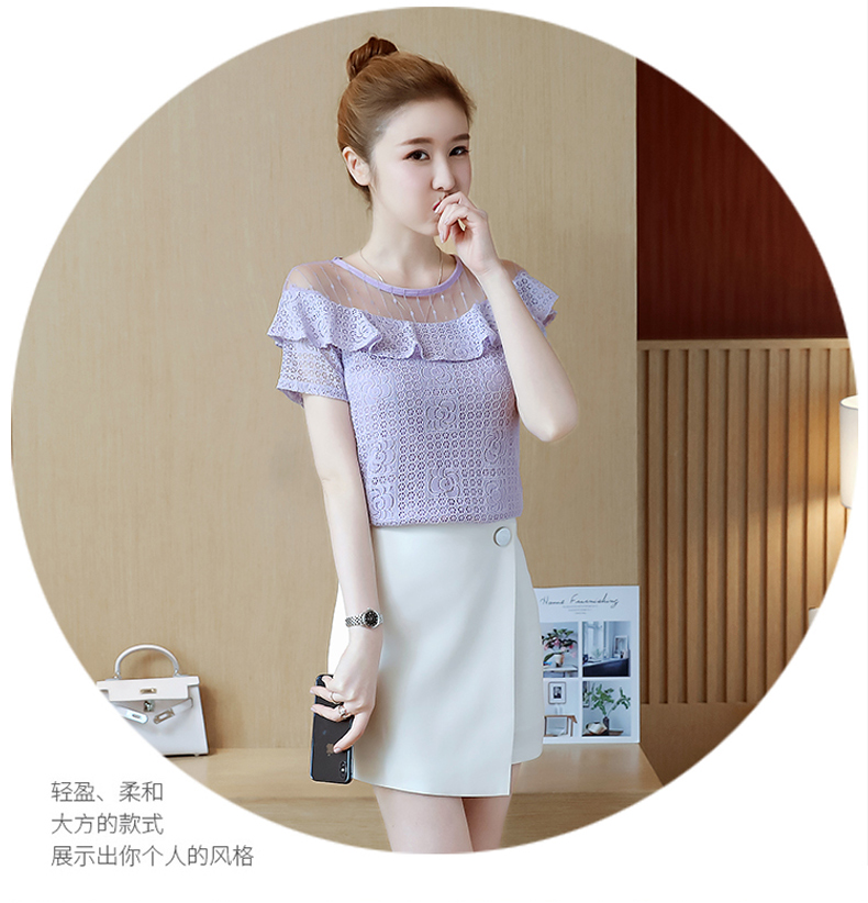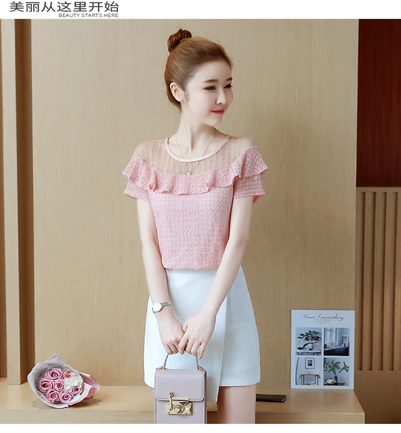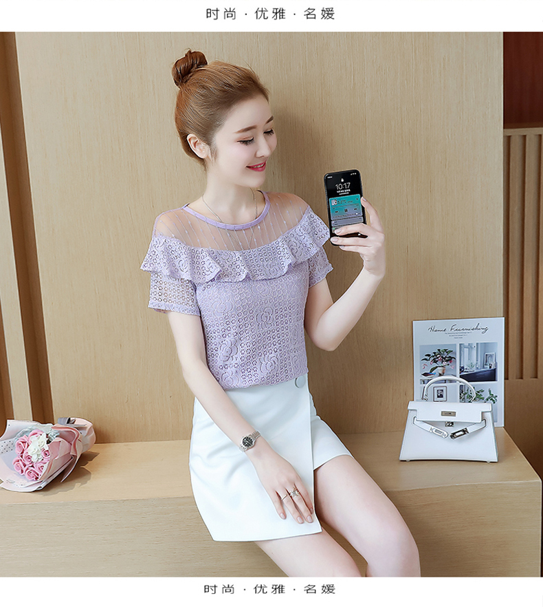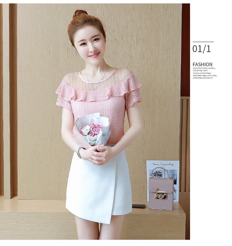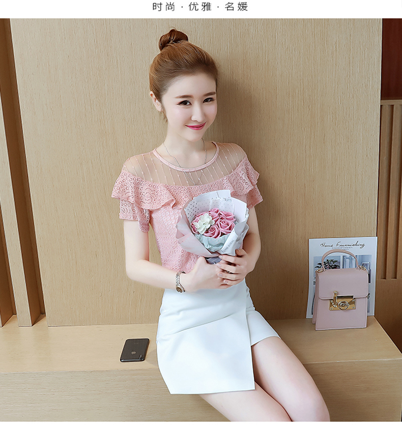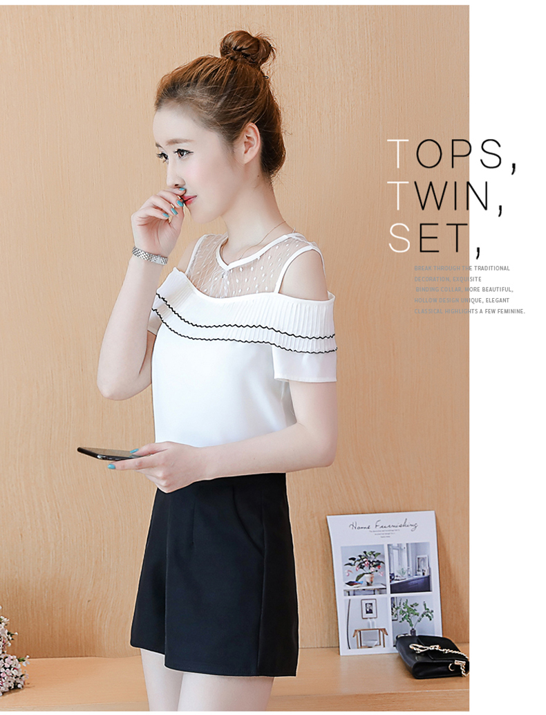 雪紡衫女短袖2019新款夏裝飄逸上衣超仙甜美洋氣露肩網紗上衣蕾絲