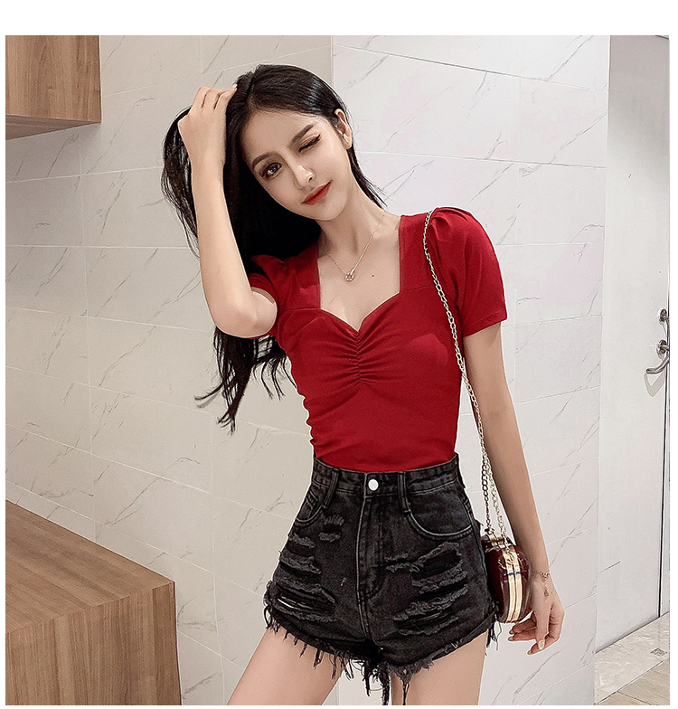 2019夏季網紅性感修身顯瘦短款方領短袖T恤女百搭氣質復古上衣潮