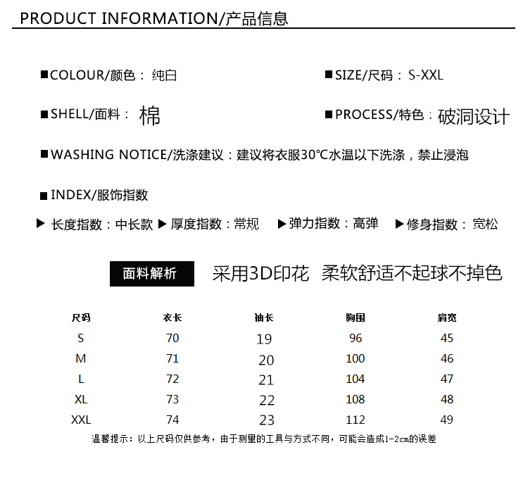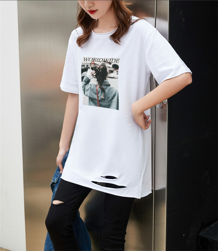 2019夏季新款短袖白色t恤女ins寬松下擺破洞中長款純棉體恤上衣服