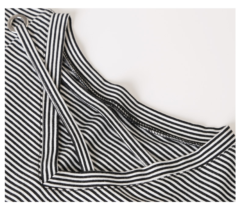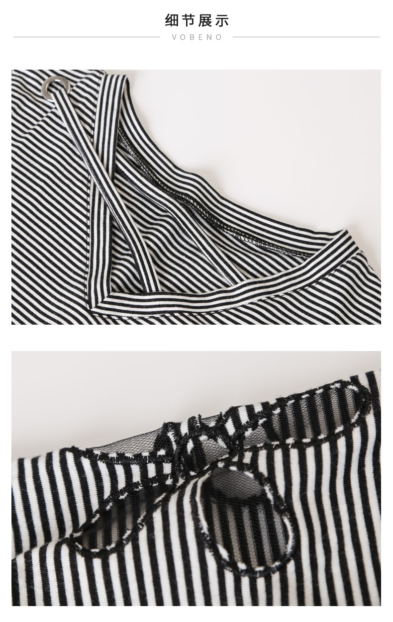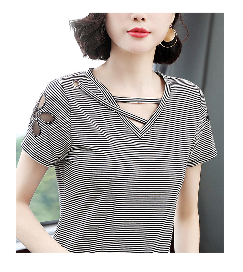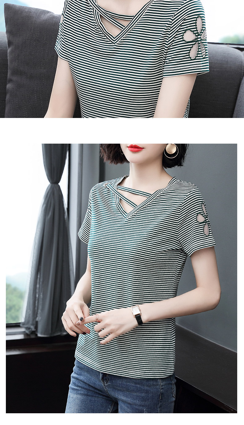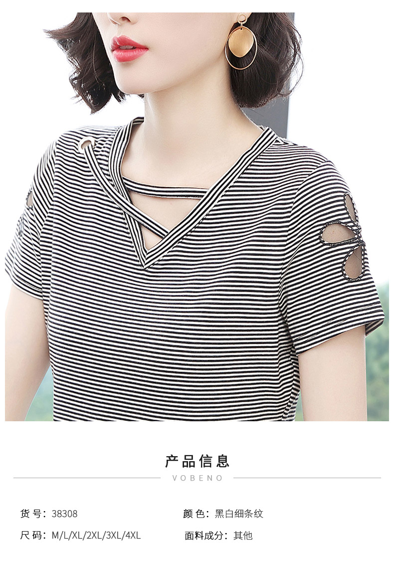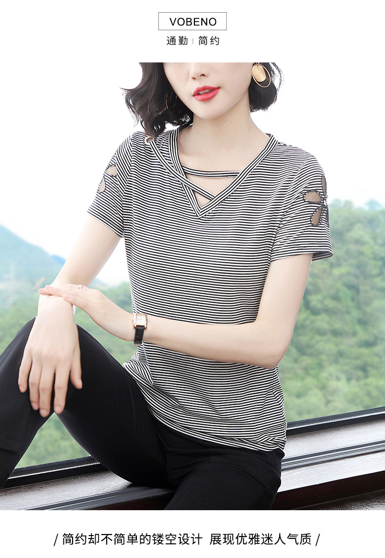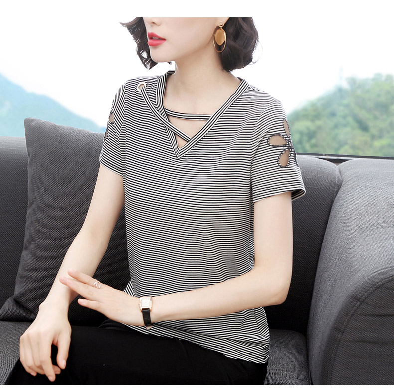 2019新款女裝黑白細條紋t恤女V領體恤鏤空超火cec短袖夏季上衣潮