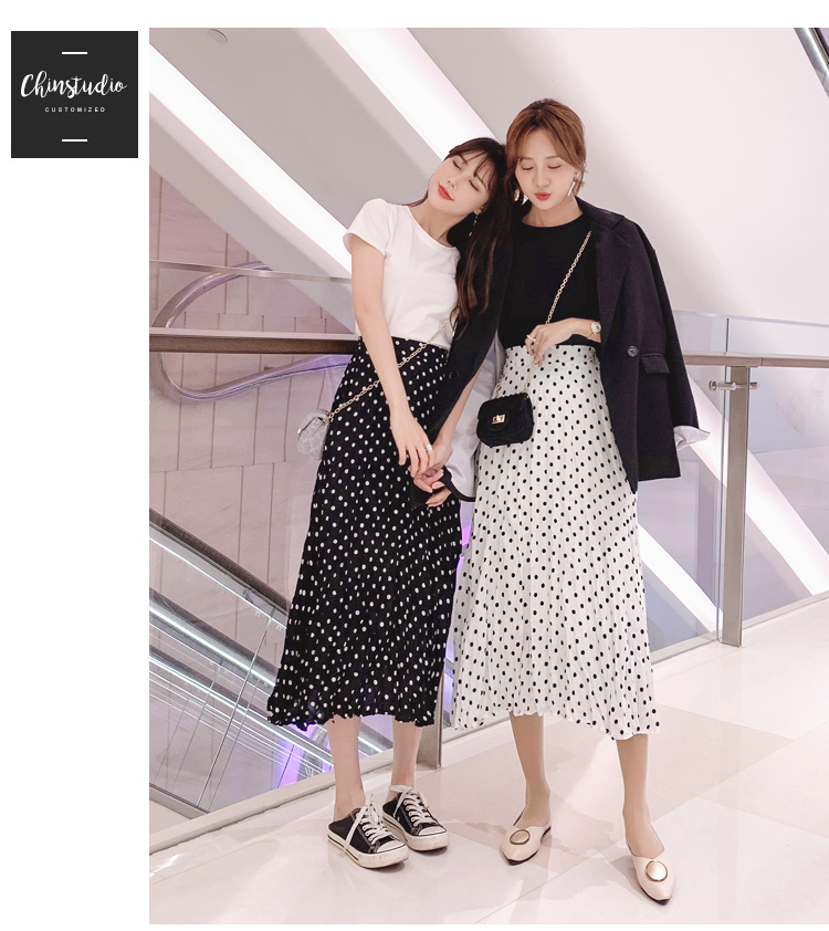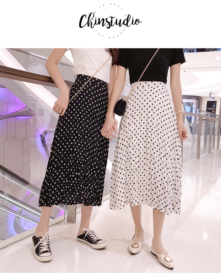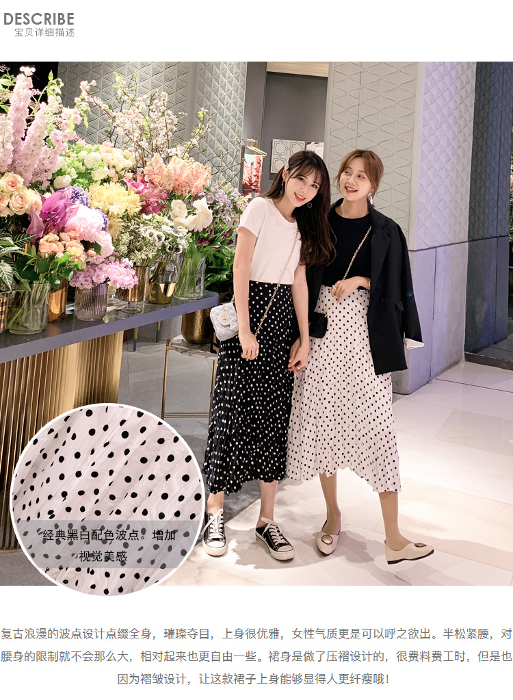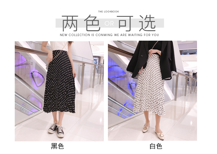 2019新款波點中長款雪紡a字壓褶高腰半身裙女適合胯大腿粗的裙子