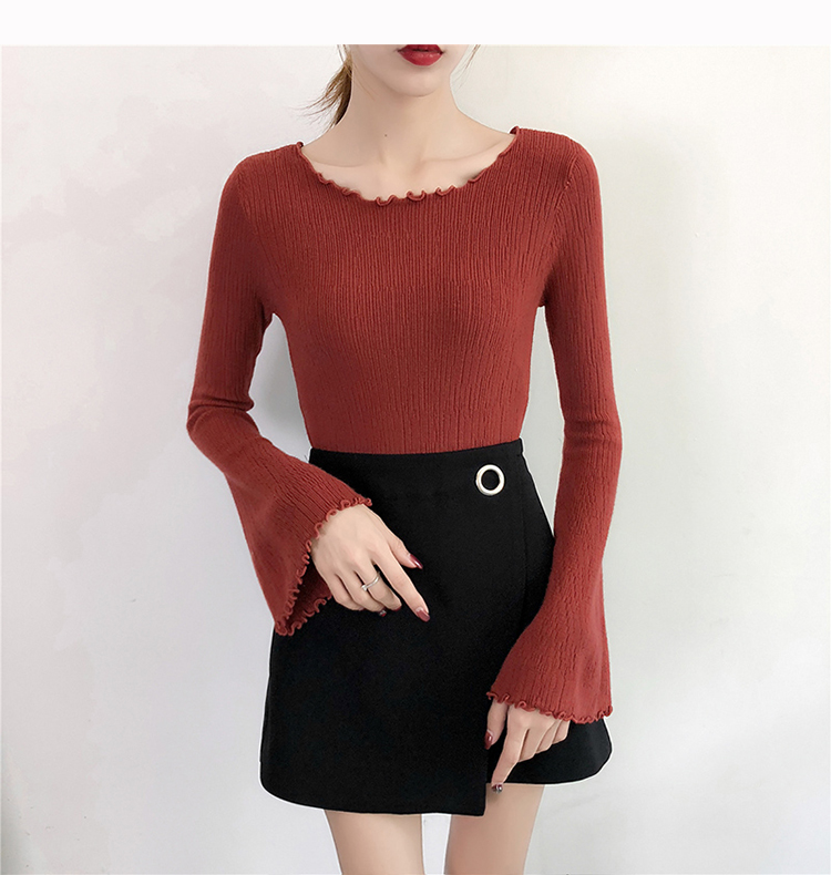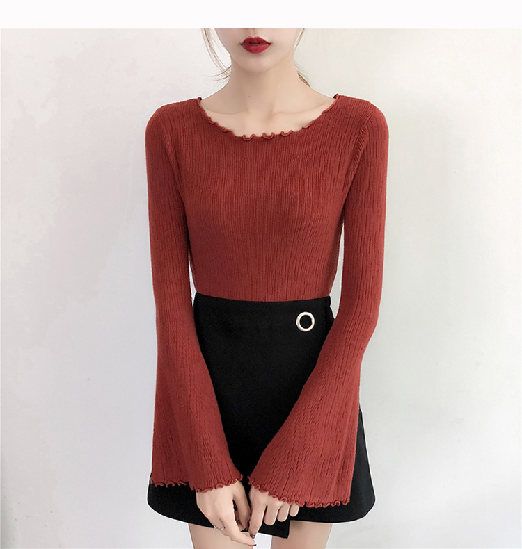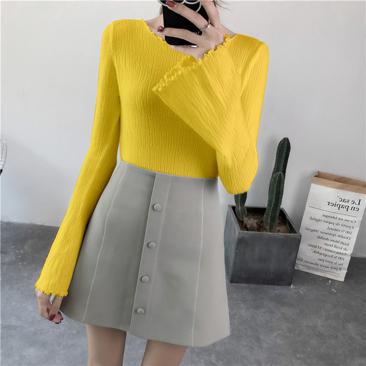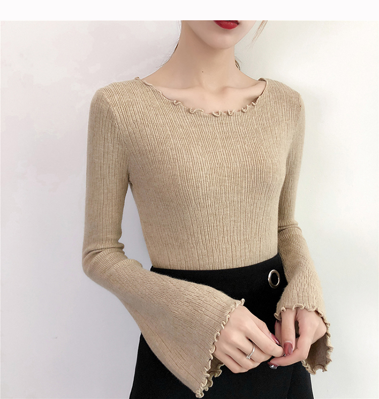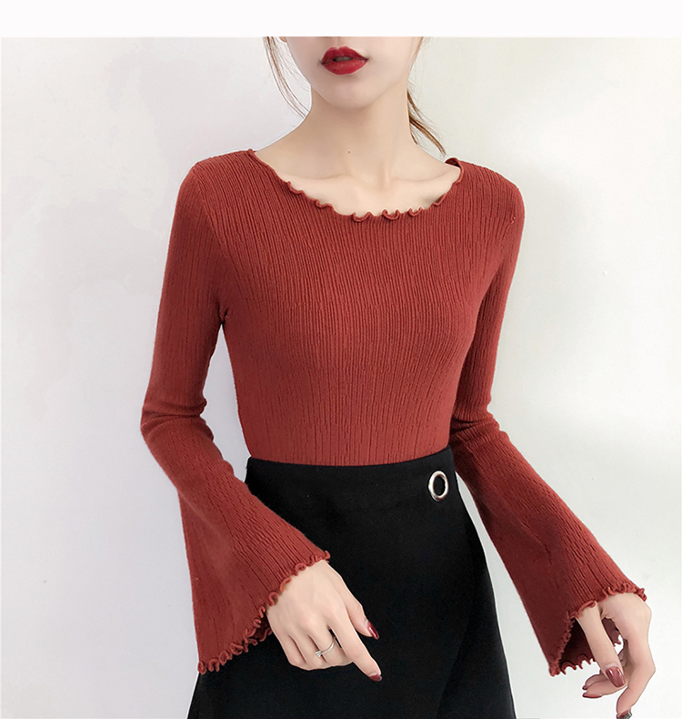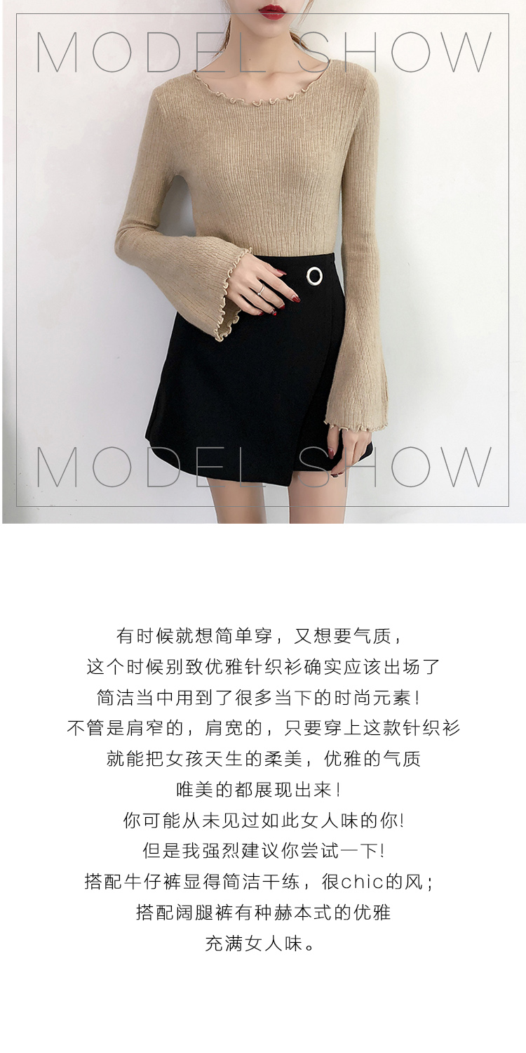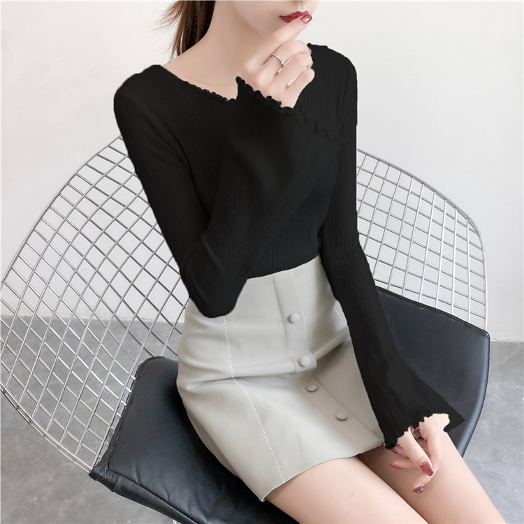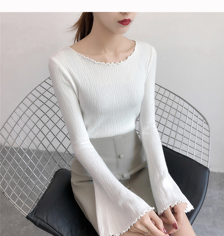 2019春裝新款韓版木耳邊喇叭袖針織衫修身t恤女長袖打底衫上衣服