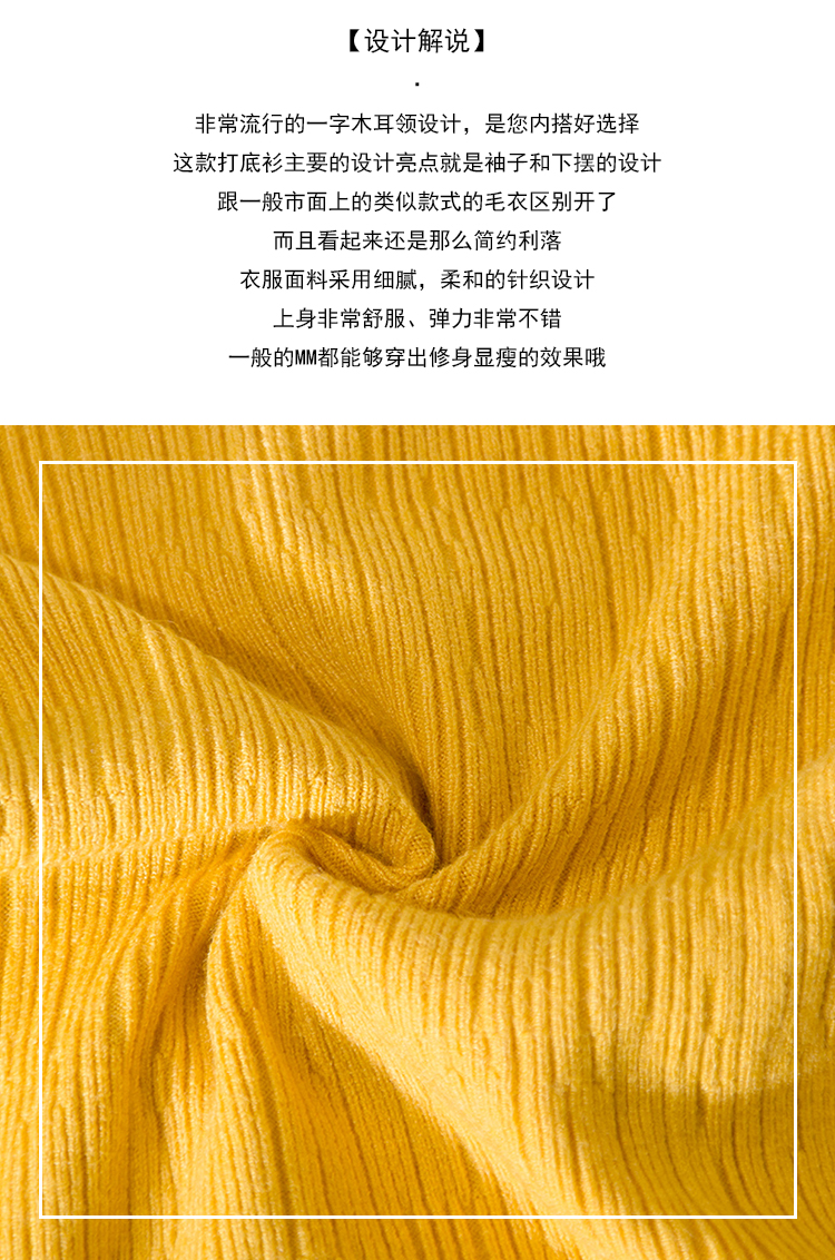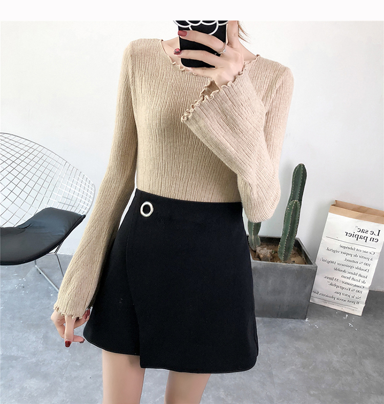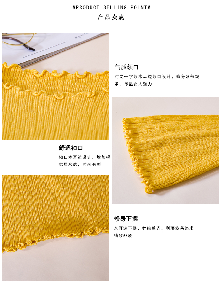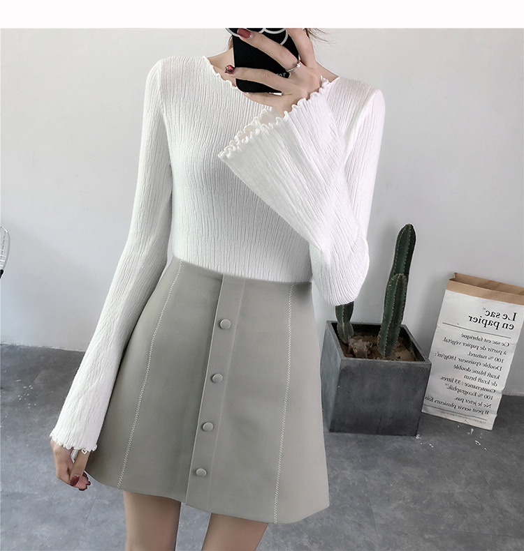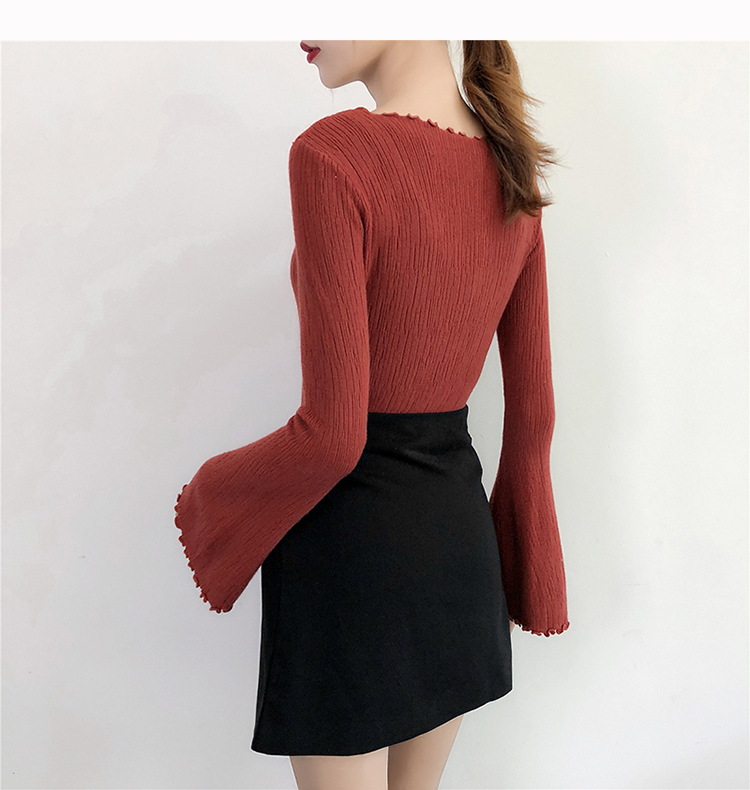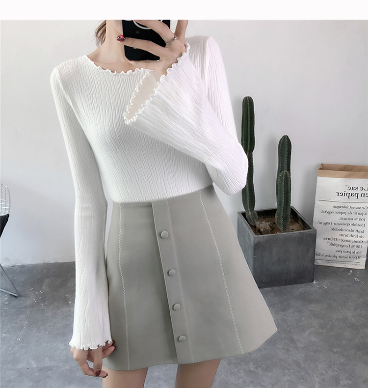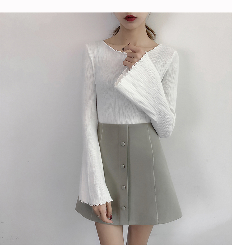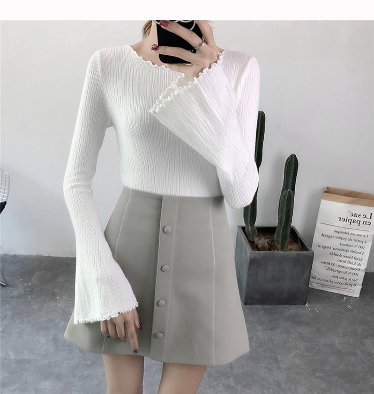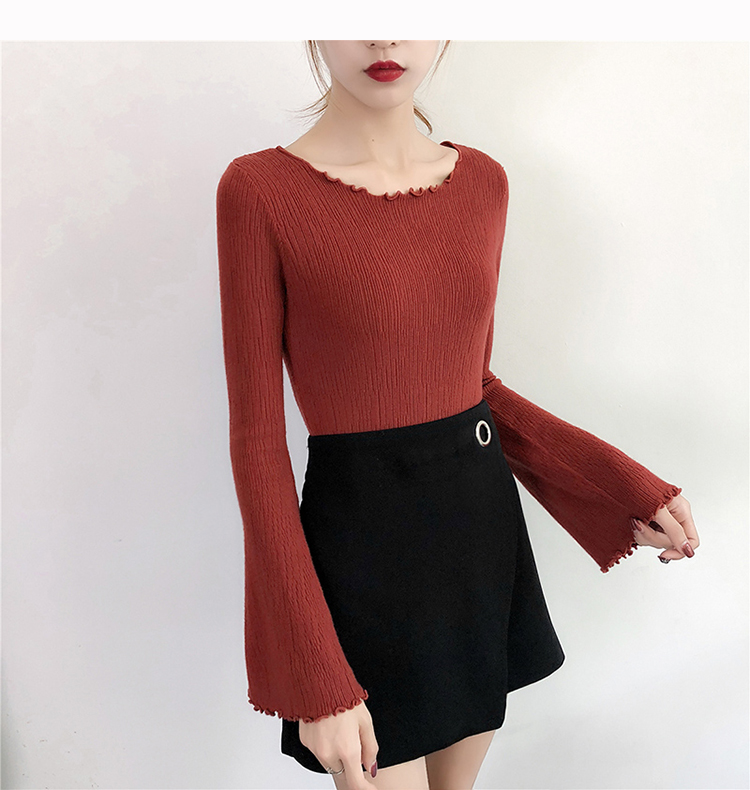 2019春裝新款韓版木耳邊喇叭袖針織衫修身t恤女長袖打底衫上衣服