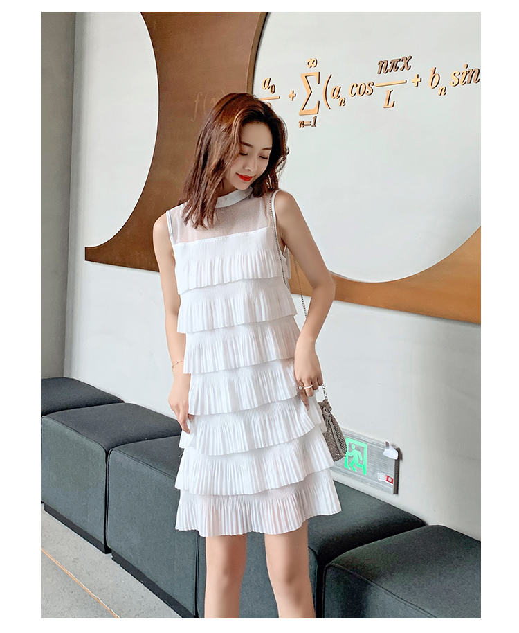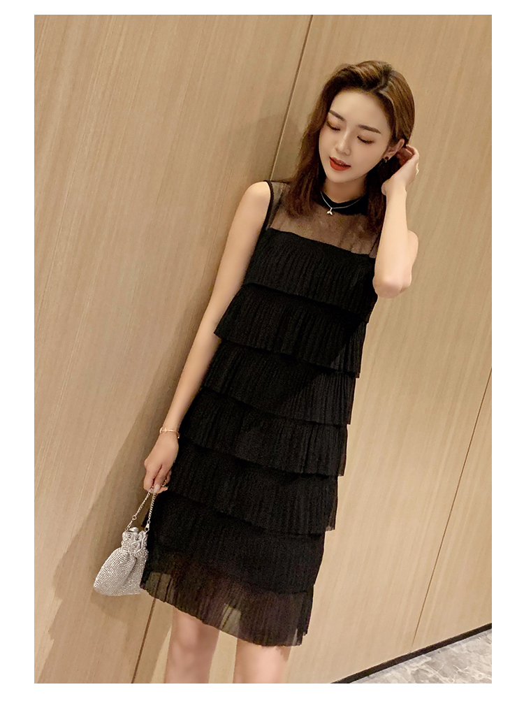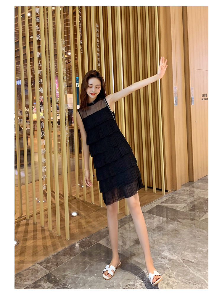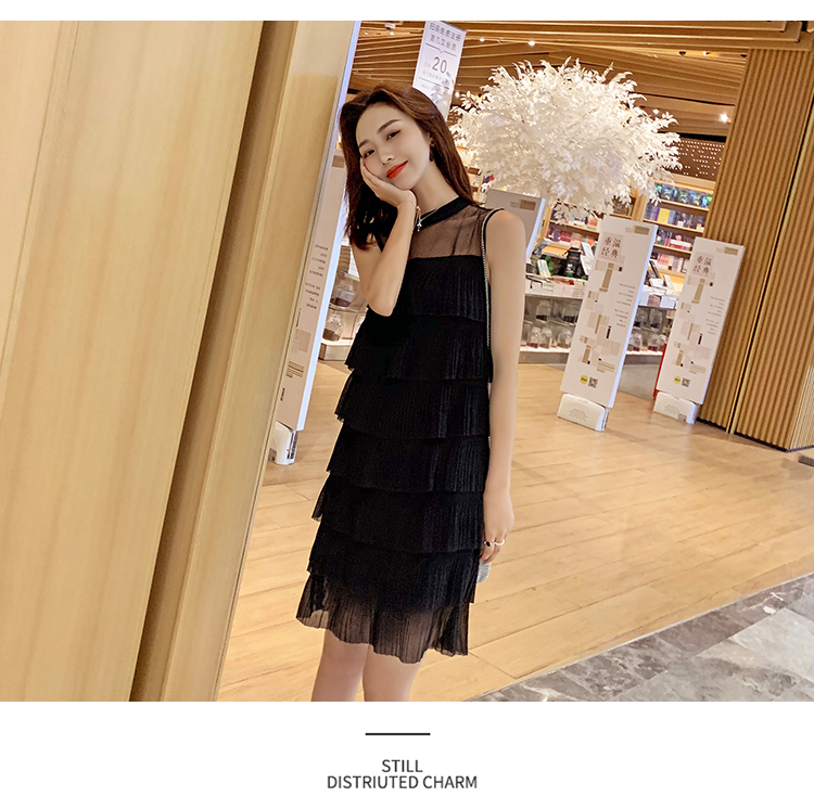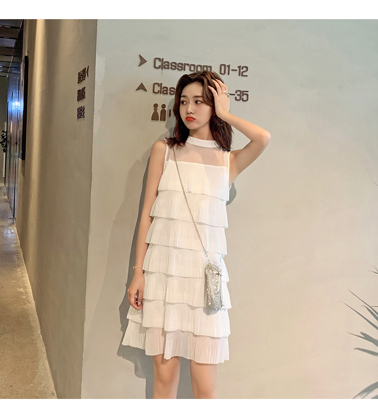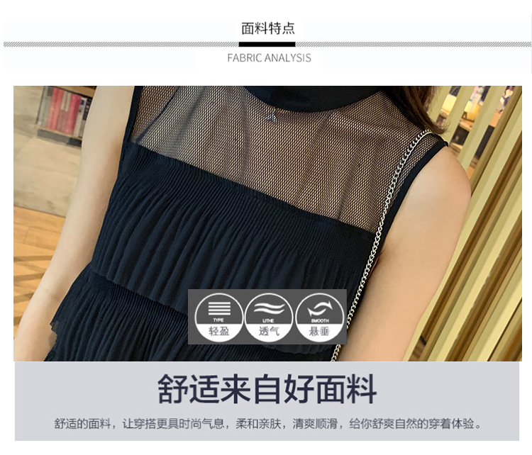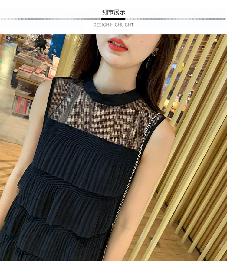 裙子夏季女2019新款氣質小清新慵懶風a字網紗拼接無袖雪紡連衣裙