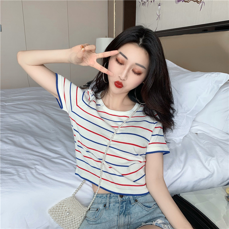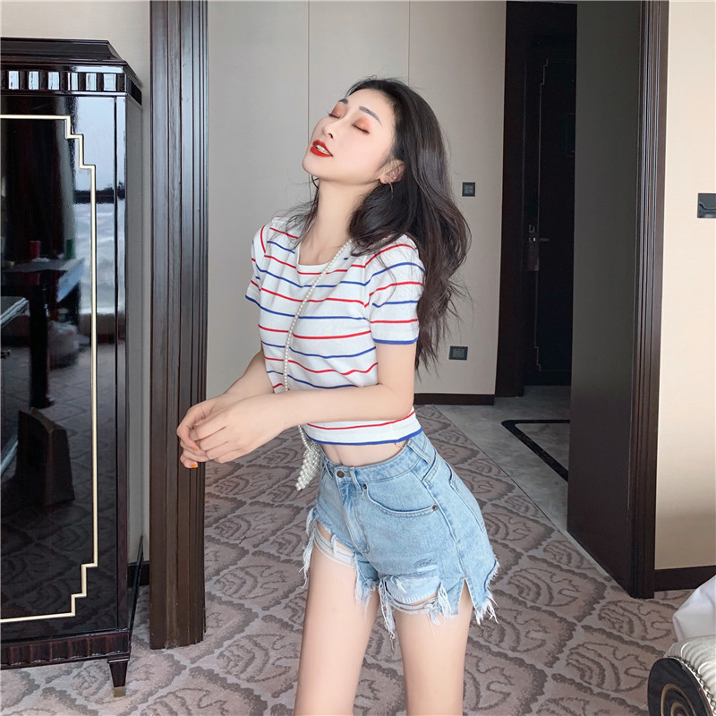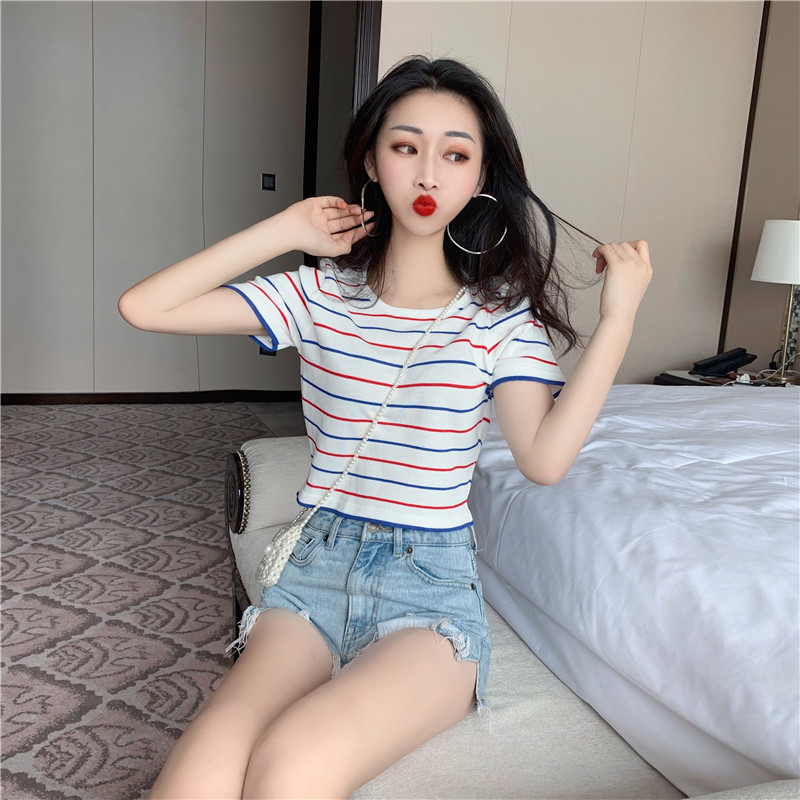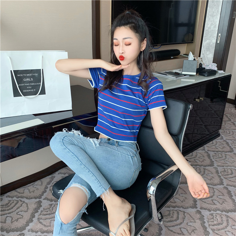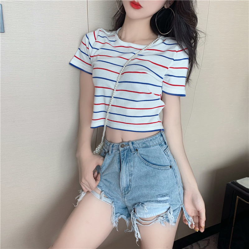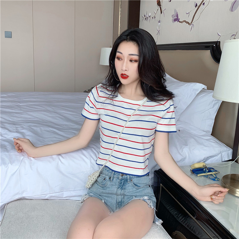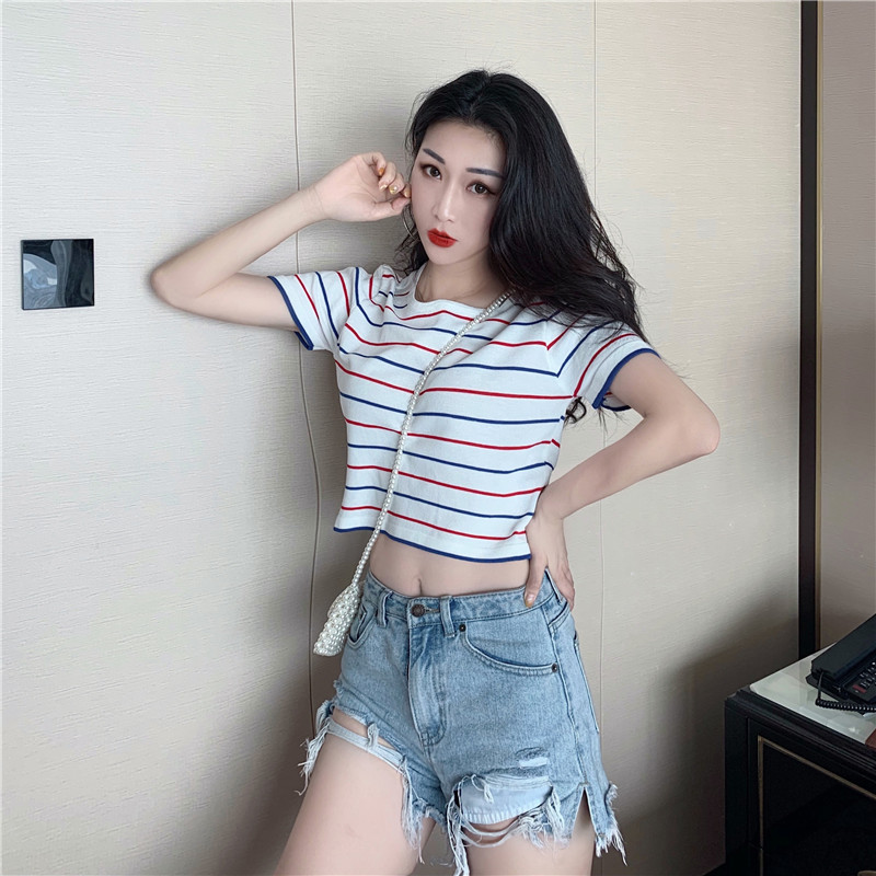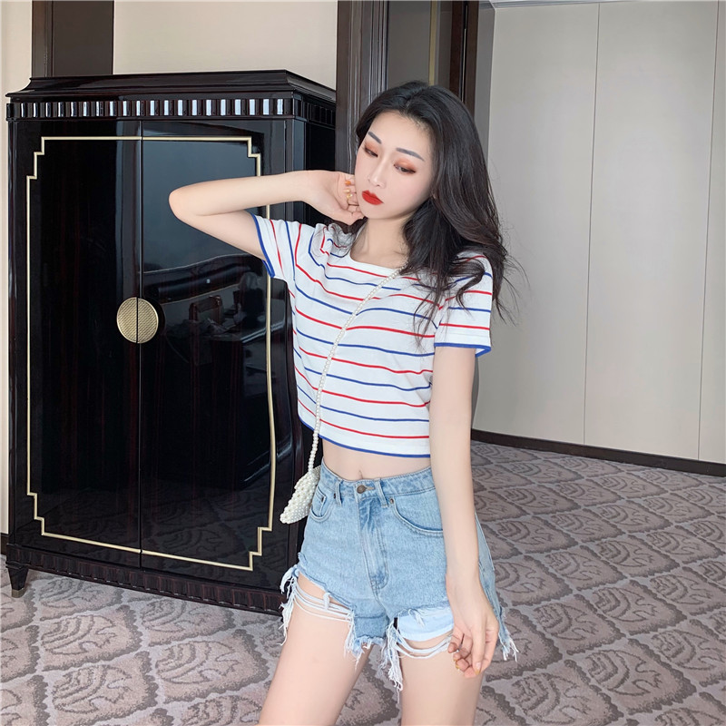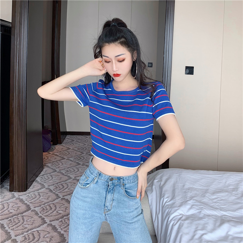 韓版性感緊身露臍短袖女t恤 修身高腰短款上衣漏肚臍小衫短裝體恤