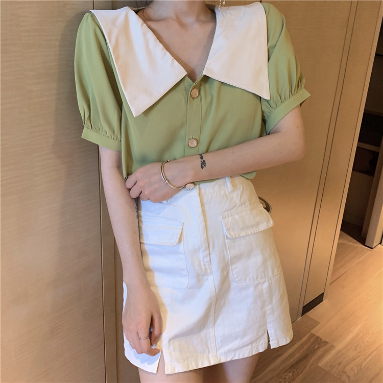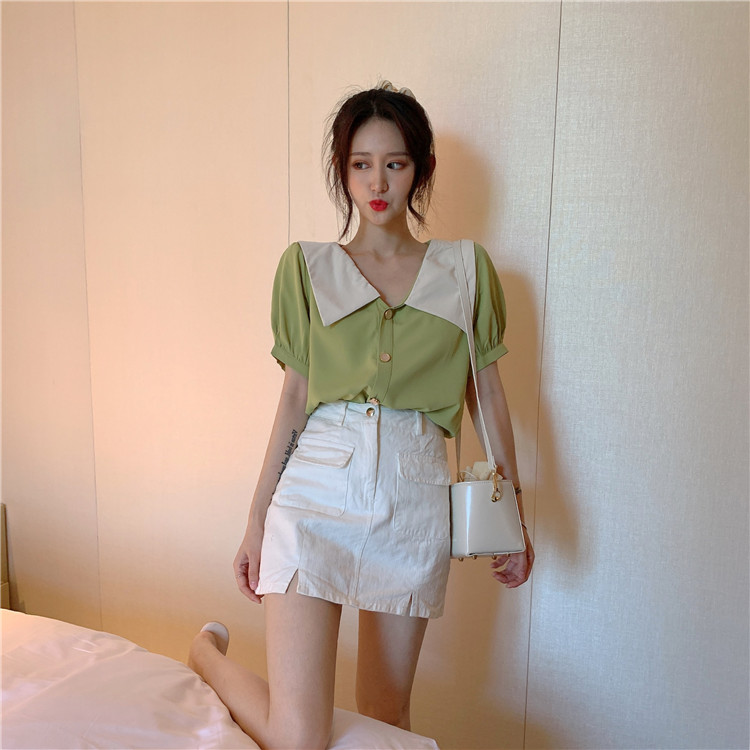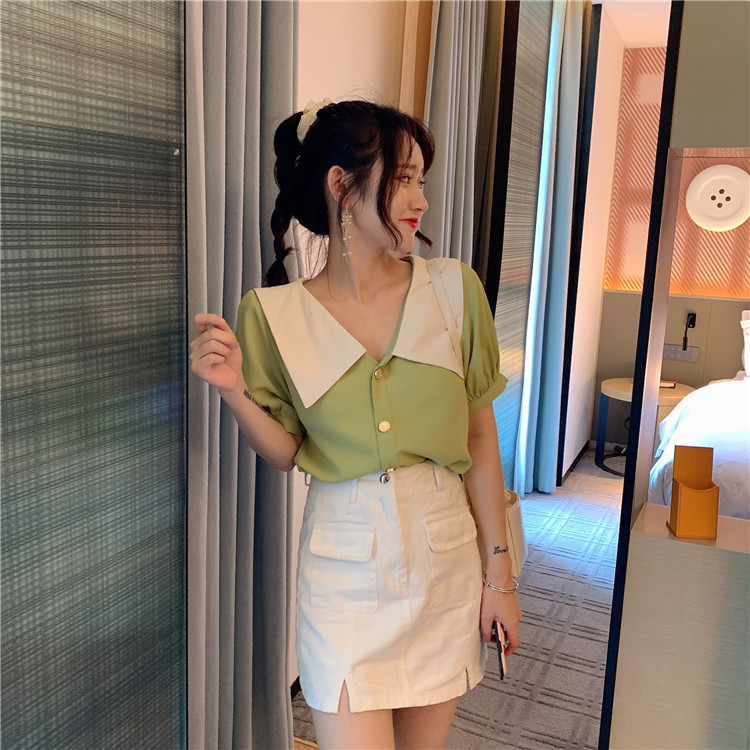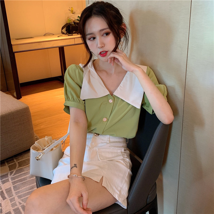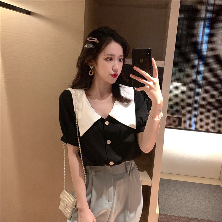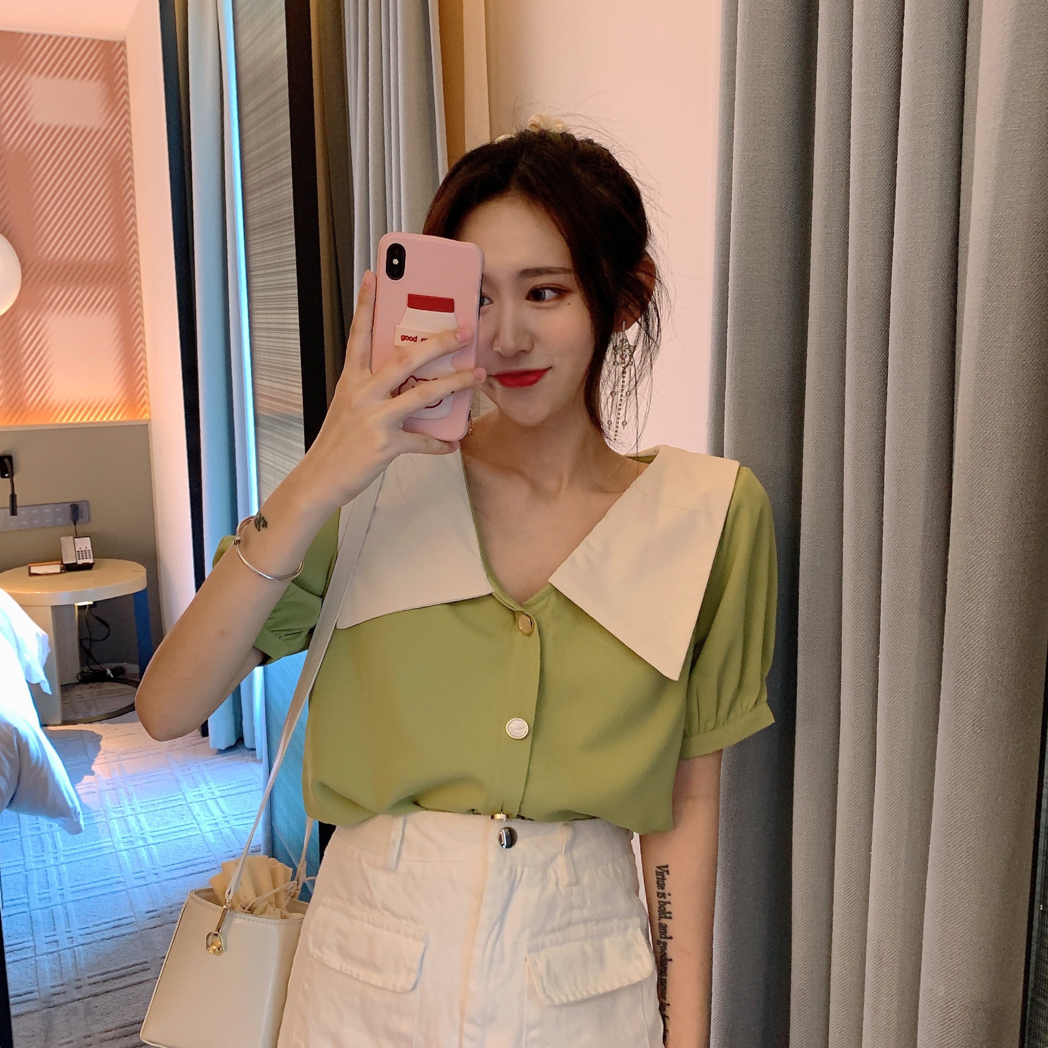 2019韓版撞色娃娃領雪紡短袖上衣寬松chic甜美桔梗小清新襯衫女仙