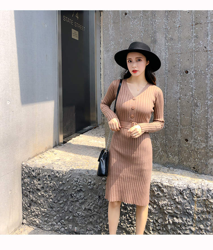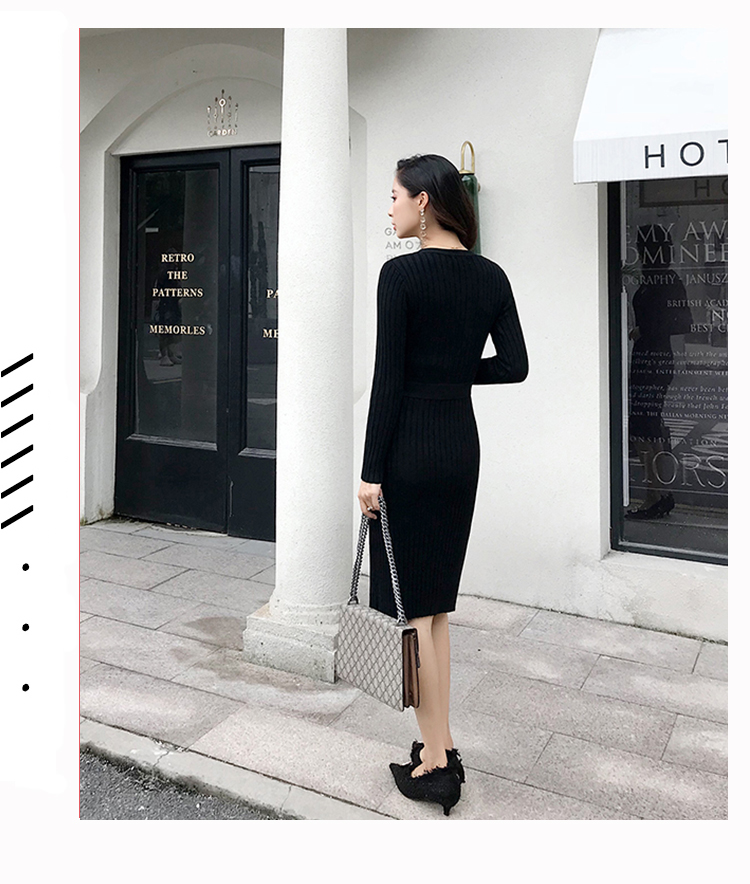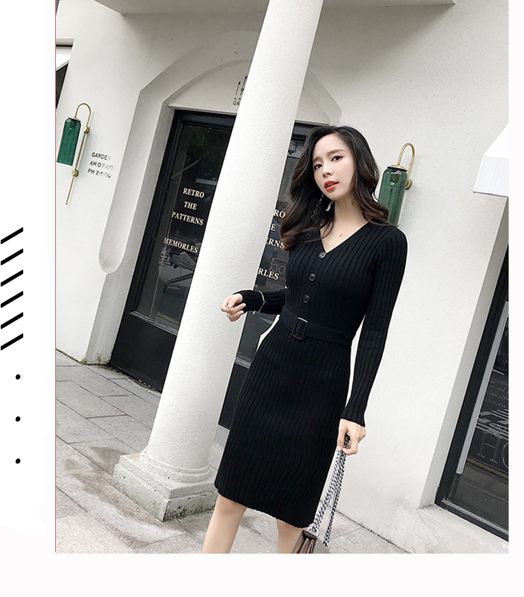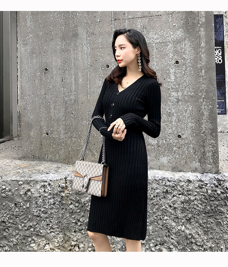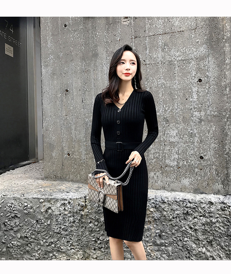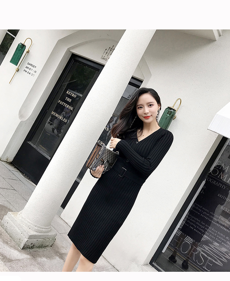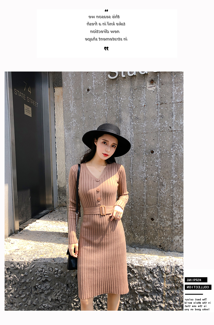 2019春裝新款韓版中長款毛衣裙過膝V領修身打底長袖針織連衣裙女