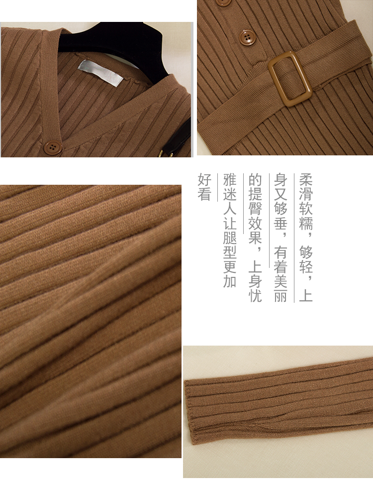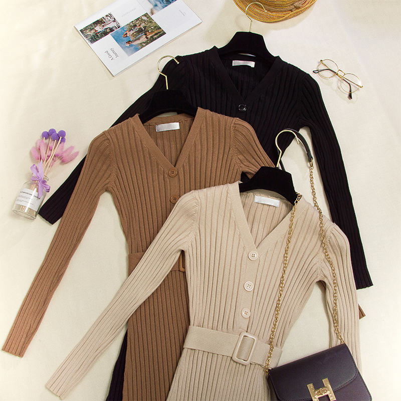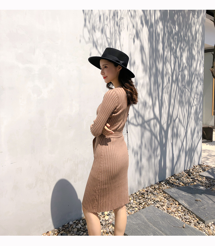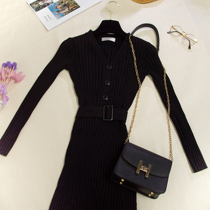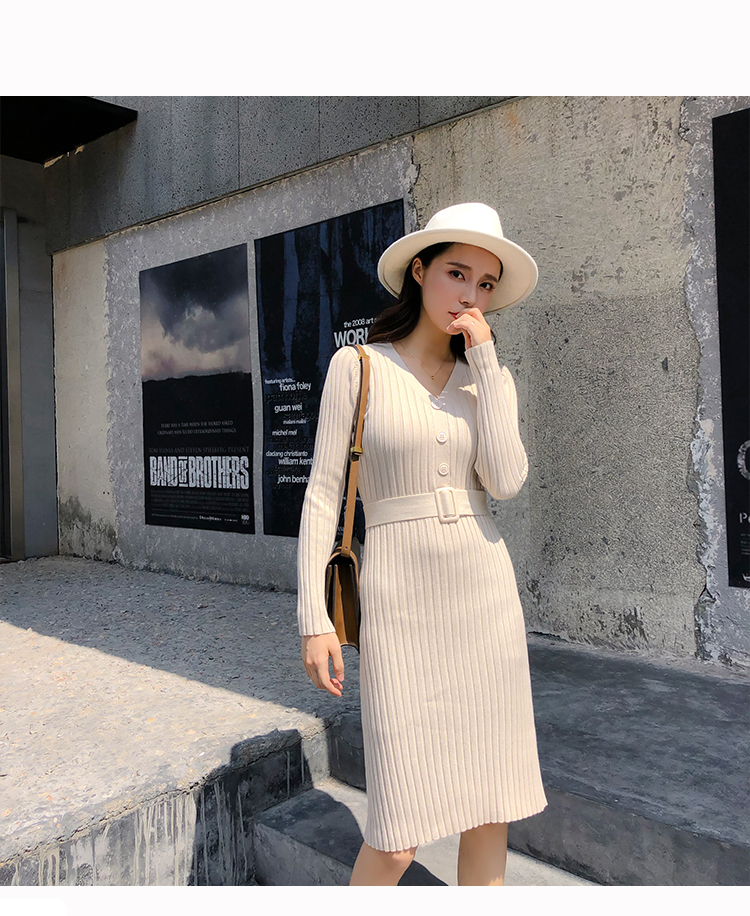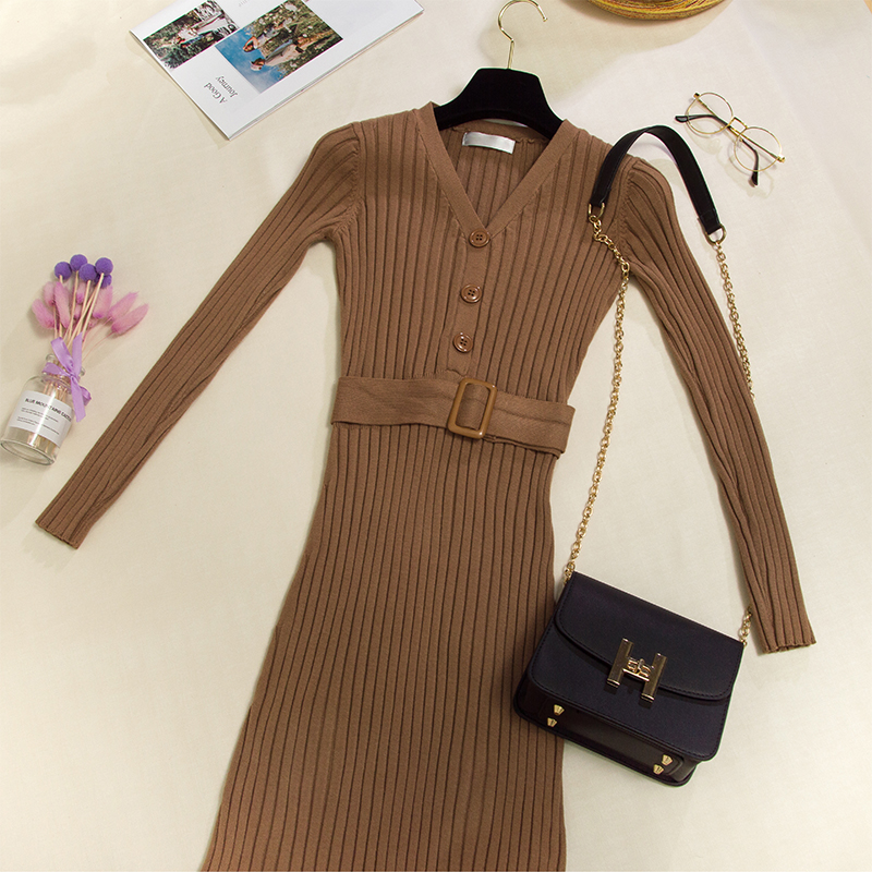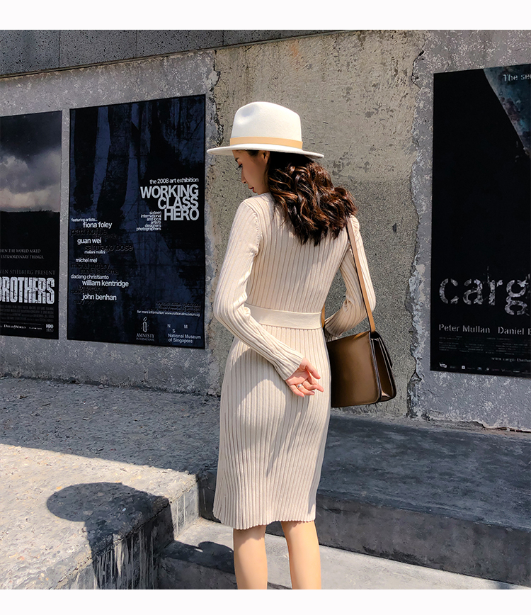 2019春裝新款韓版中長款毛衣裙過膝V領修身打底長袖針織連衣裙女