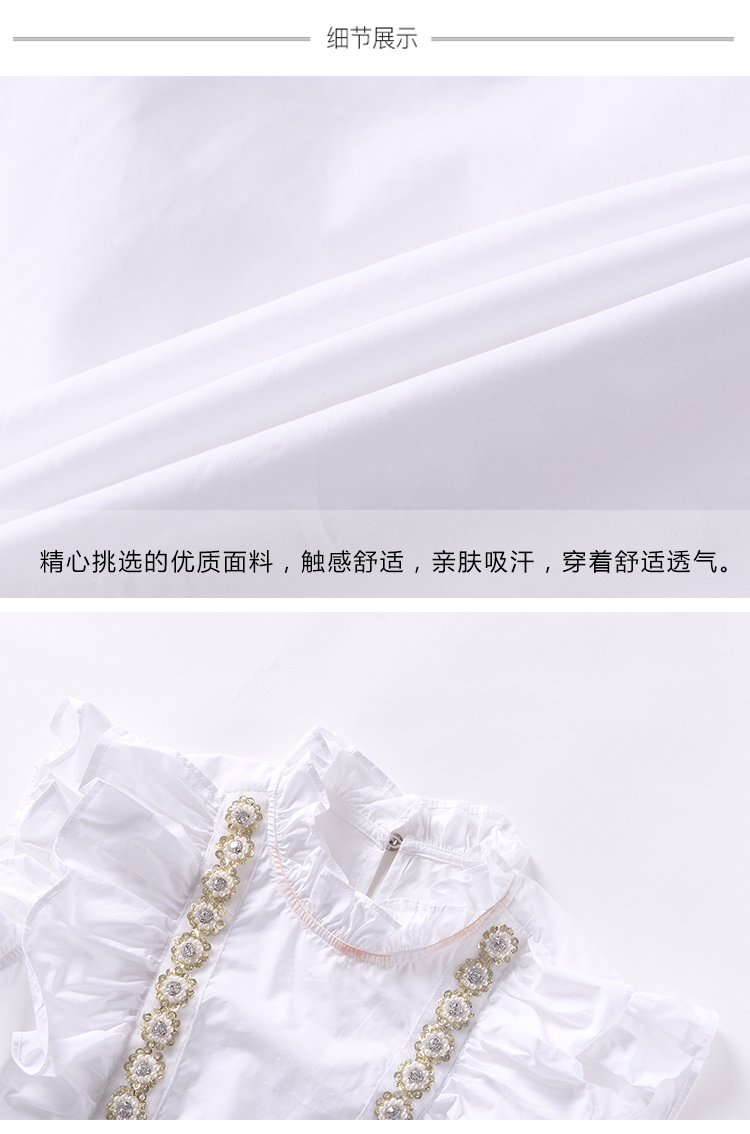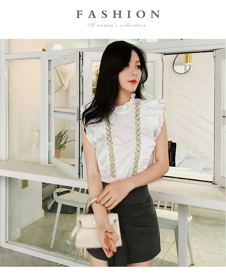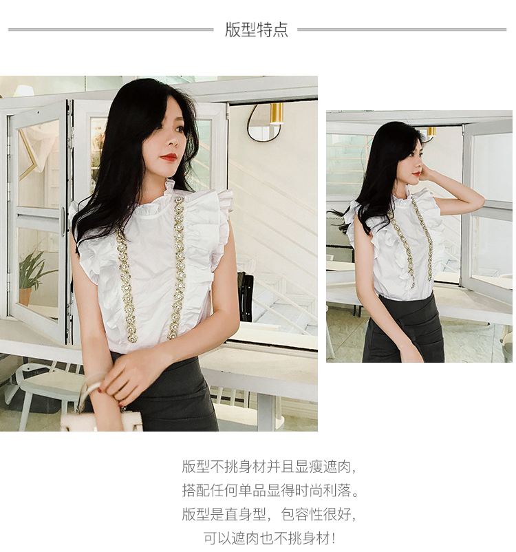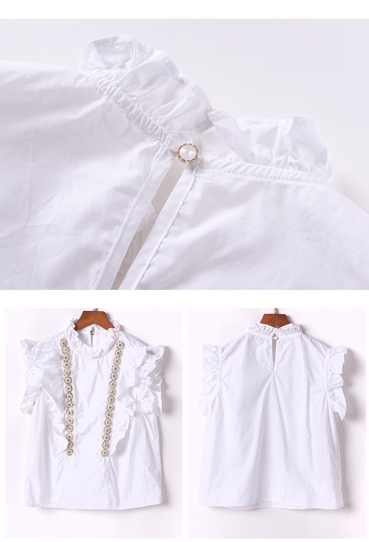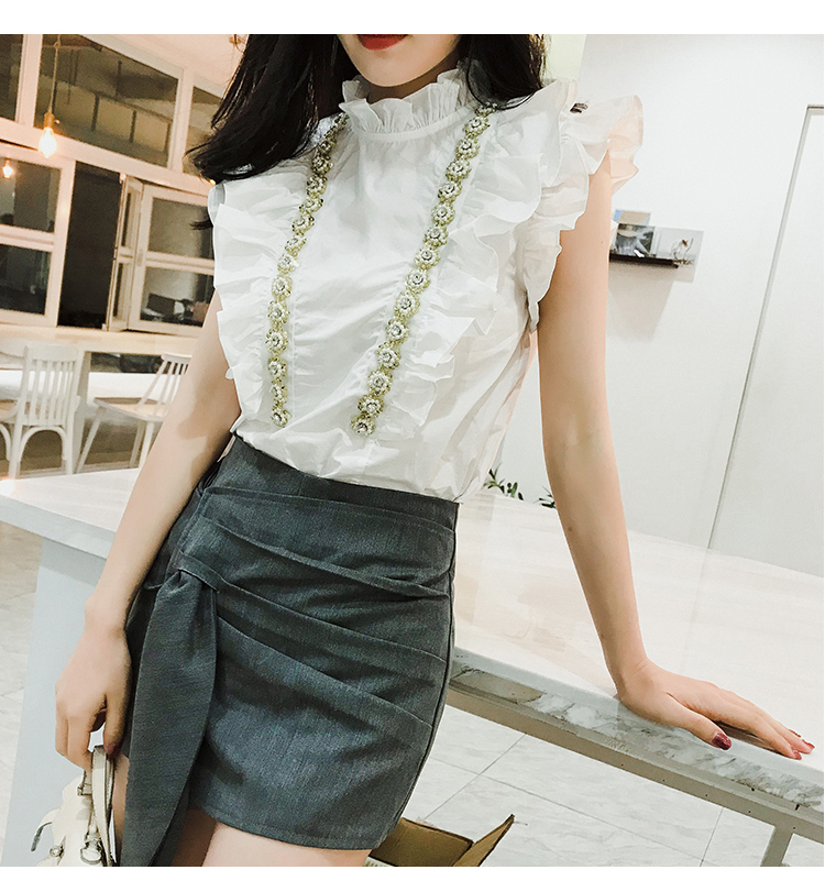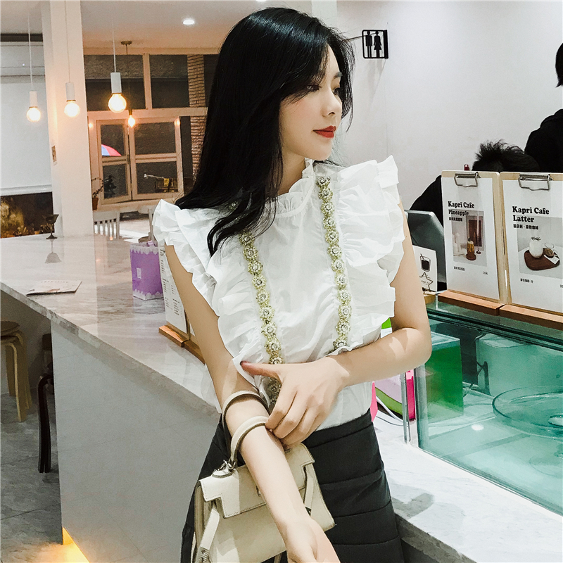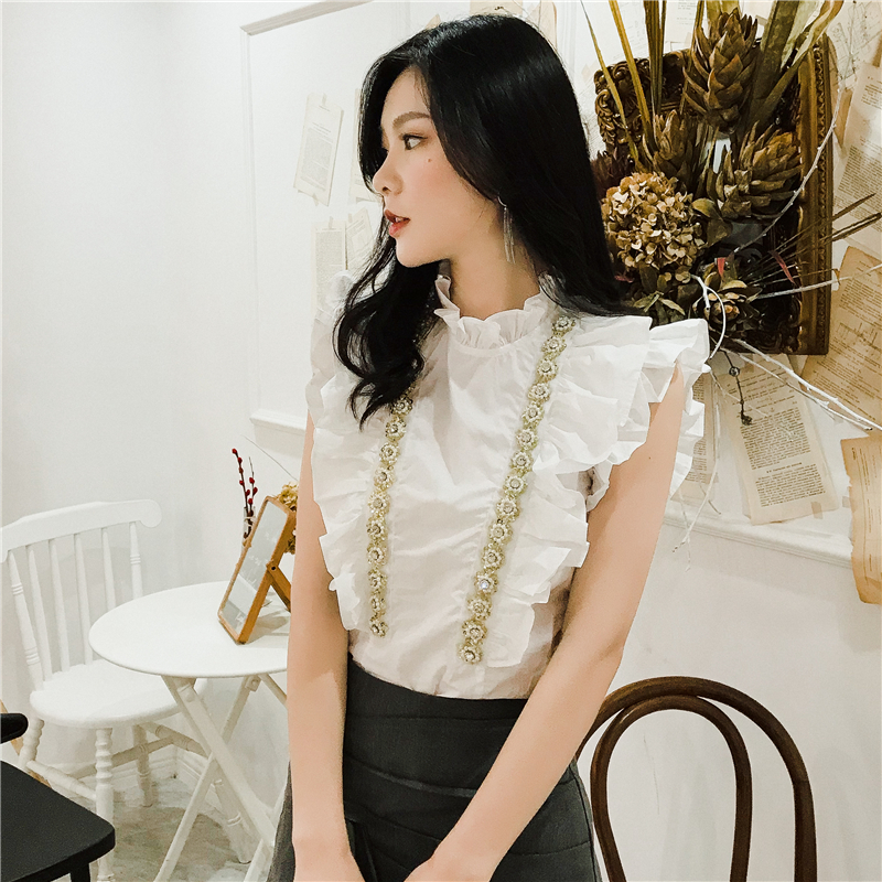 2019春夏季新款韓版短袖白襯衫女甜美荷葉邊訂珠鑲鉆立領雪紡上衣