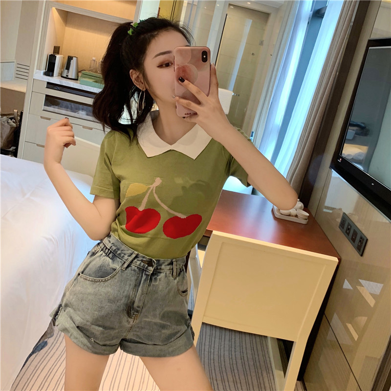 2019夏季牛油果綠修身顯瘦短款Polo領上衣女百搭簡約chic短袖T恤