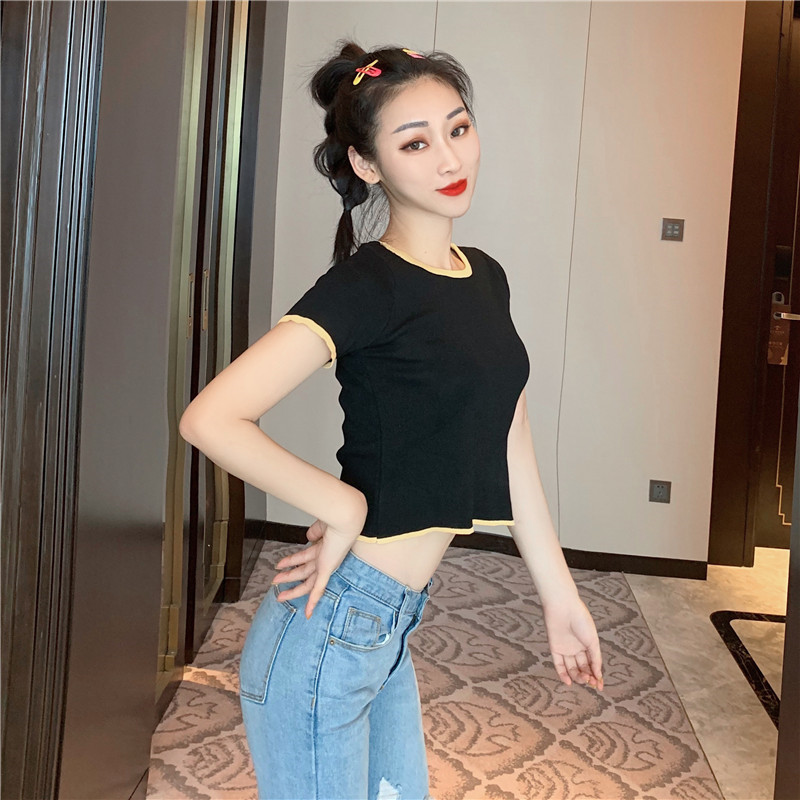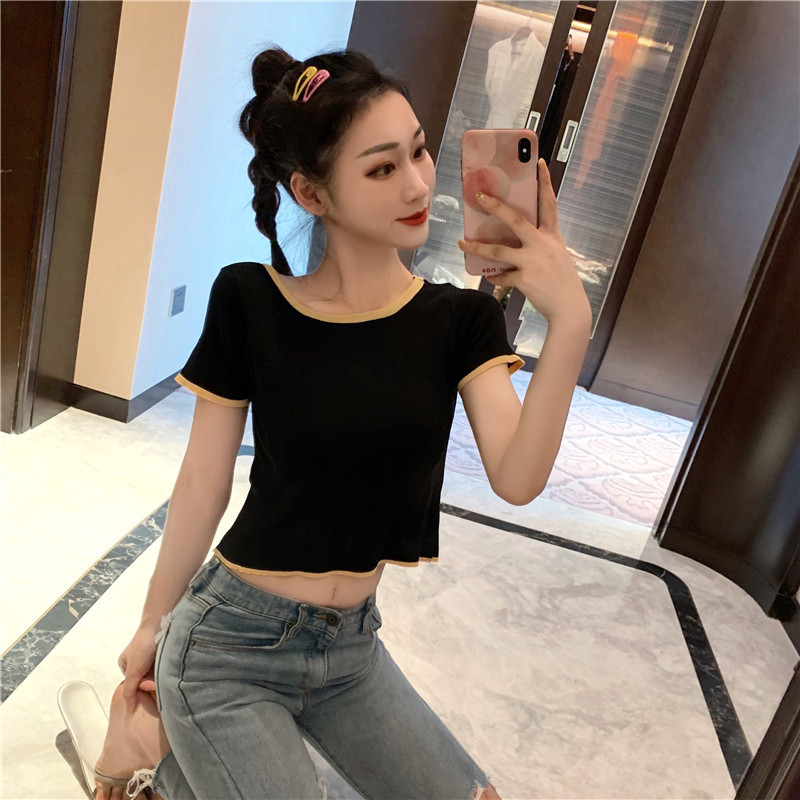 韓風簡約法式復古圓領拼色洋氣短袖短款上衣T恤2019夏露肚臍上衣