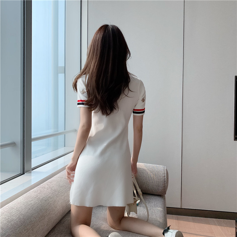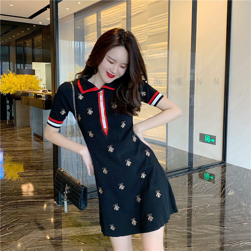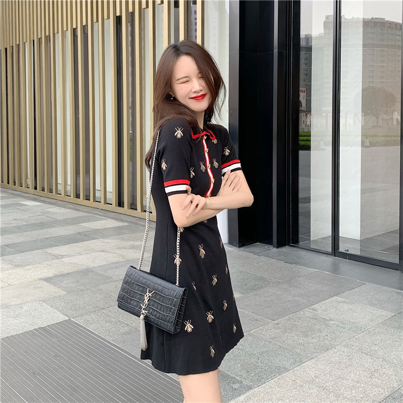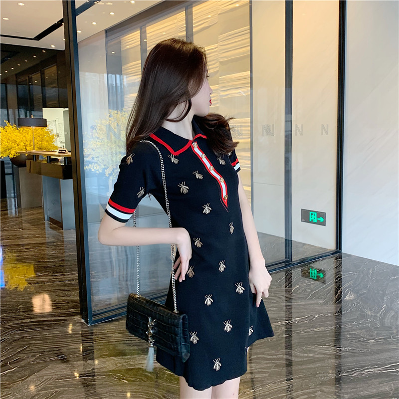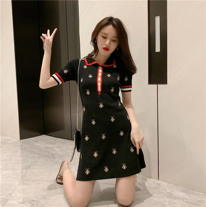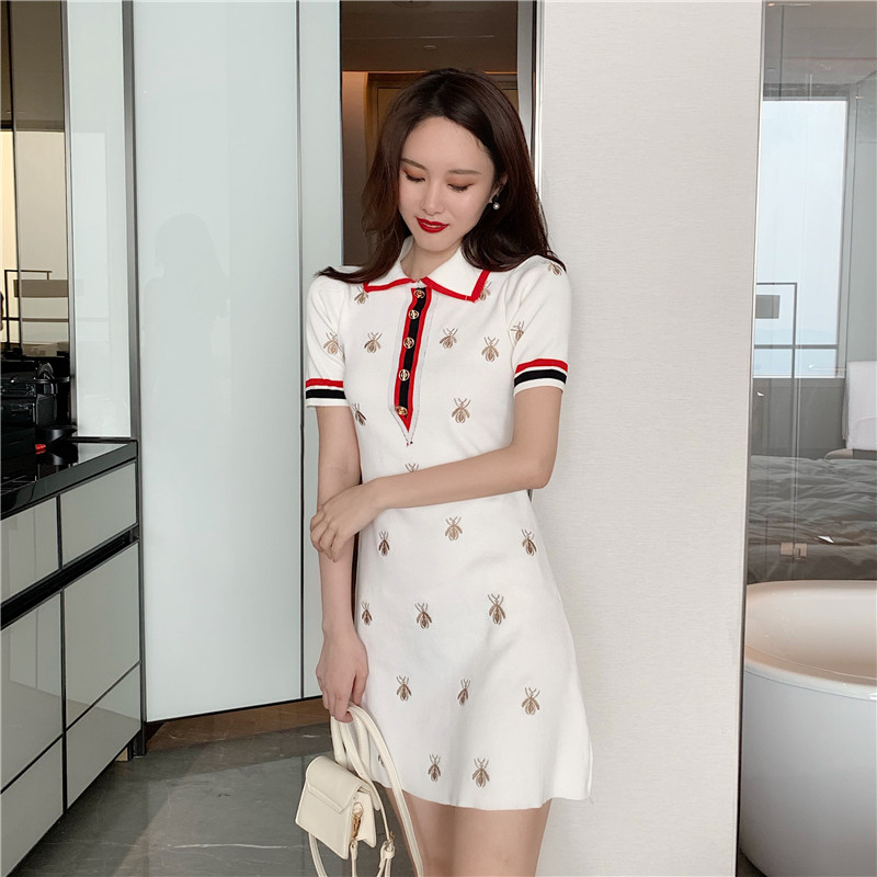 2019春夏新款小香風名媛氣質蜜蜂刺繡POLO領簡約針織修身連衣裙女
