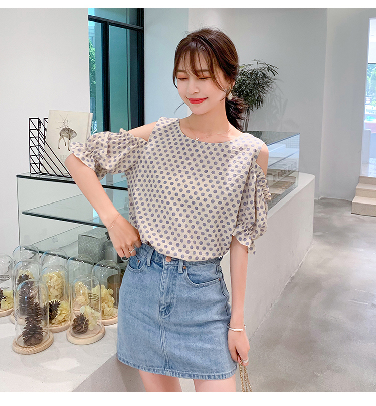 2019夏季新款波點后背系帶蝴蝶結上衣女圓領漏肩寬松遮肉雪紡衫