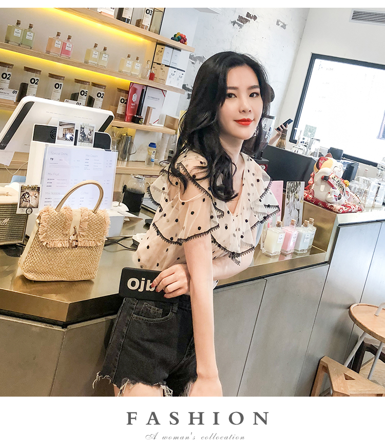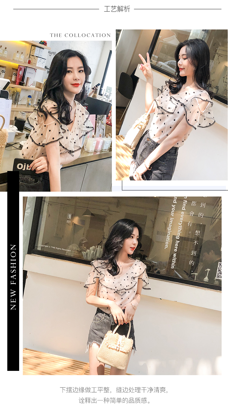 高端雪紡蕾絲衫上衣很仙的荷葉邊女裝2019夏季新款波點網紗打底衫