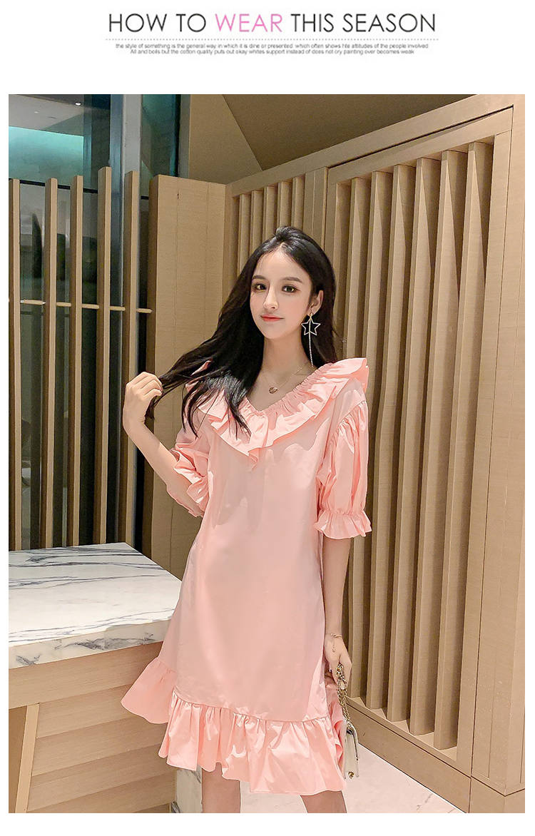2019夏季新款棉麻ins韓風V領短袖寬松百搭中長款連衣裙女生裙子