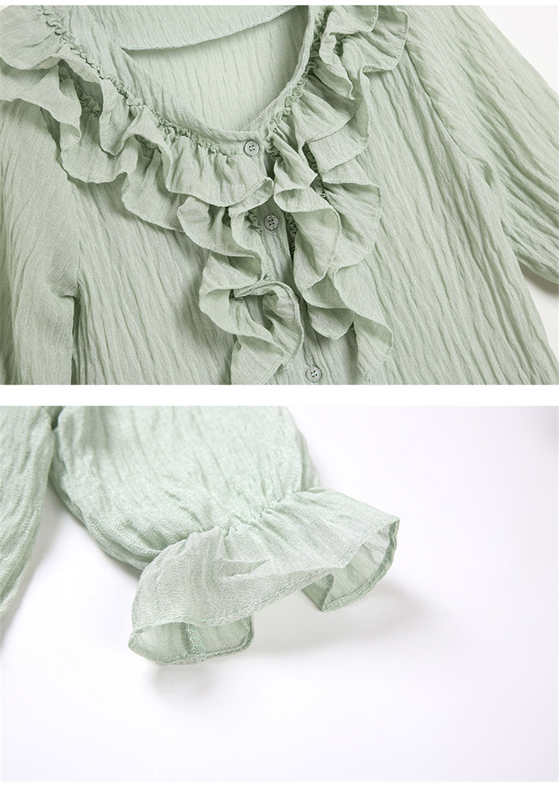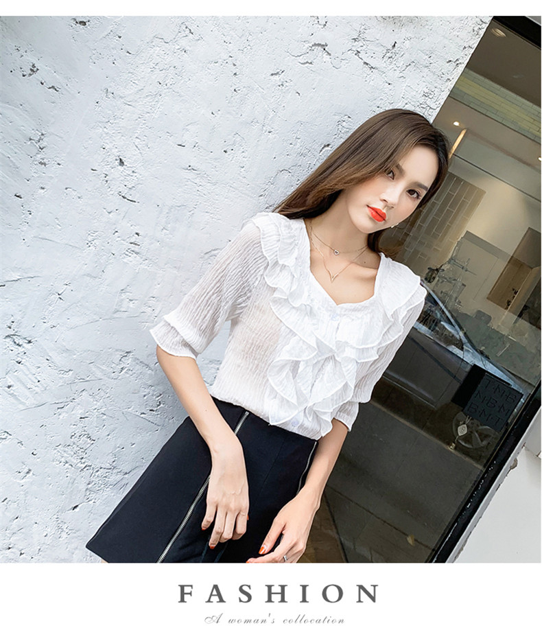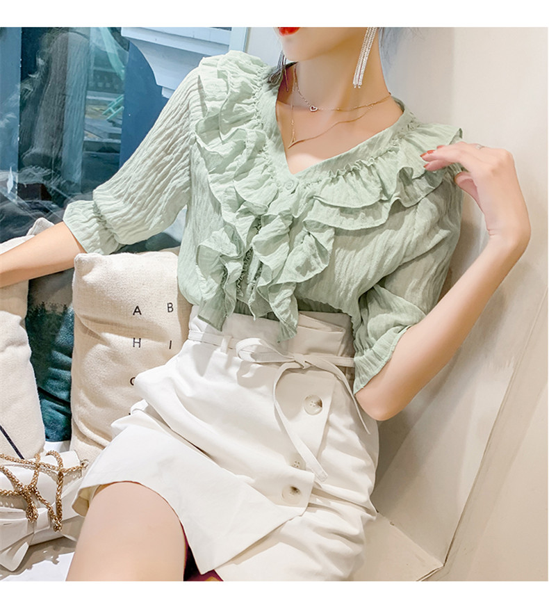 雪紡上衣女夏新款韓版V領喇叭袖單排扣子襯衫荷葉邊時尚洋氣短袖