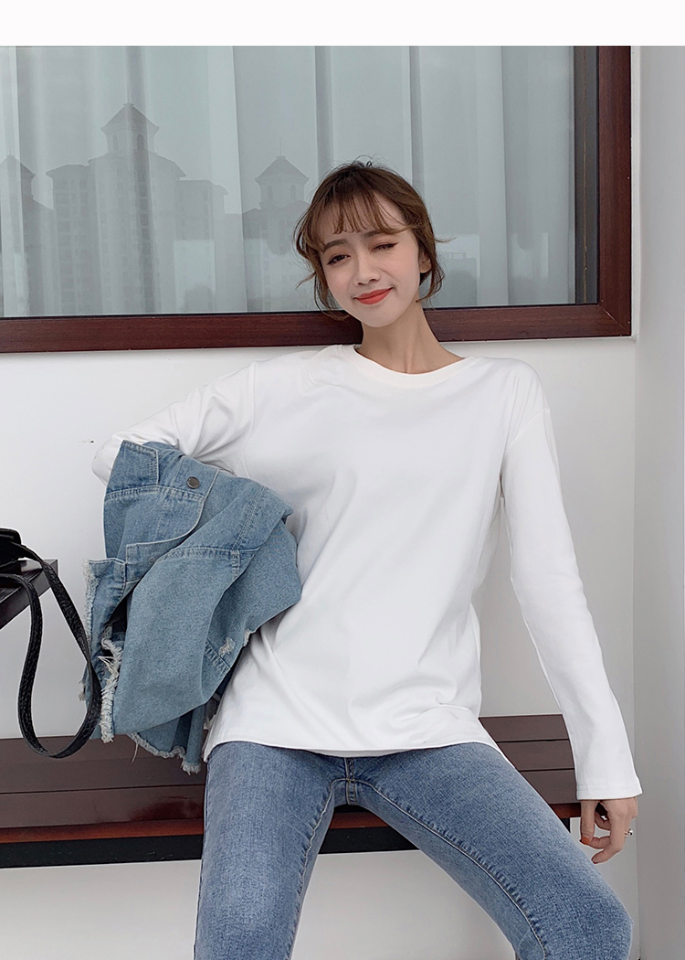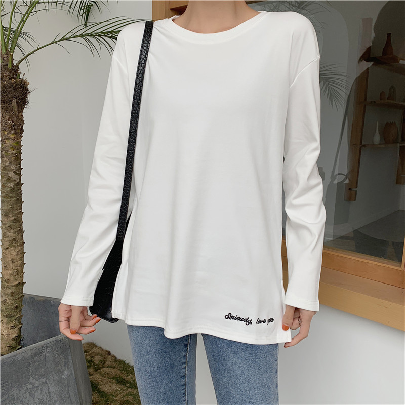 2019新款春裝寬松白色上衣中長款下擺開叉百搭刺繡長袖t恤打底衫