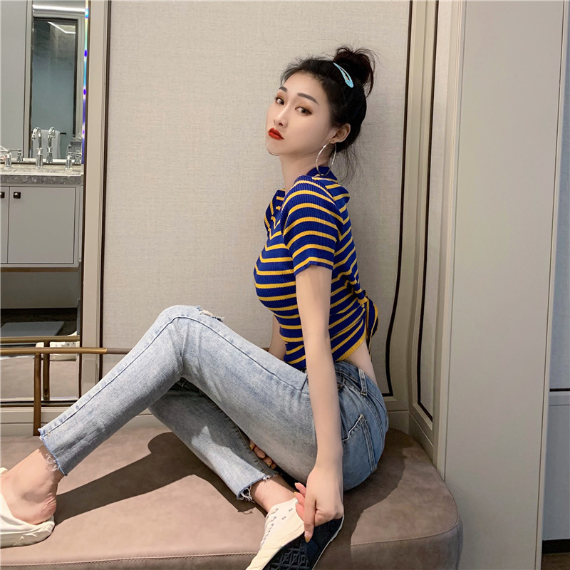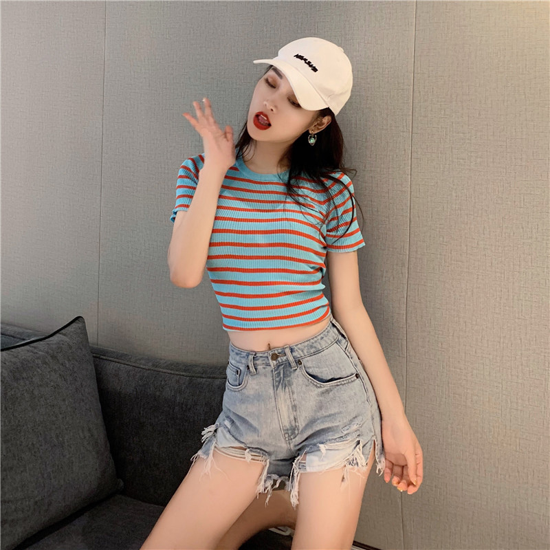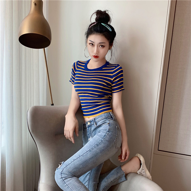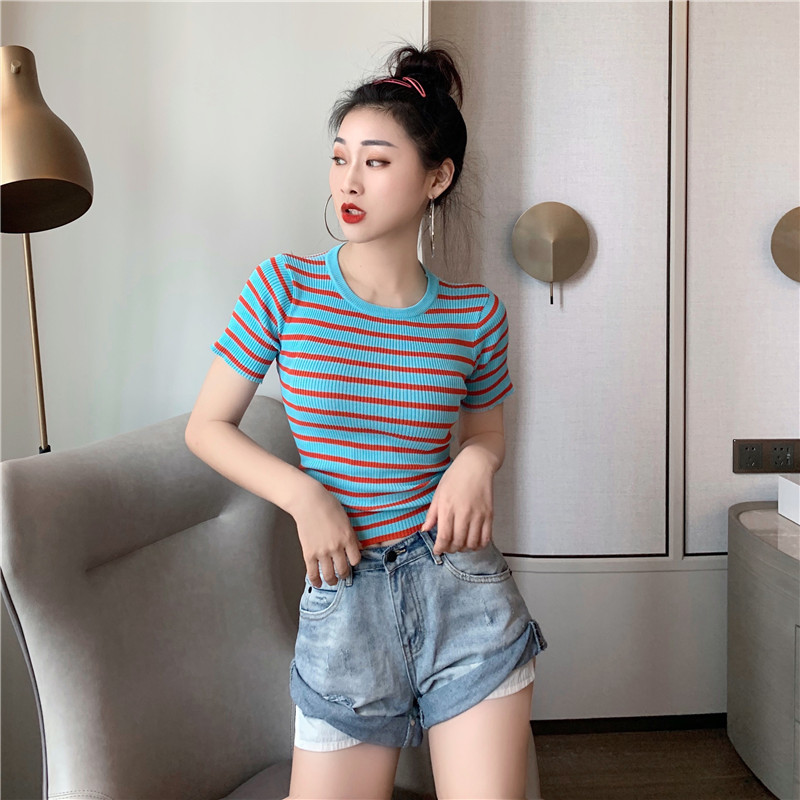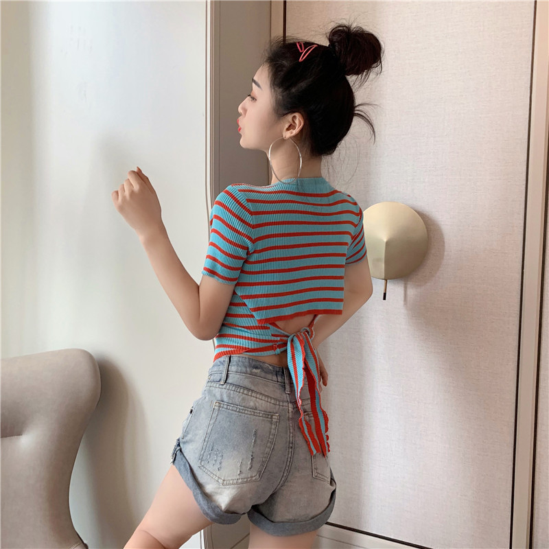鬼馬少女條紋短袖T恤女ins顯瘦撞色性感背后綁帶設計針織衫打底衫