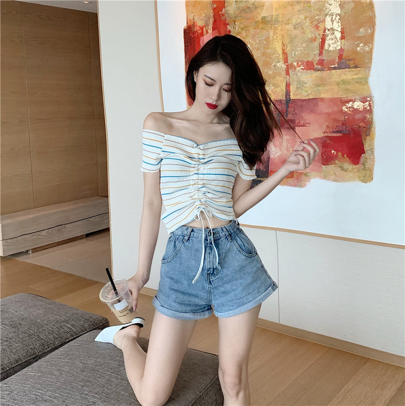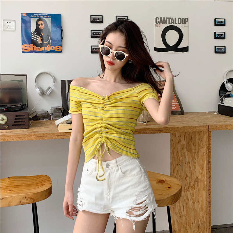 2019新款夏季韓版百搭漏肩抽繩修身條紋T恤女網紅顯瘦V領性感短袖