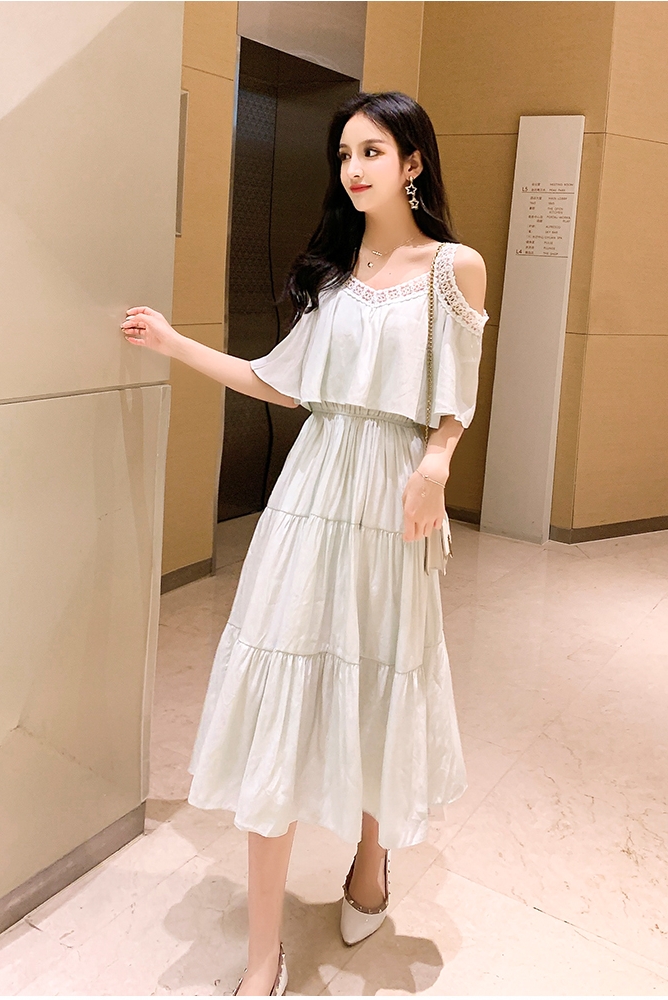 2019流行夏天裙子氣質V領荷葉邊吊帶裙新款法國復古過膝A字連衣裙