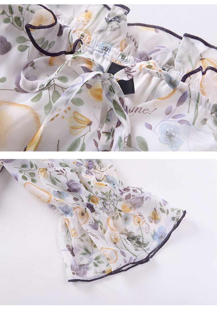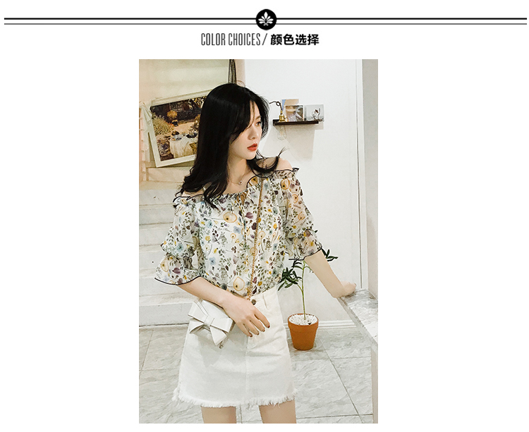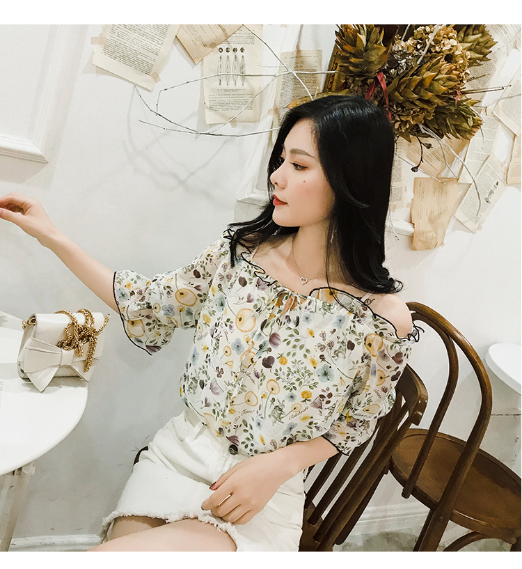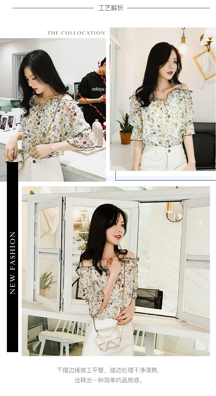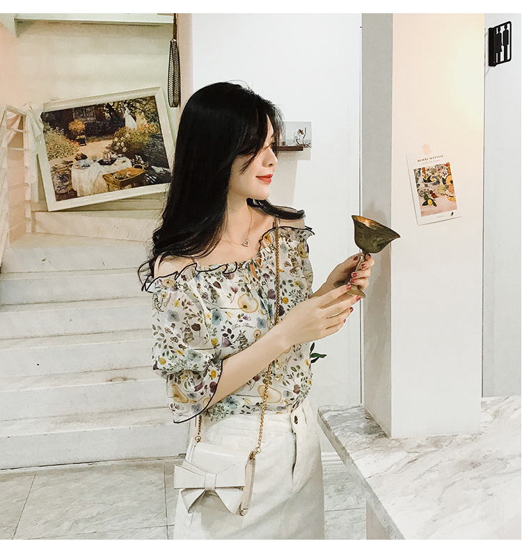 2019新款夏季網紗雪紡衫短袖襯衫女一字肩很仙的上衣洋氣寬松