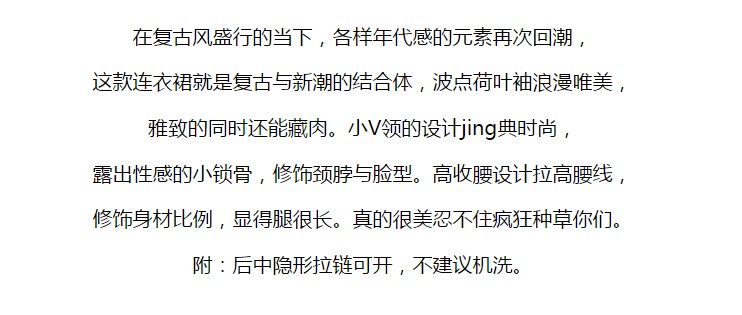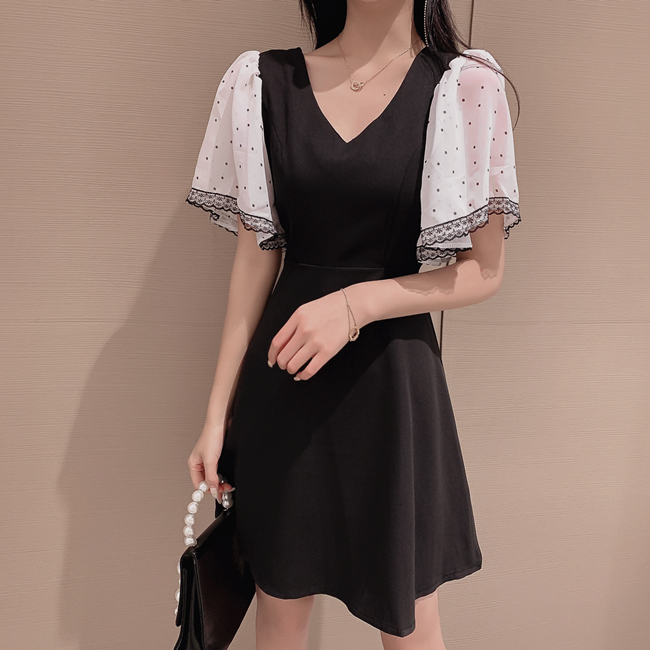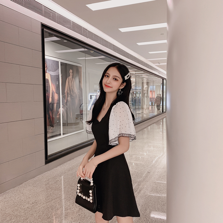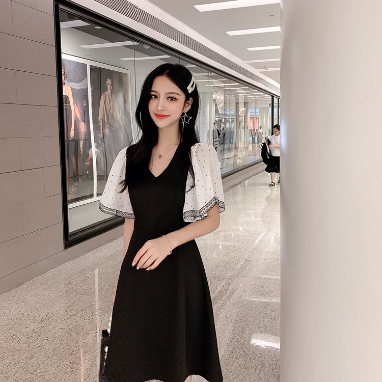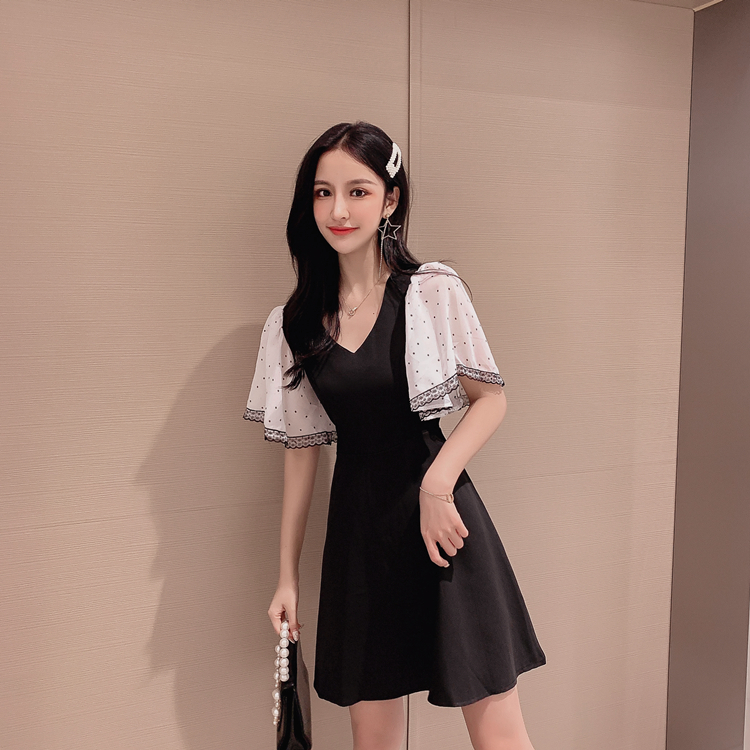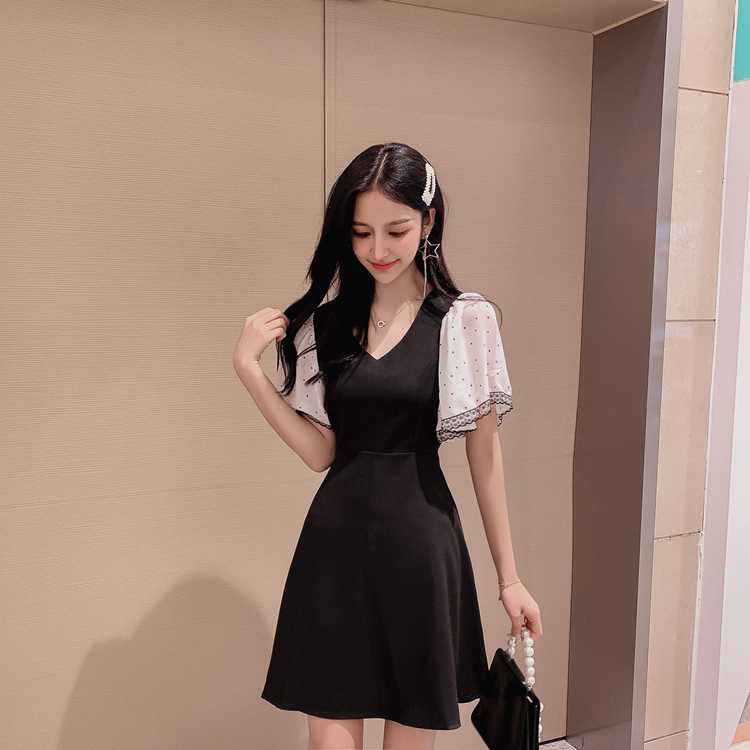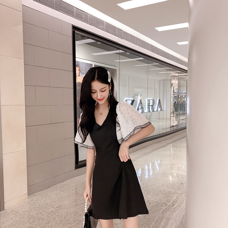 2019韓版夏季新款減齡遮肉復古V領波點袖收腰黑色小個子連衣裙女