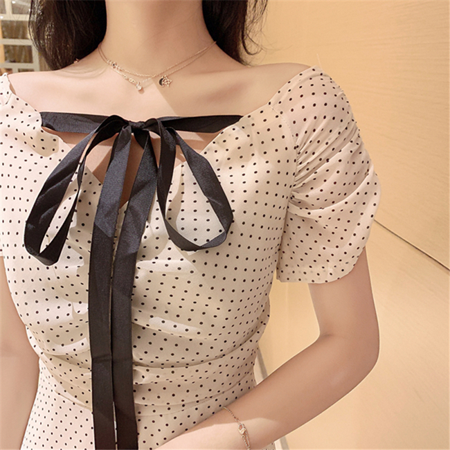 2019年新款夏流行小禮服中長款一字肩波點短袖系帶蝴蝶結連衣裙子