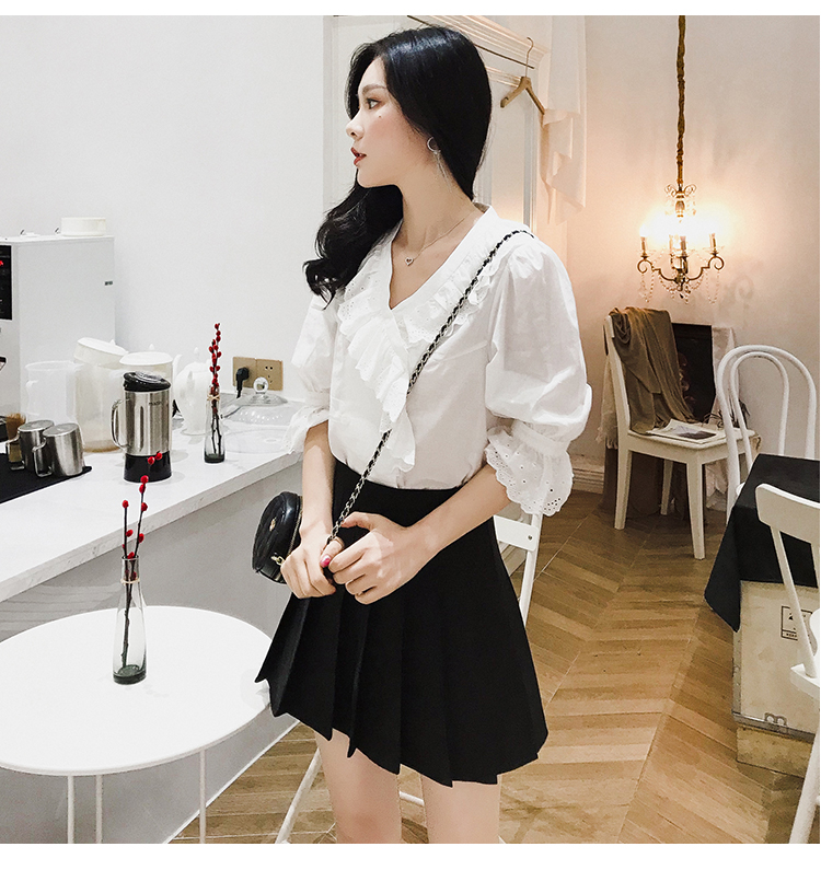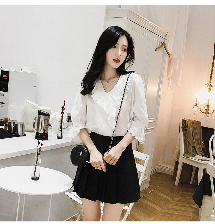 2019夏裝新品韓版寬松顯瘦荷葉邊V領雪紡衫百搭洋氣五分袖上衣潮