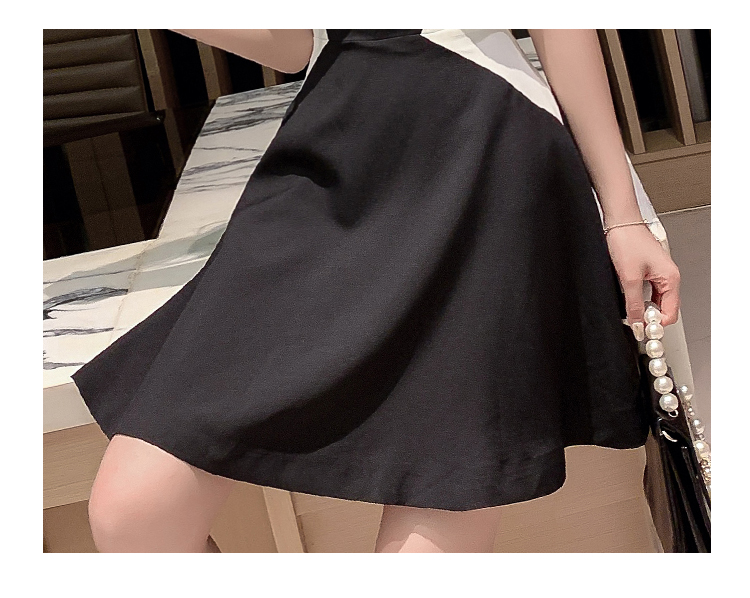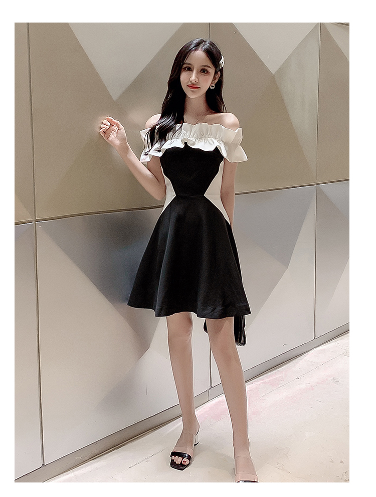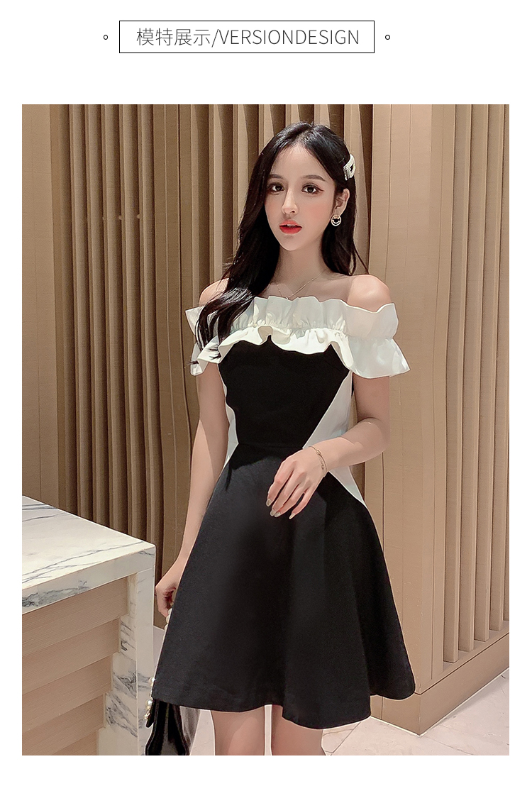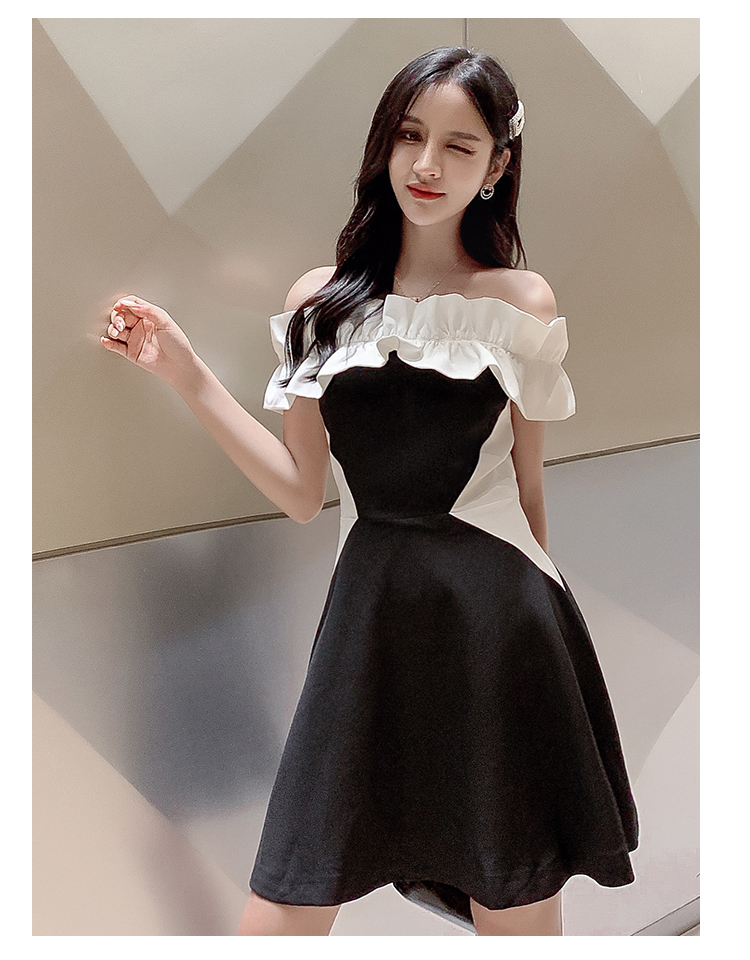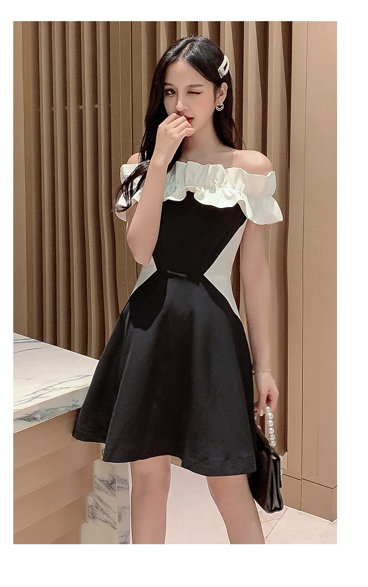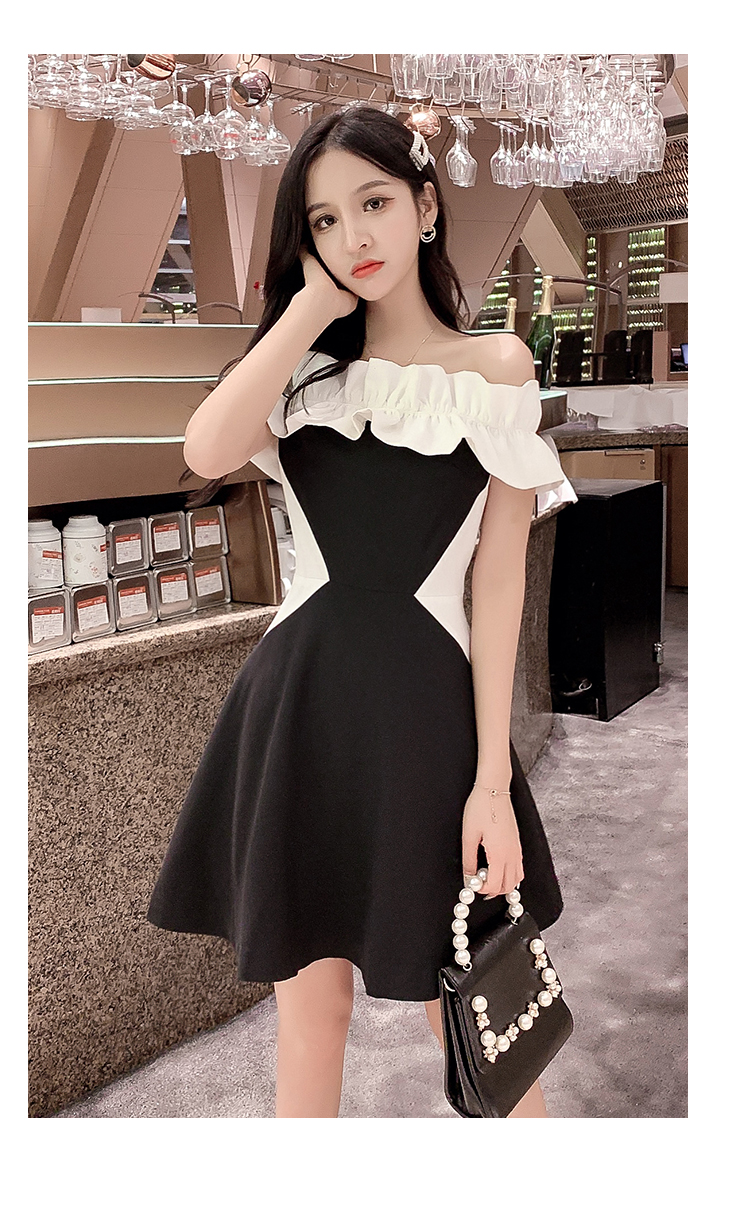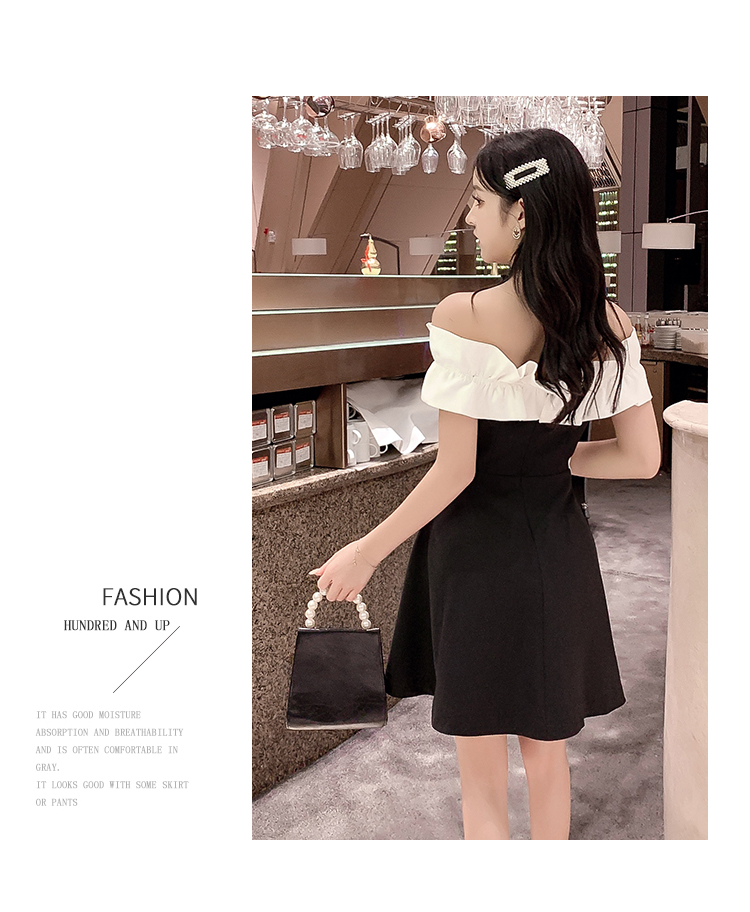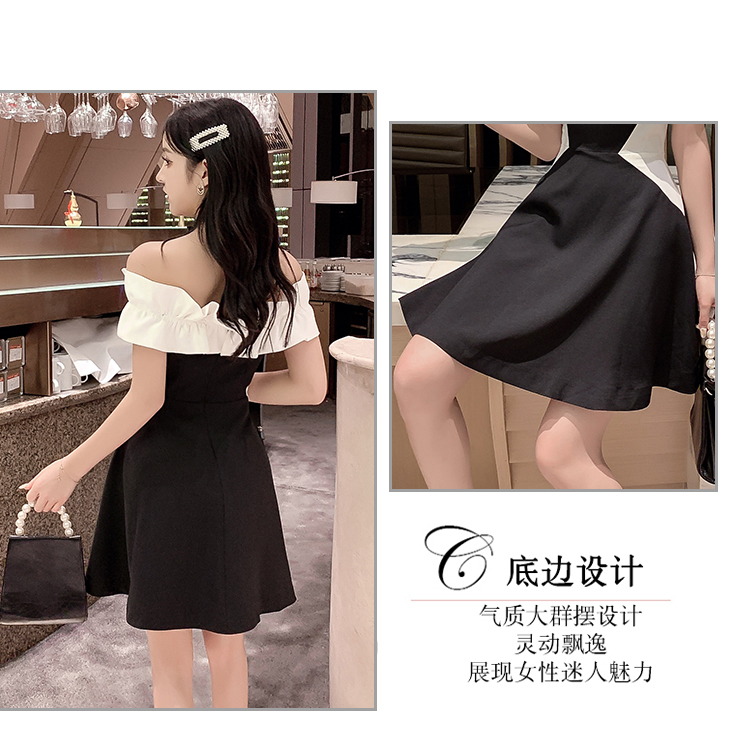 裙子女2019新款夏季心機小黑裙赫本一字肩撞色拼接桔梗復古連衣裙