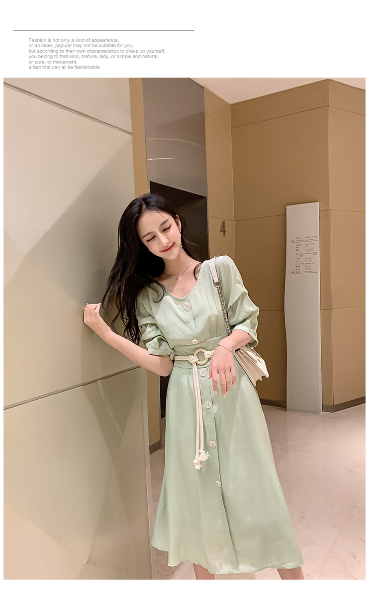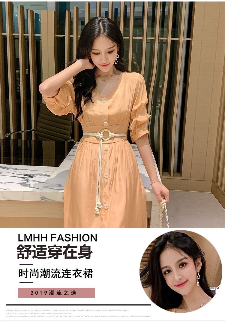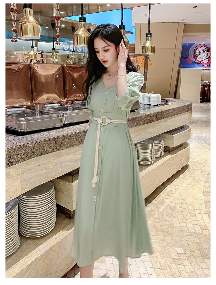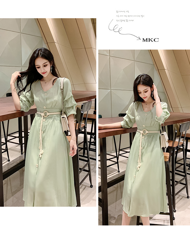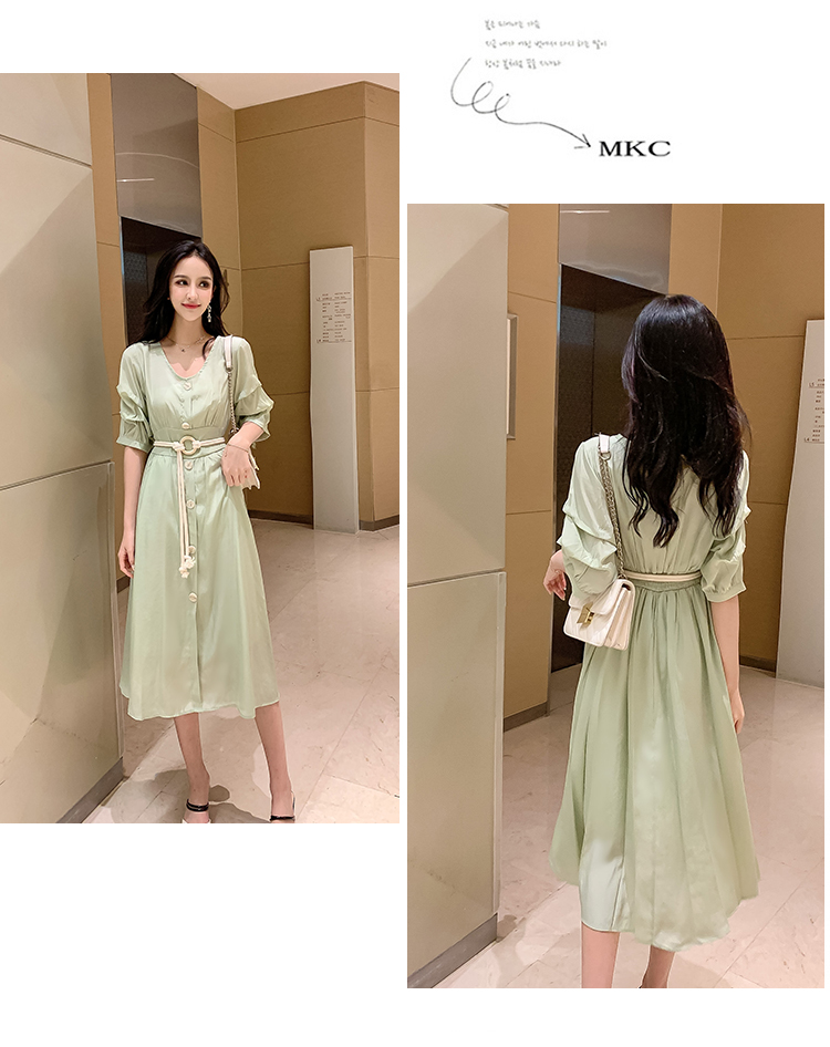 2019夏季新款V領牛油果綠連衣裙女裝韓版收腰顯瘦過膝裙子A字裙潮
