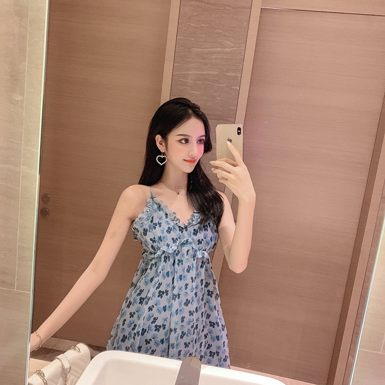 雪紡沙灘裙子女夏季海邊度假甜美木耳邊V領中長款吊帶碎花連衣裙