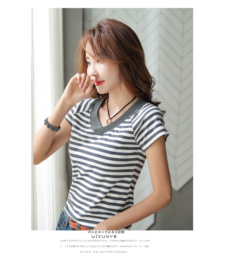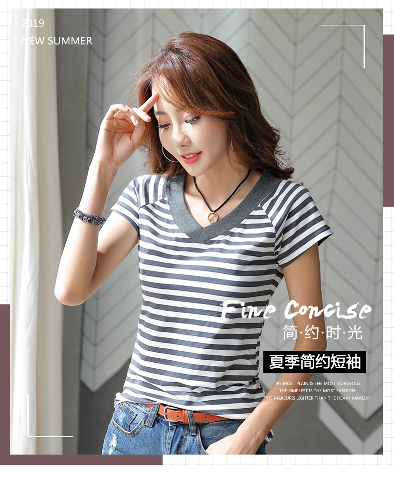 2019夏季新款條紋V領顯瘦百搭短袖t恤女裝韓版棉質半袖打底衫女