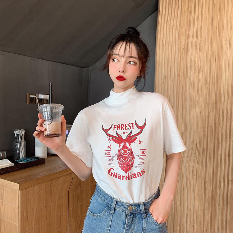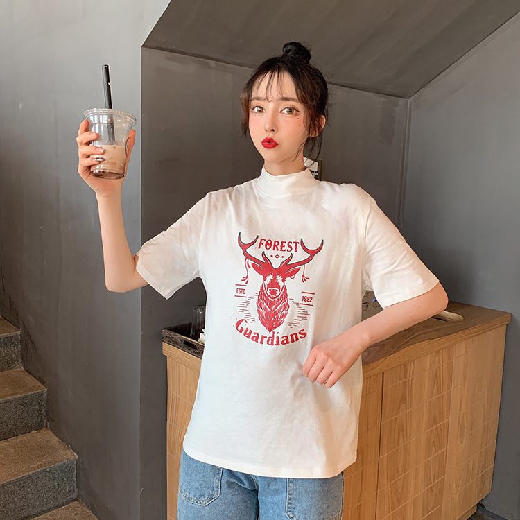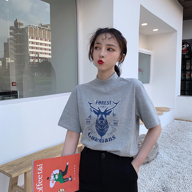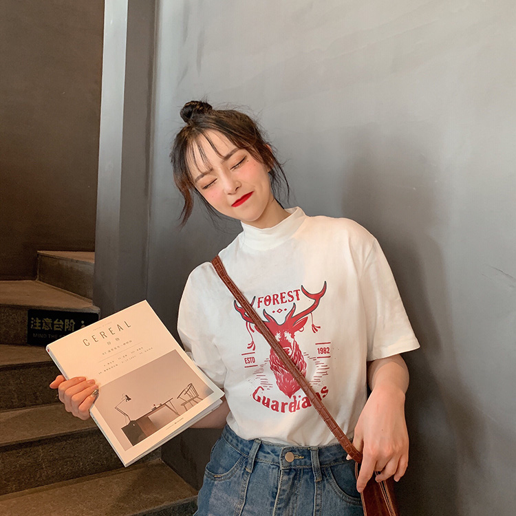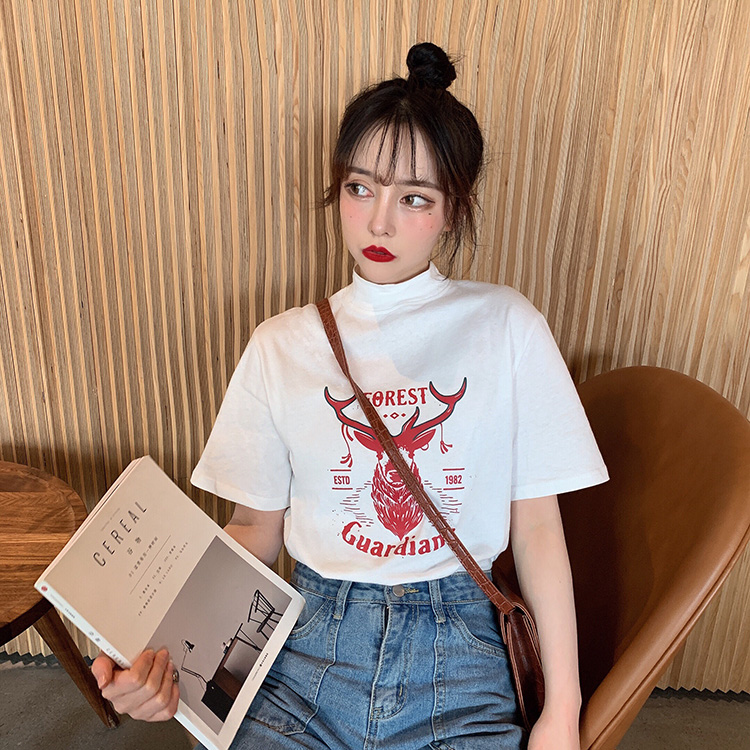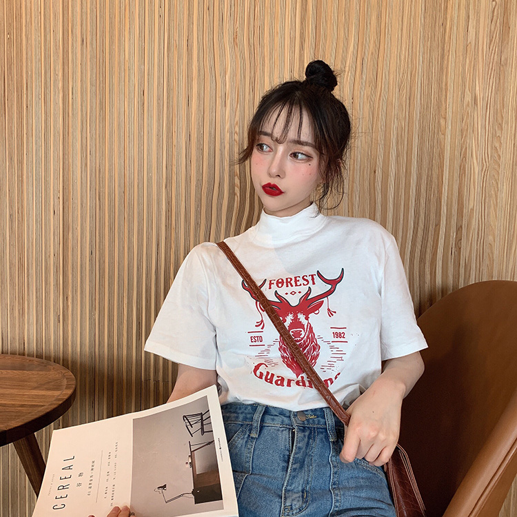 2019新款韓版百搭寬松超火cec小高領短袖t恤女學生ins上衣服?潮