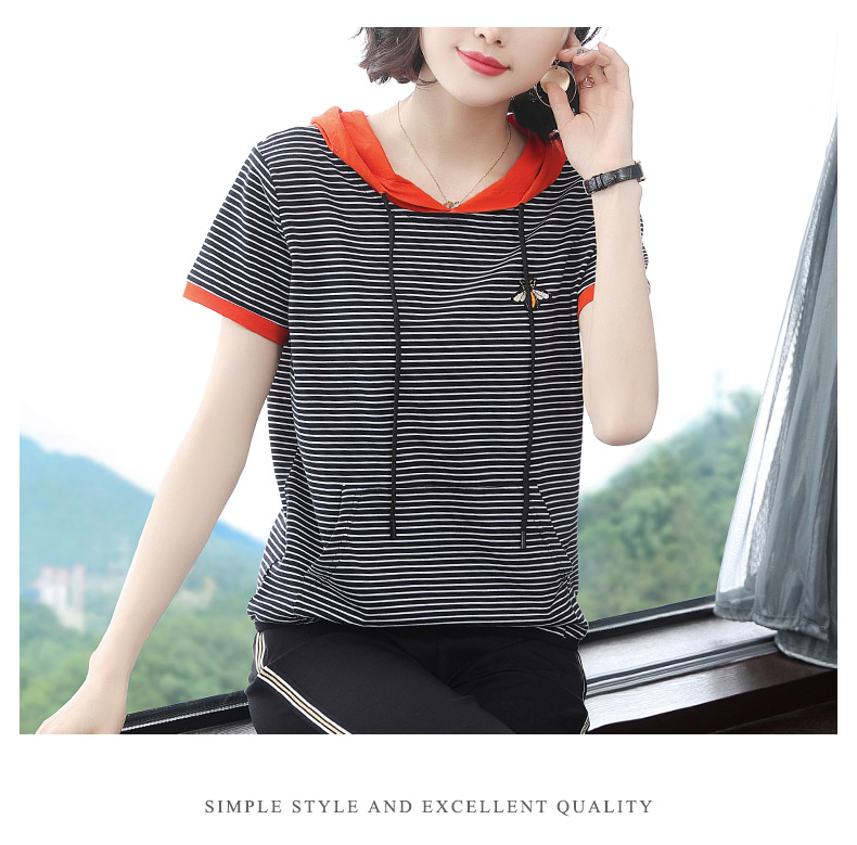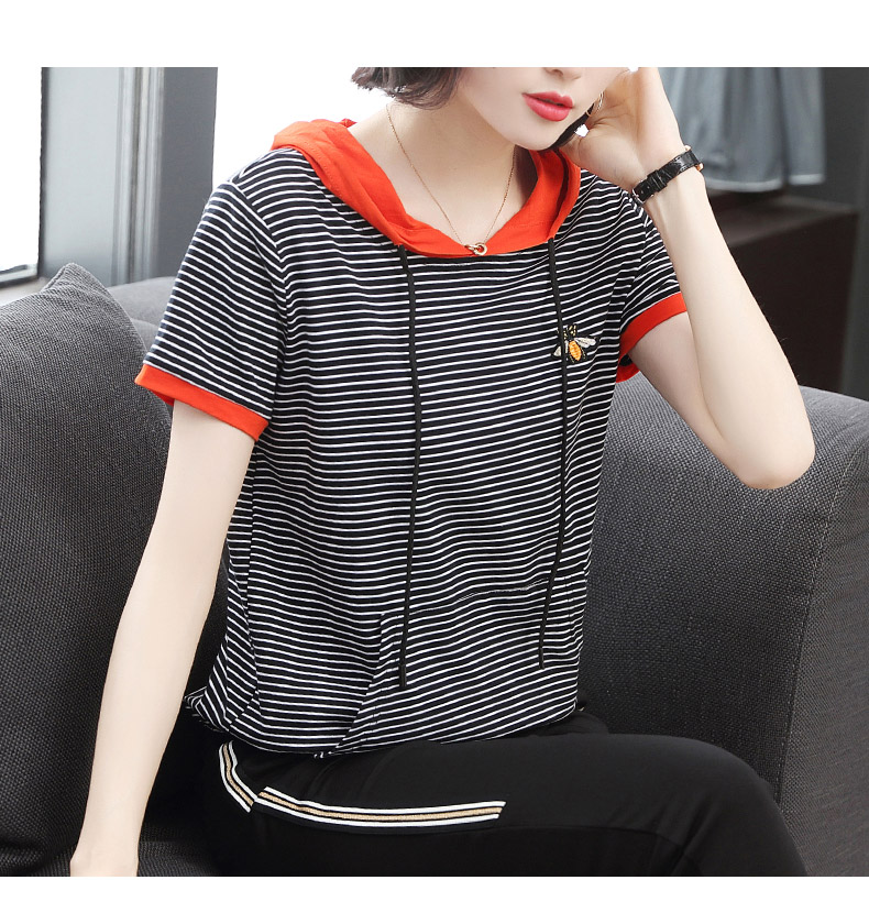 2019夏裝新款上衣服短袖t恤女連帽套頭條紋小衫休閑寬松大碼體恤t