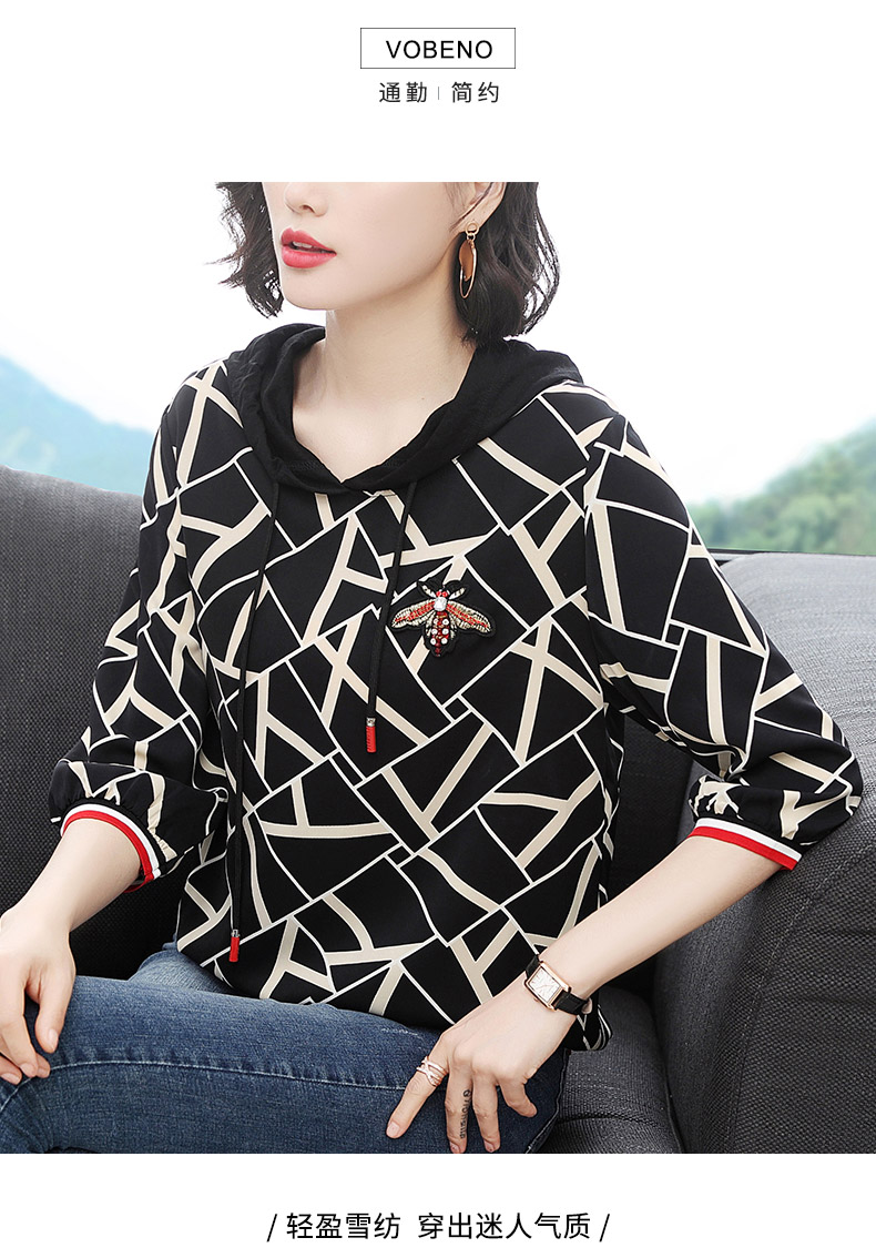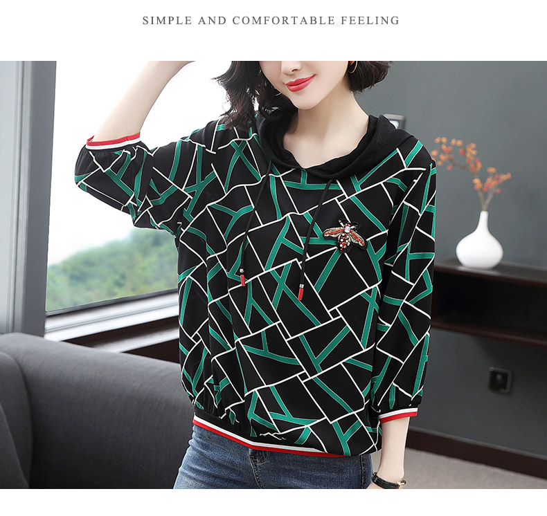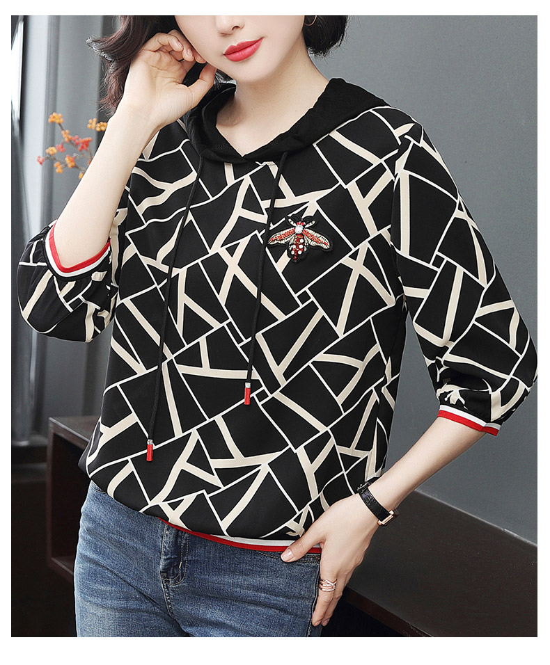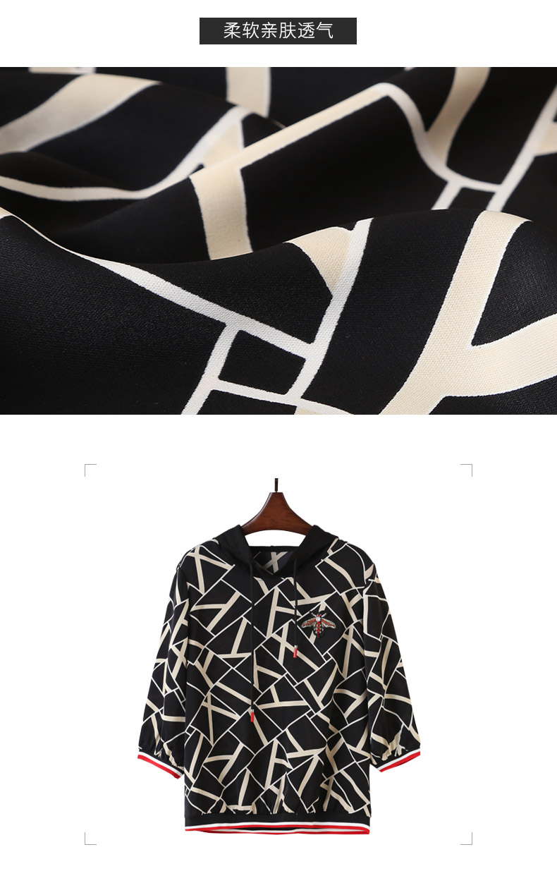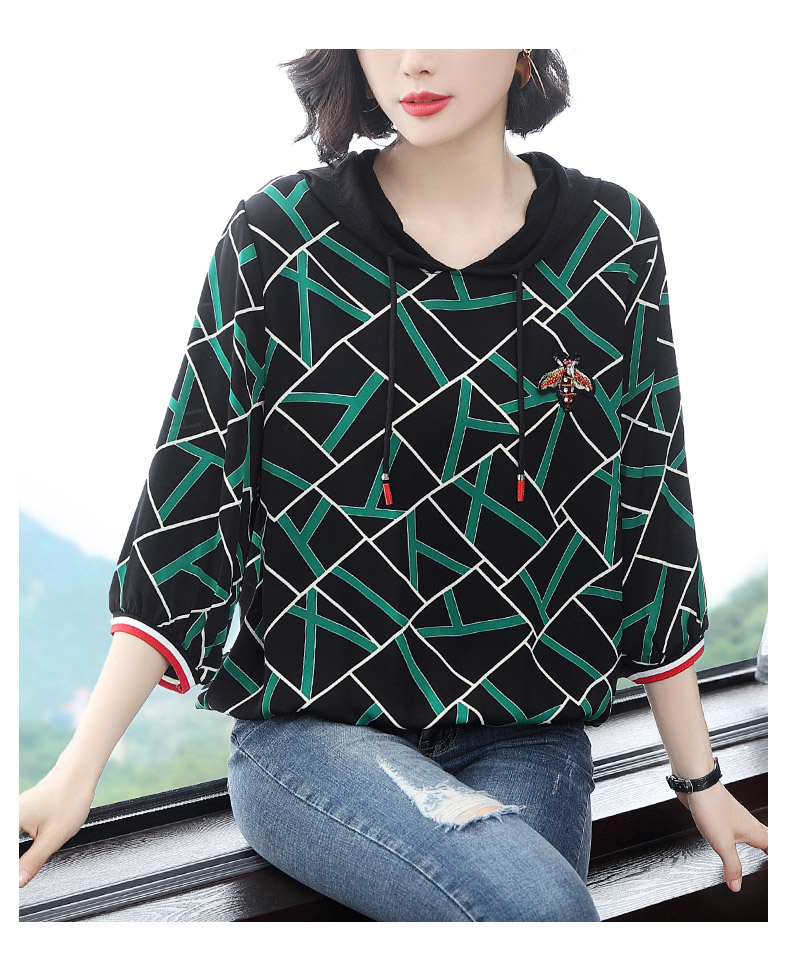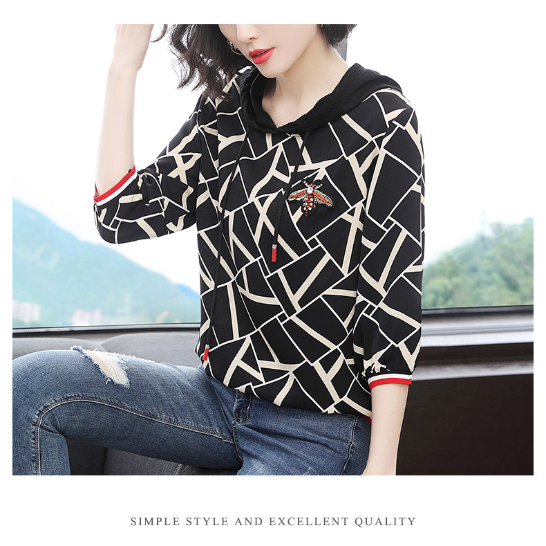 2019春裝新款連帽女t恤七分袖薄款衛衣印花雪紡氣質洋氣小衫上衣