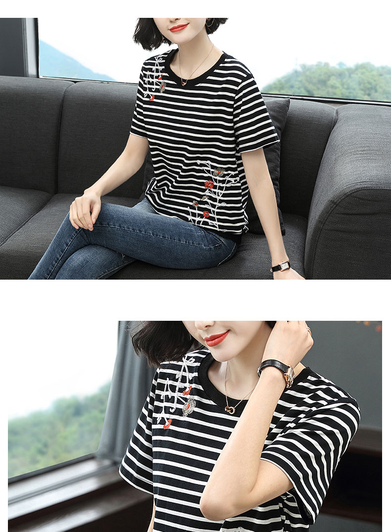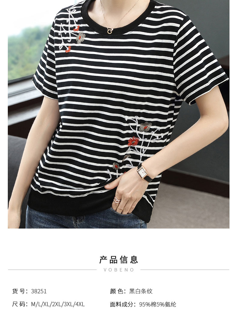2019新款刺繡黑白條紋t恤女短袖寬松圓領體恤半袖上衣打底衫夏季