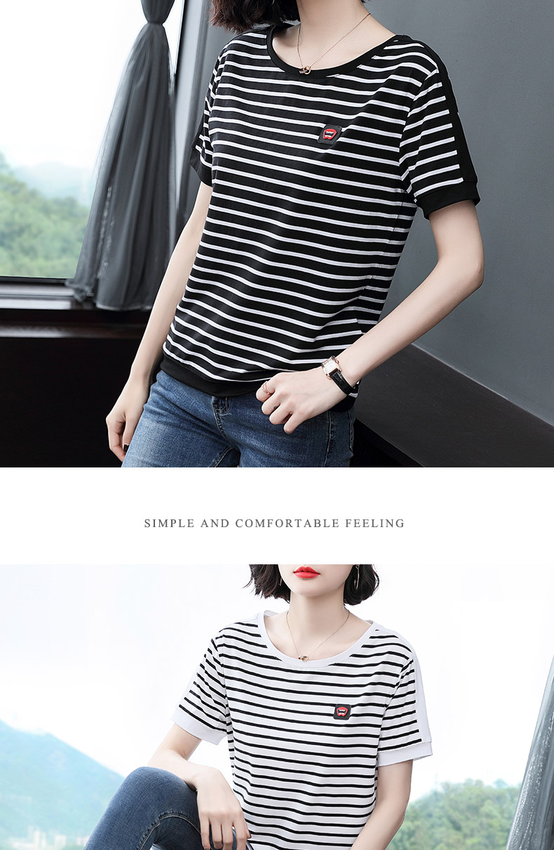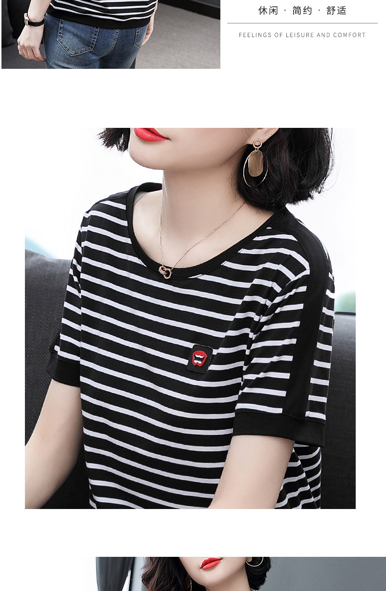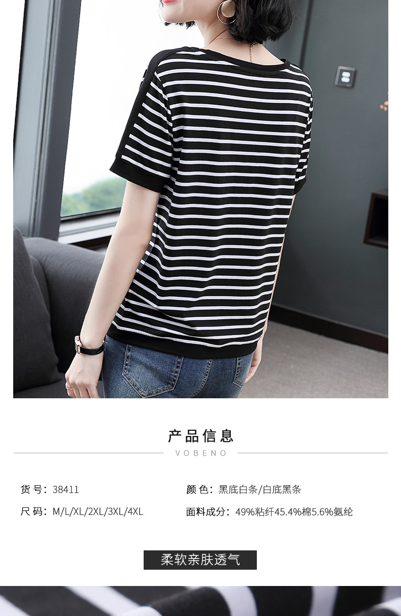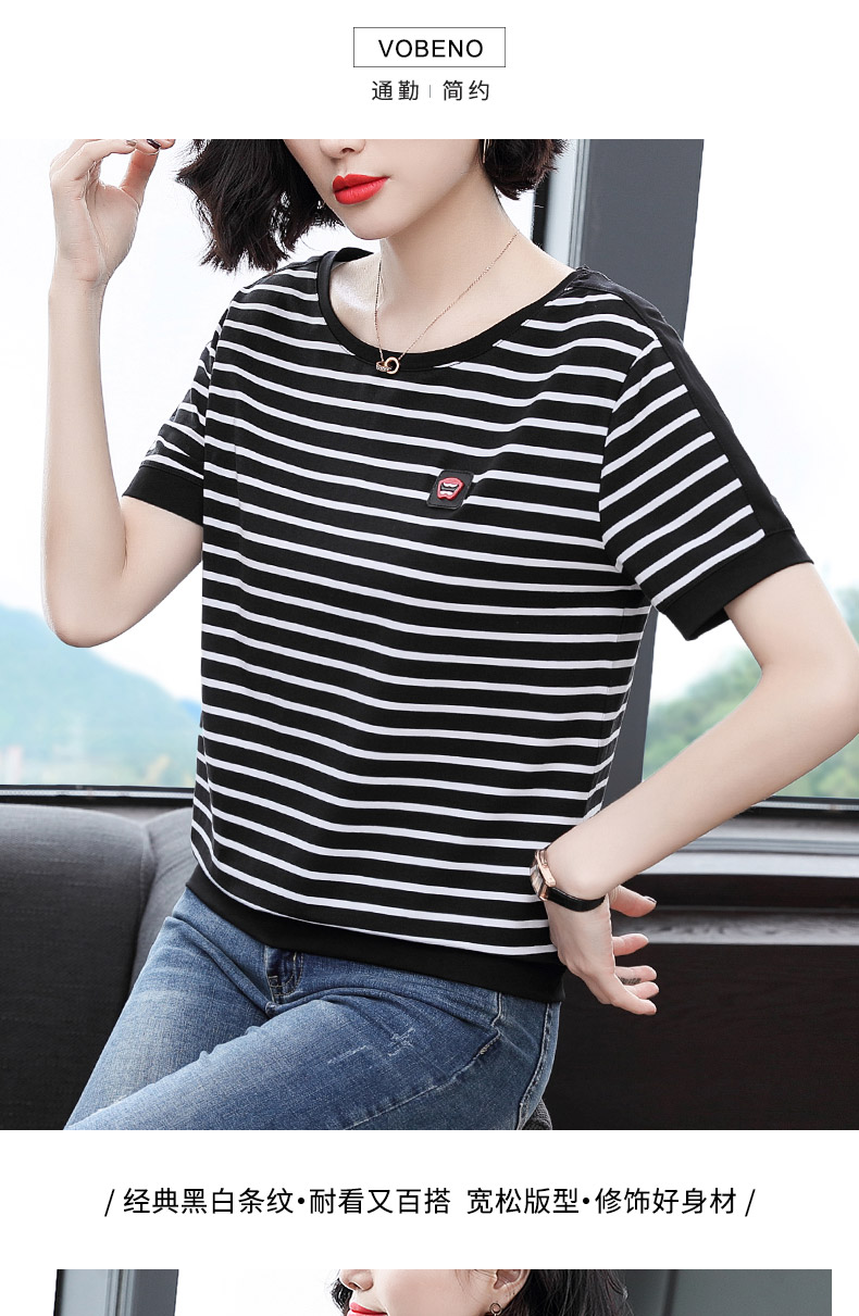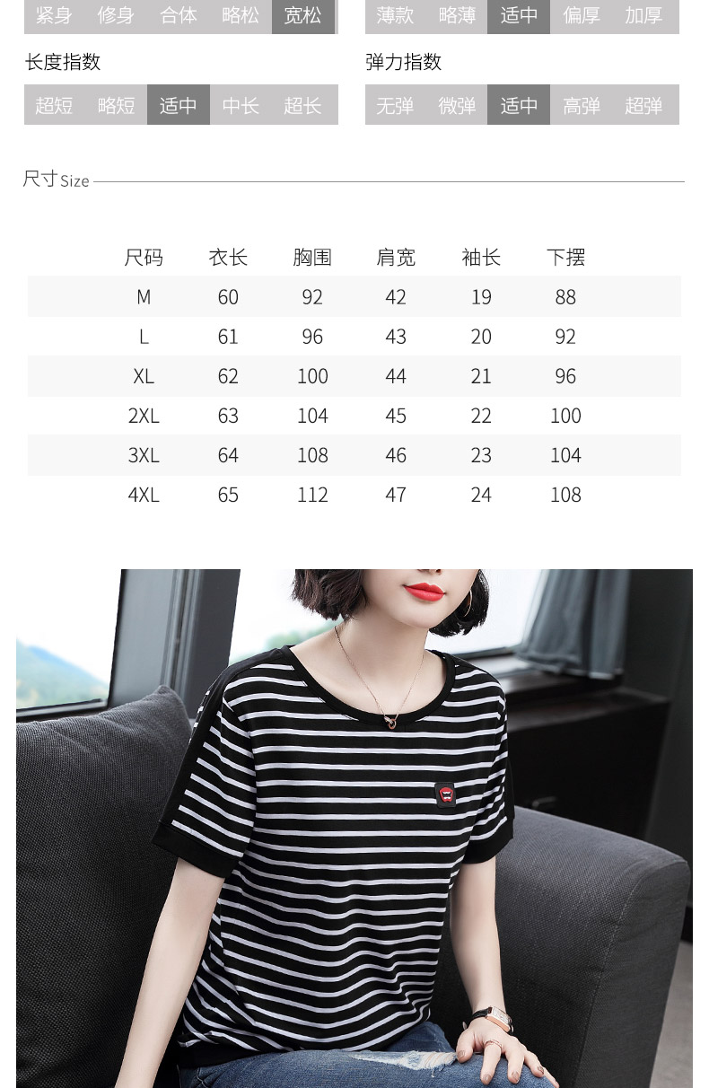 黑白條紋t恤女短袖2019新款夏季寬松大碼體恤打底衫拼接圓領上衣