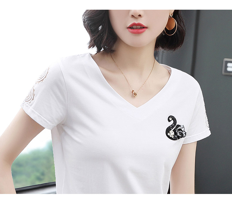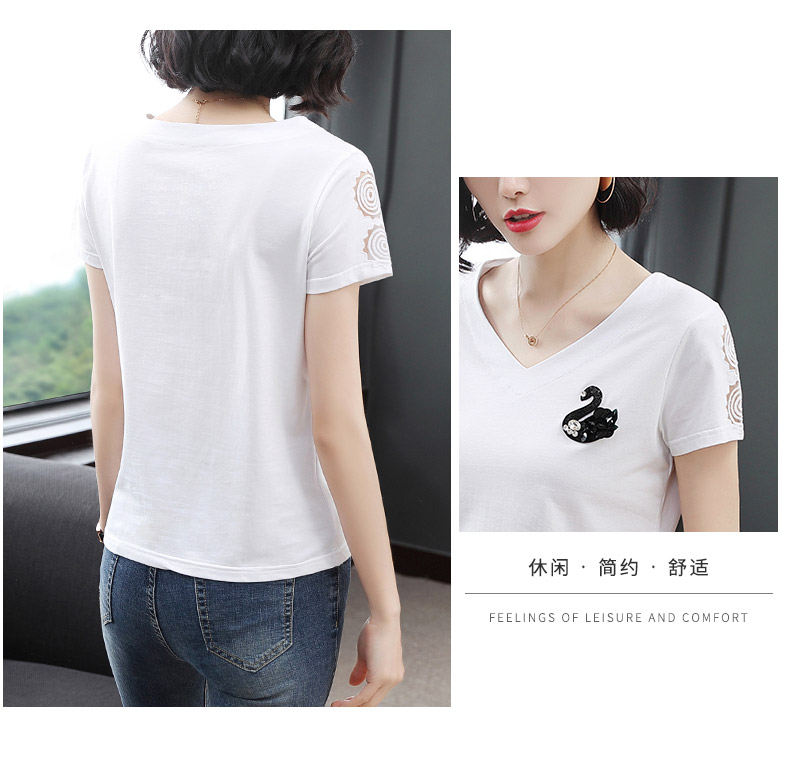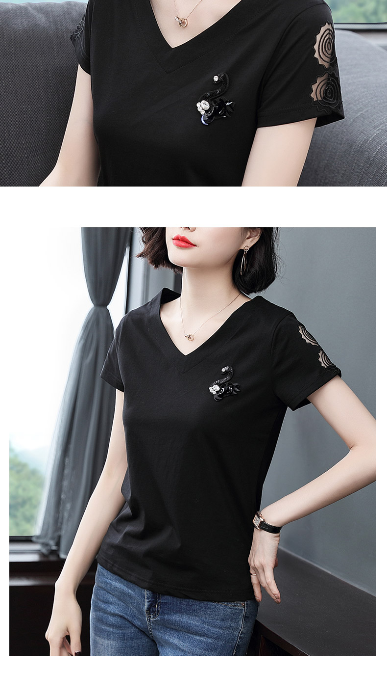 黃色t恤女短袖v領2019新款夏季韓版修身顯瘦鑲鉆體恤半袖上衣女夏